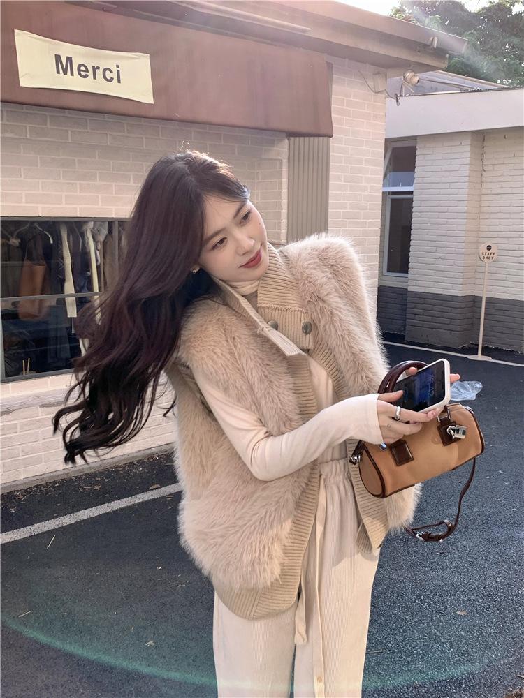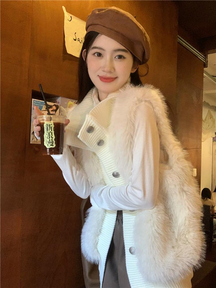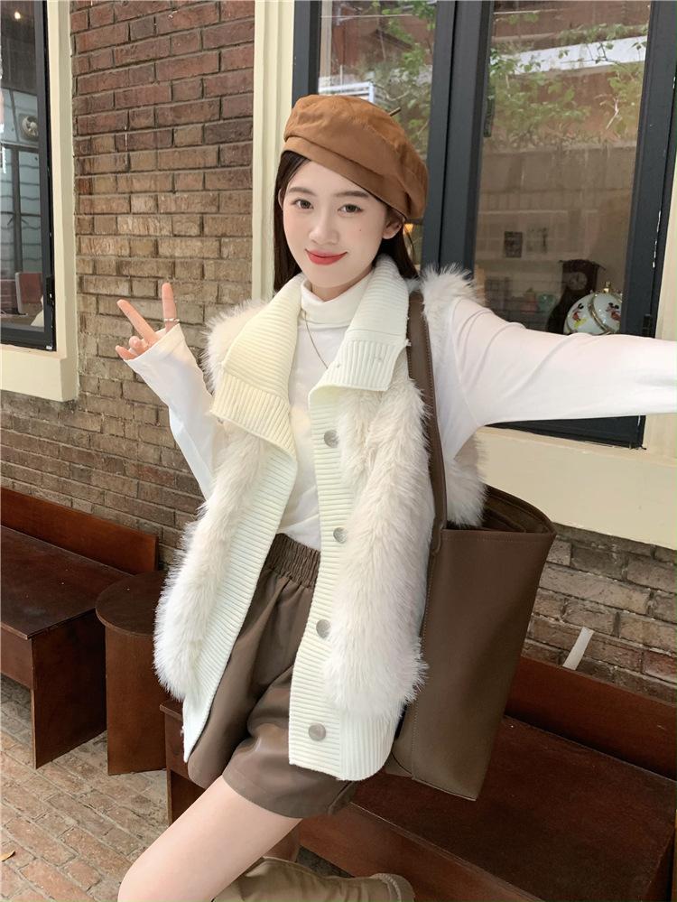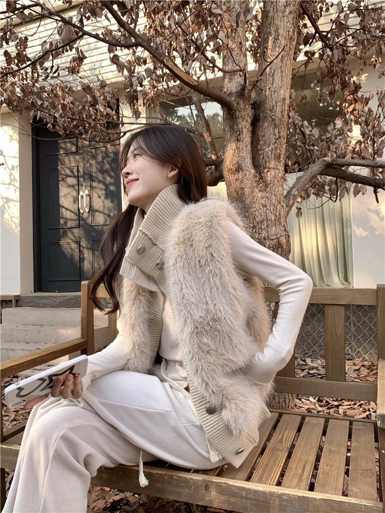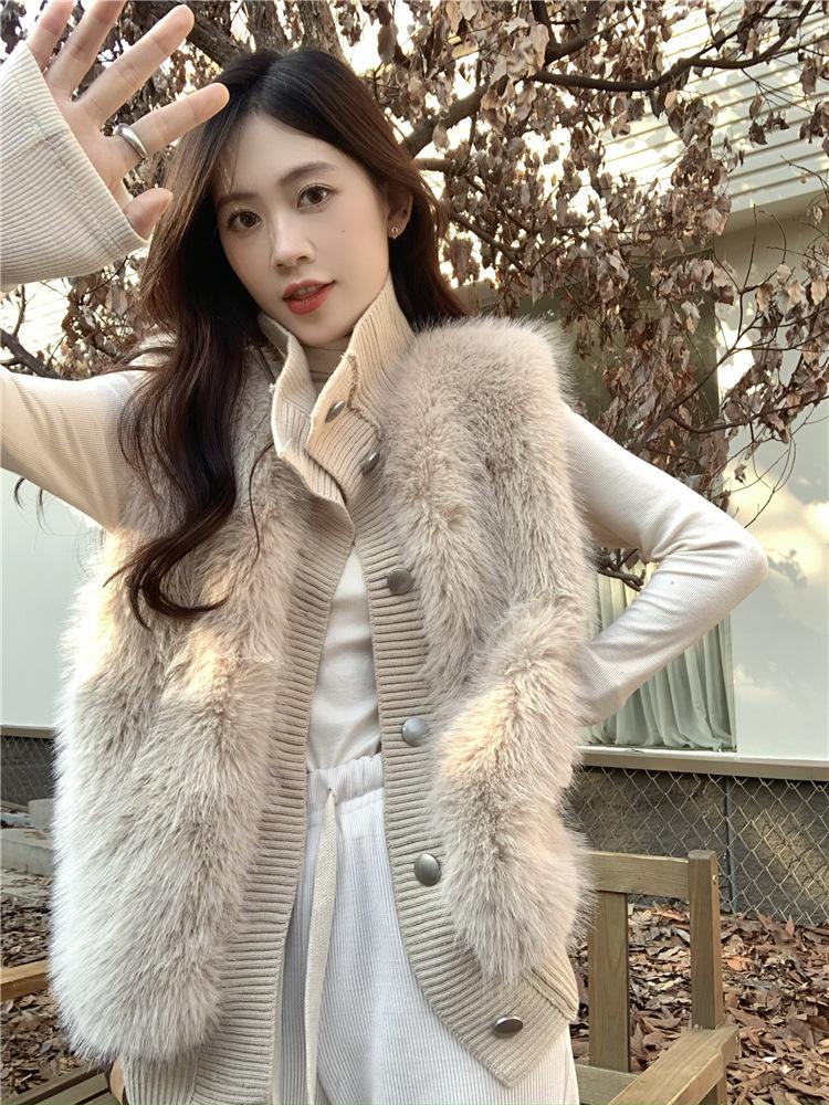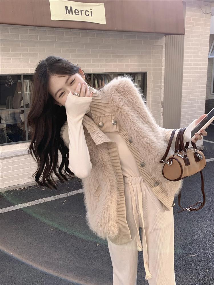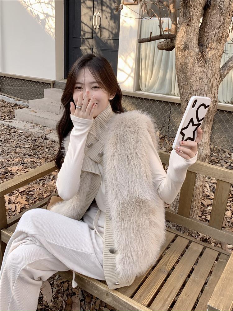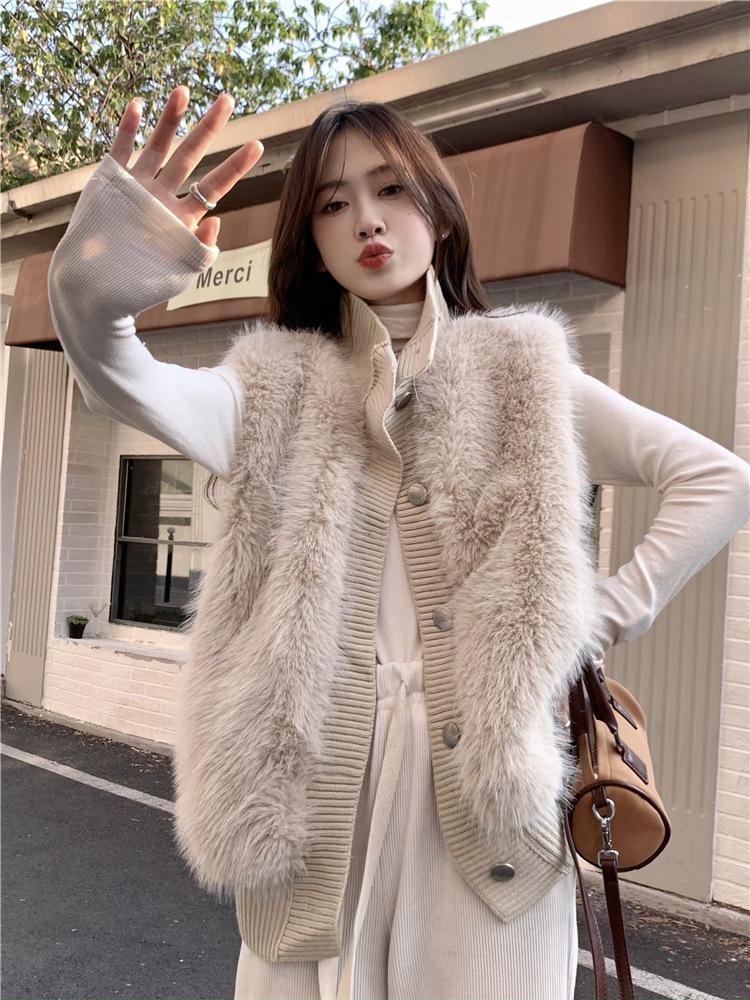 Suéter Sem Mangas com Gola de Pele de Vison Casaco Feminino 2023 Outono e Inverno Novo Estilo Coreano Solto Elegante Cardigã Tricotado