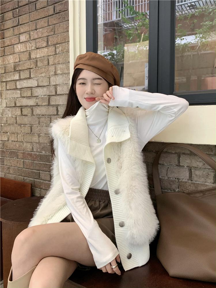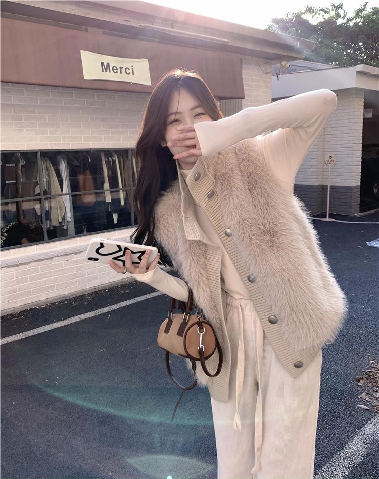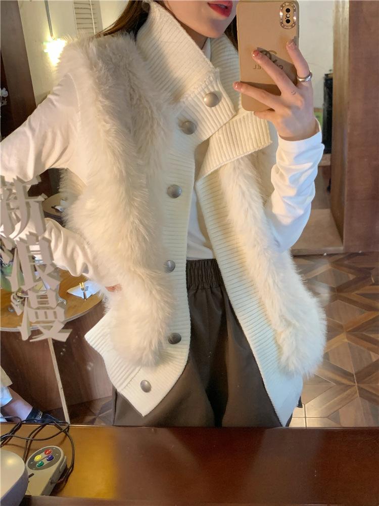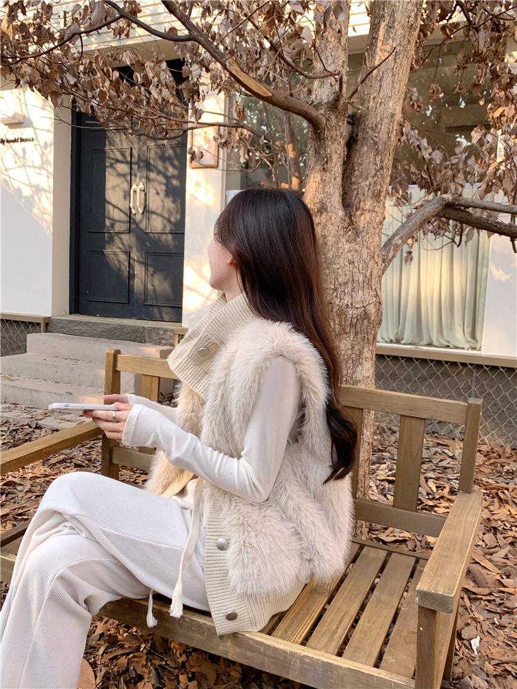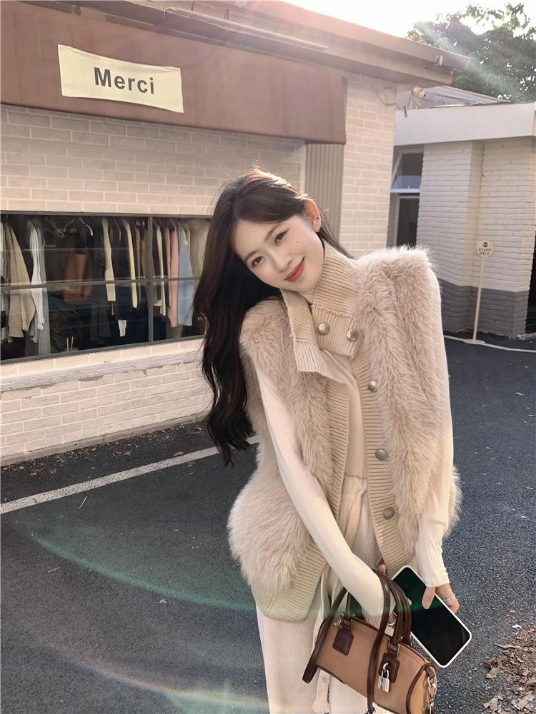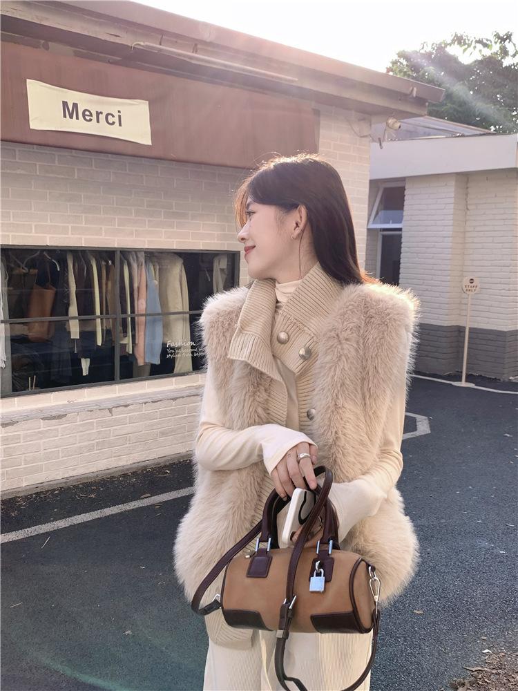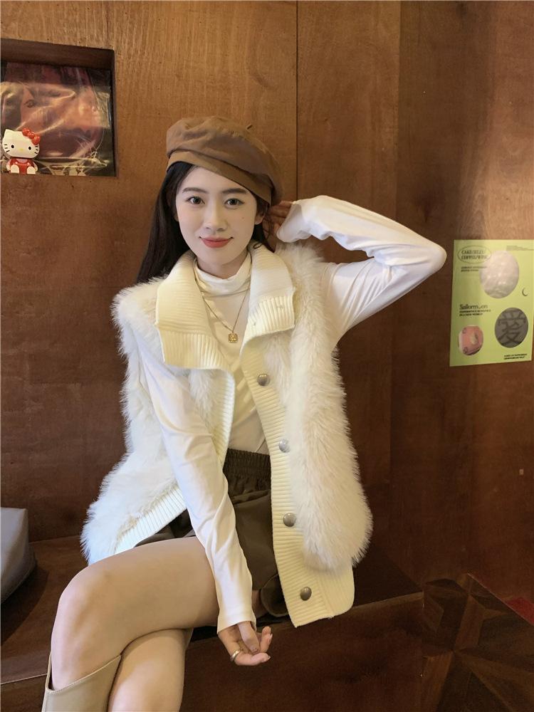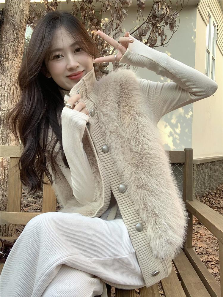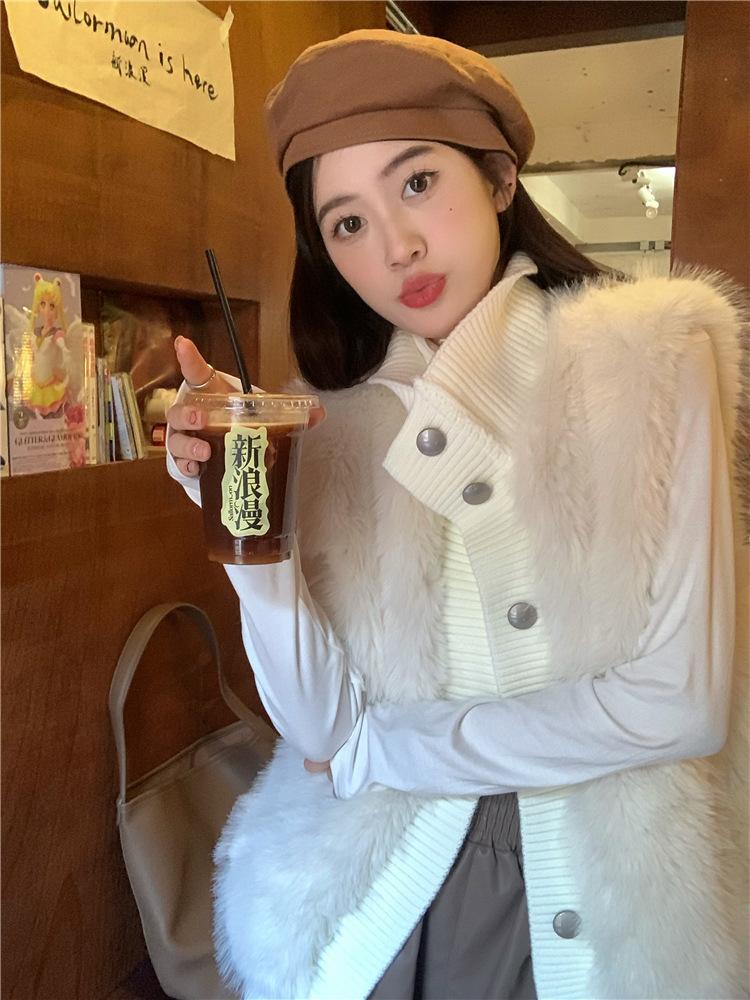 Suéter Sem Mangas com Gola de Pele de Vison Casaco Feminino 2023 Outono e Inverno Novo Estilo Coreano Solto Elegante Cardigã Tricotado
