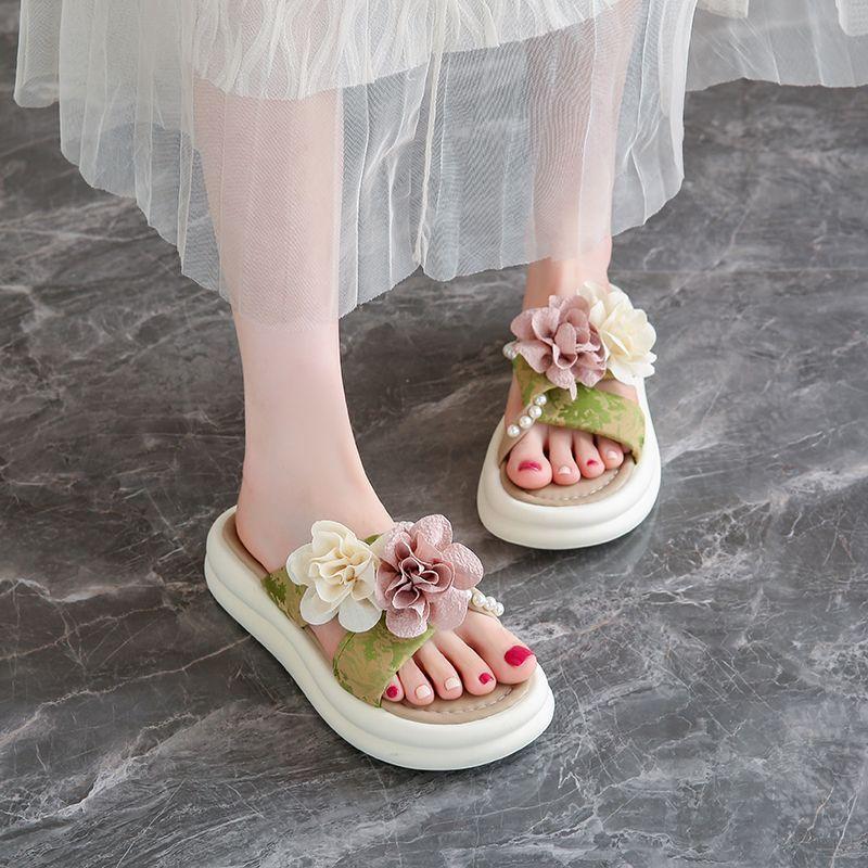 Sandálias Sapatos Femininos Flor Sandálias de Sola Grossa para Uso Externo Sandálias Femininas Saia de Fada Chinelos 2025 Nova Moda Versátil e Confortável