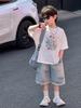 Terno de Verão para Meninos Verão Infantil Estilo Coreano 2025 Novo Estilo Simples Tendência Jeans de Cinco Pontos Manga Curta Infantil