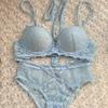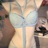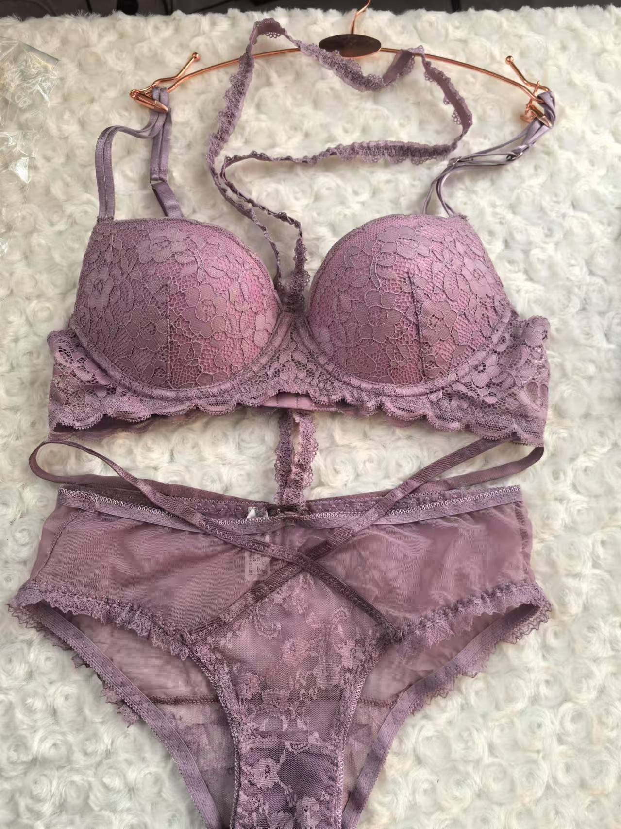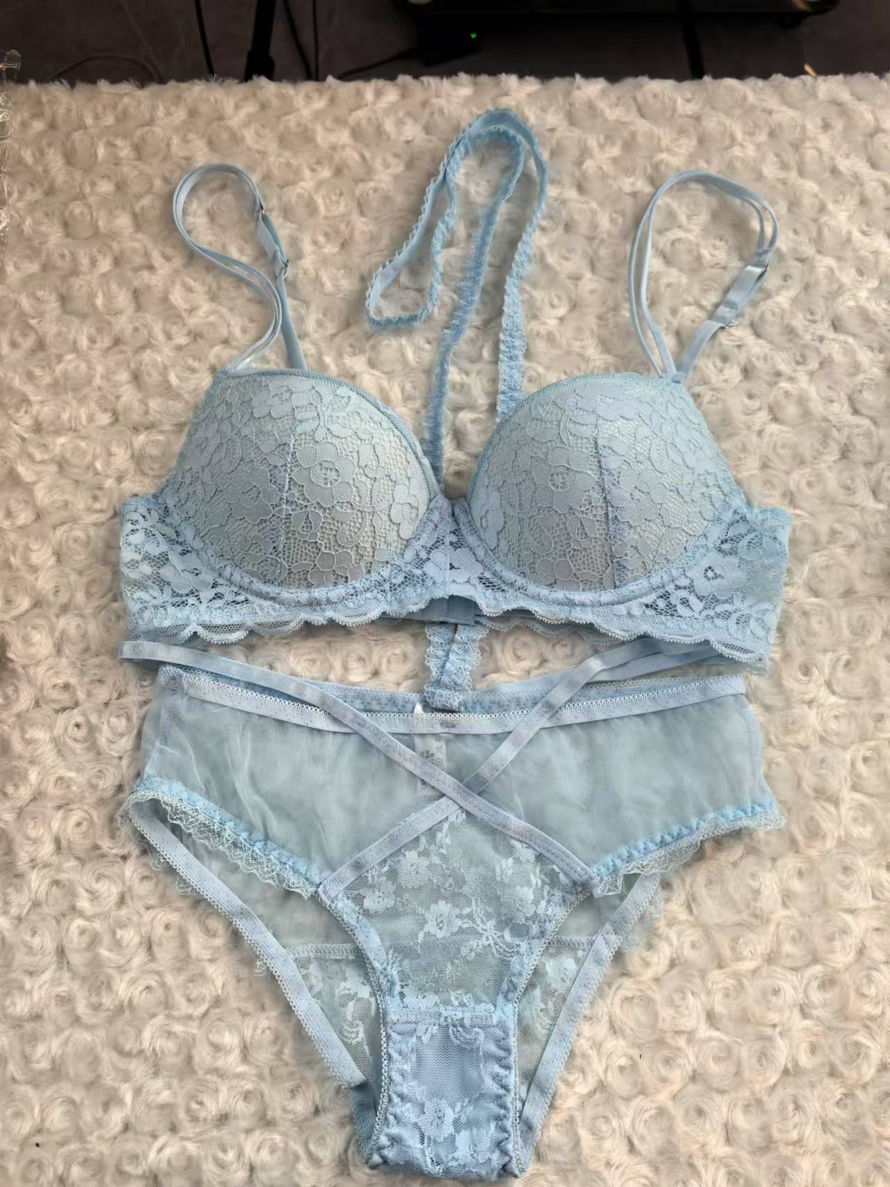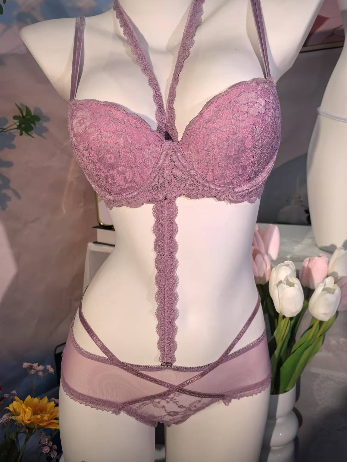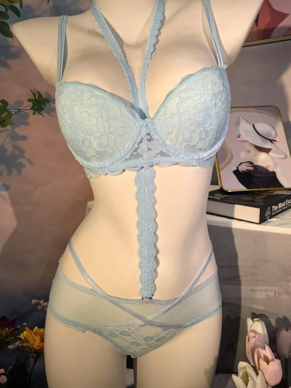 Lingerie Francesa Sexy Renda Decote Halter Alça Fina Aro de Aço Bojo Moldado Push-Up Conjunto de Sutiã Push-Up
