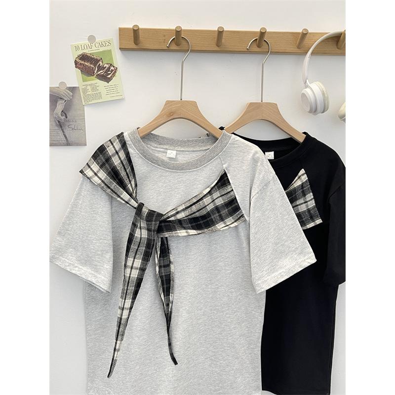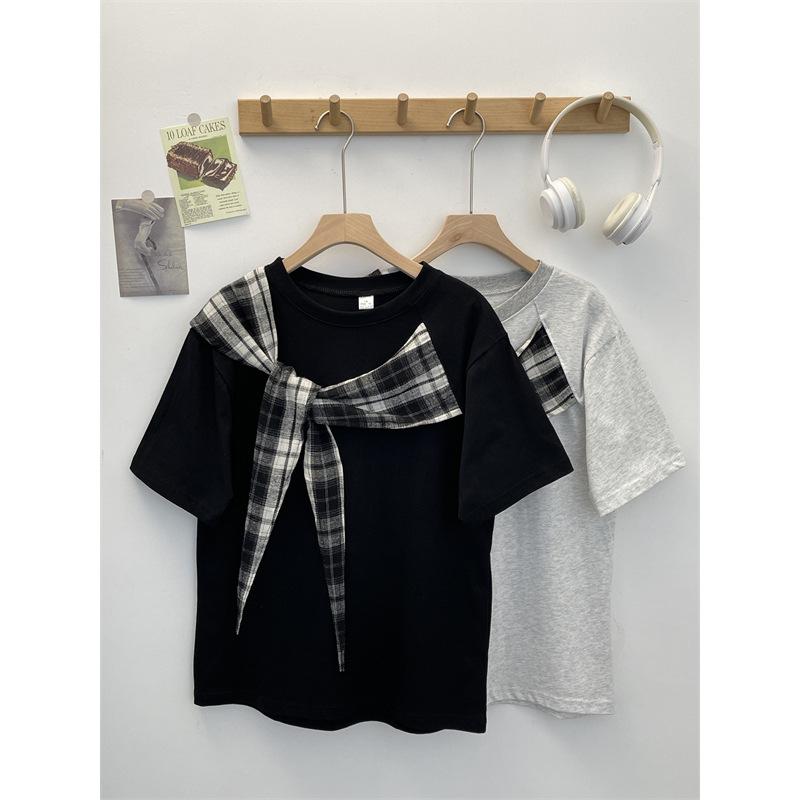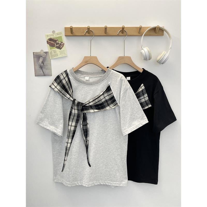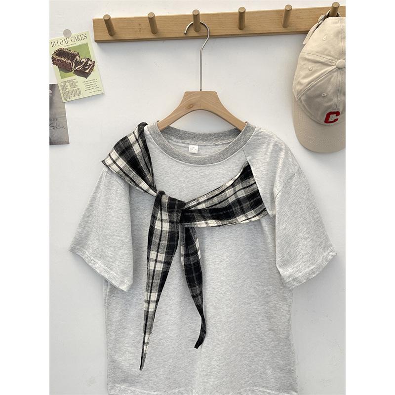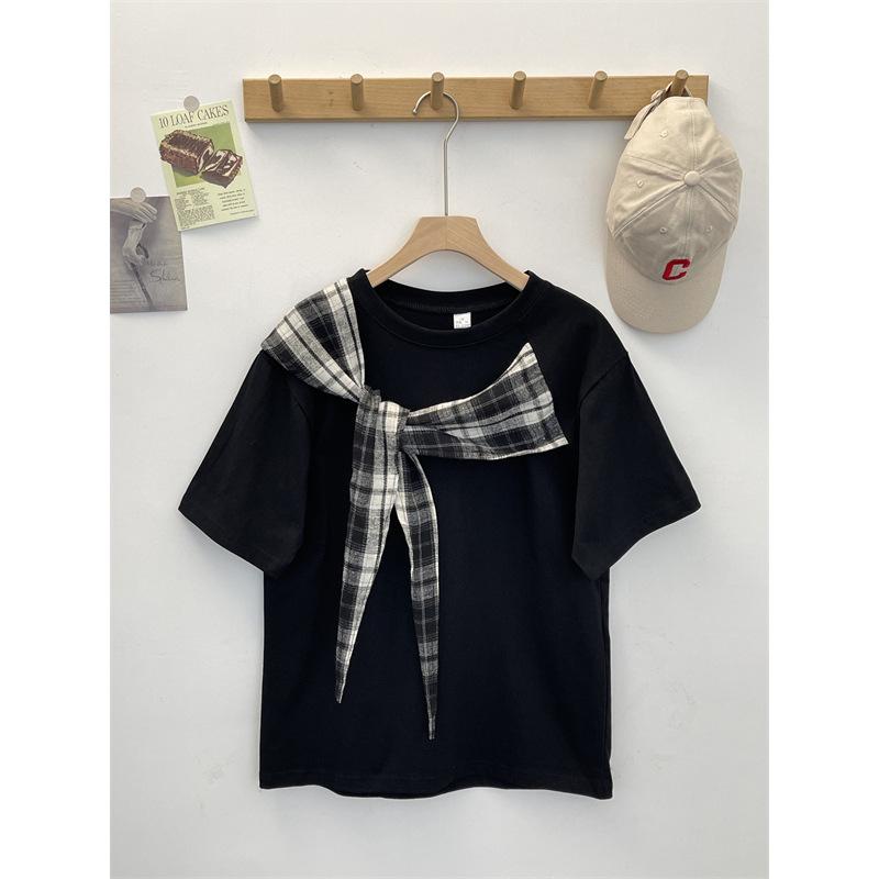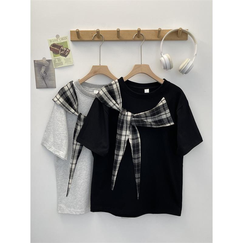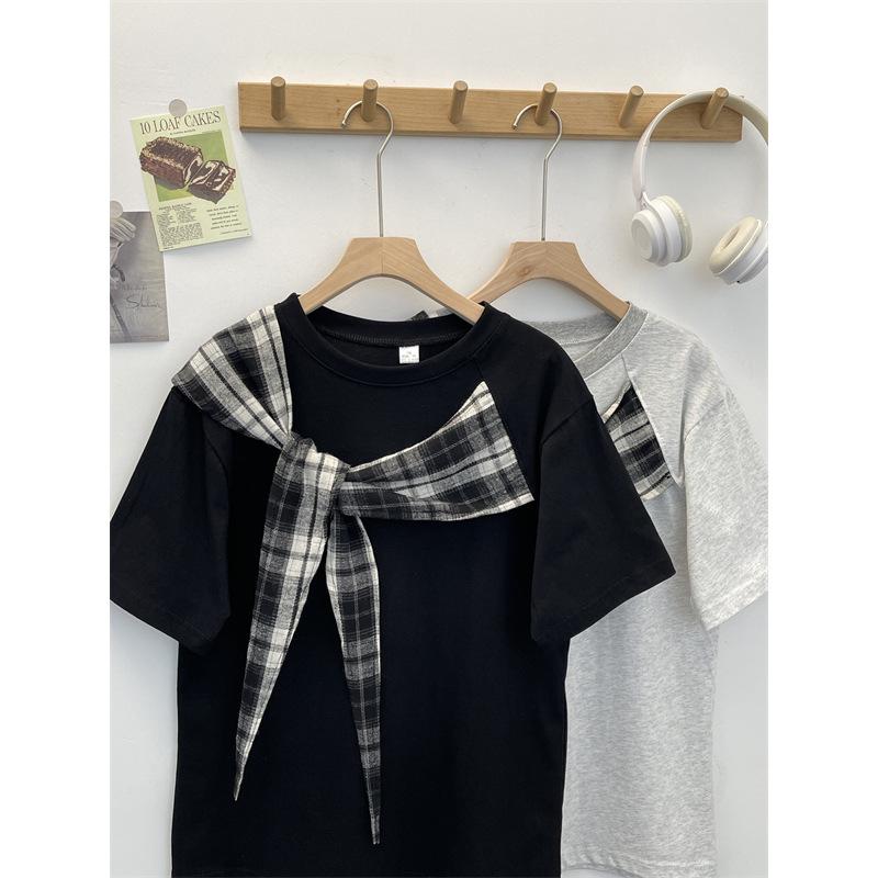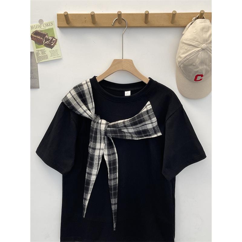 Camiseta Masculina de Manga Curta com Laço Xadrez Americano Verão Design Solto Nicho High-End Top Masculino de Meia Manga