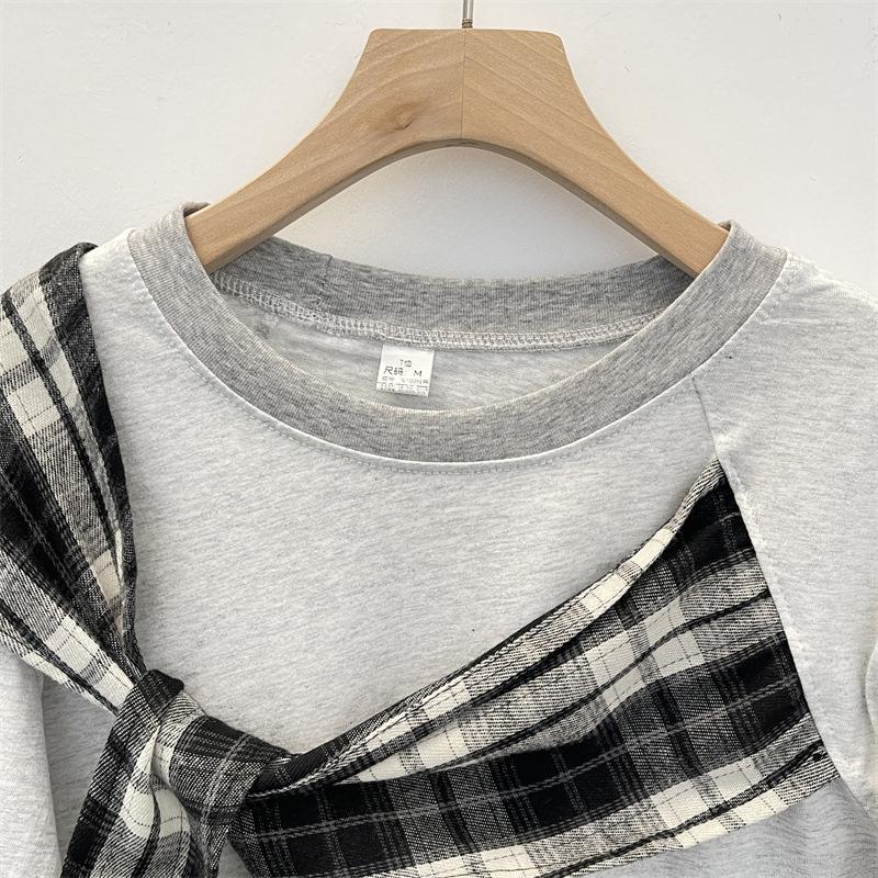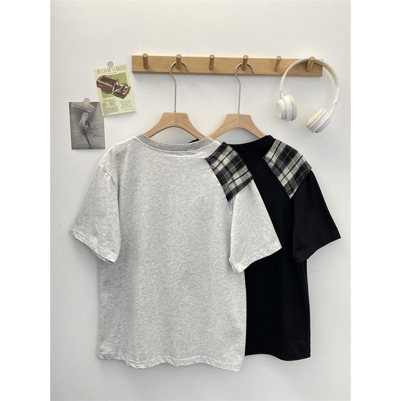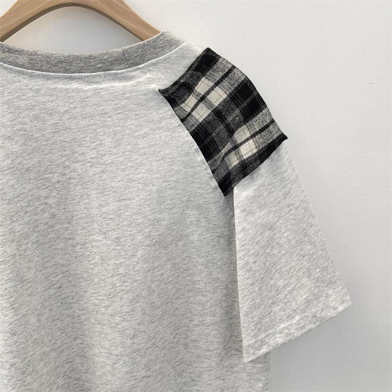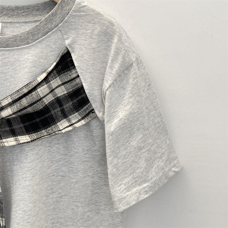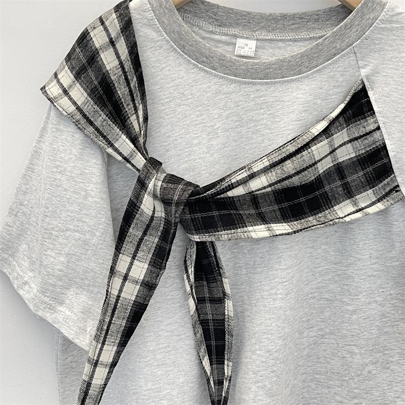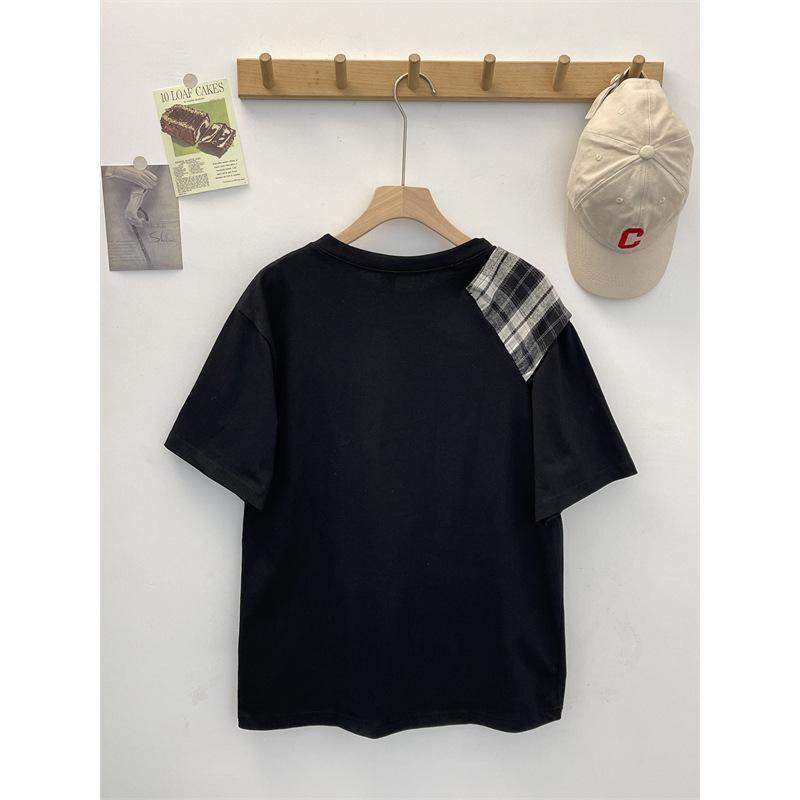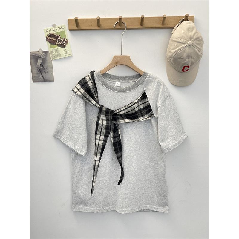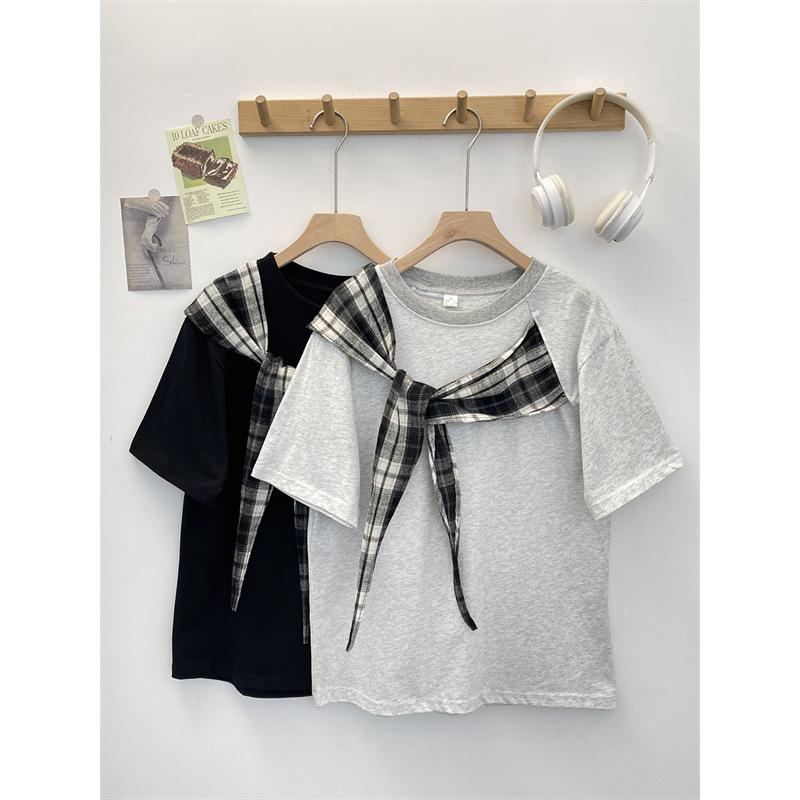 Camiseta Masculina de Manga Curta com Laço Xadrez Americano Verão Design Solto Nicho High-End Top Masculino de Meia Manga