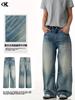 Calça Jeans Reta Azul Lavado Americano 11Kn para Homens e Mulheres Retrô Desgastada Bigodes Solta Casual Slim Perna Larga
