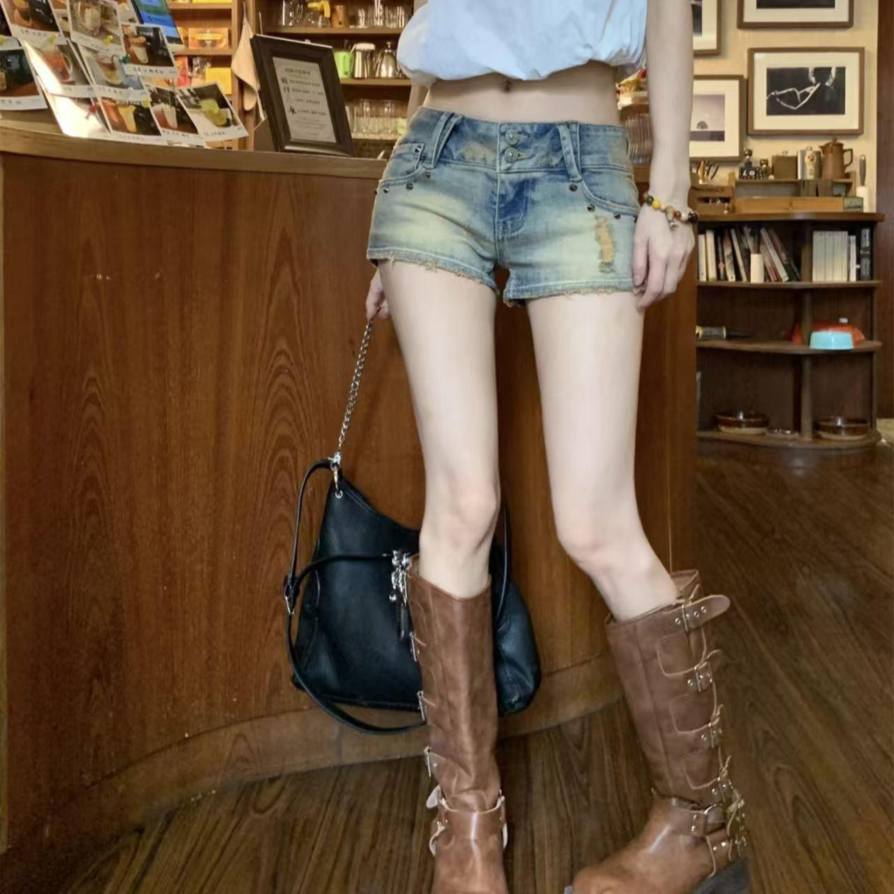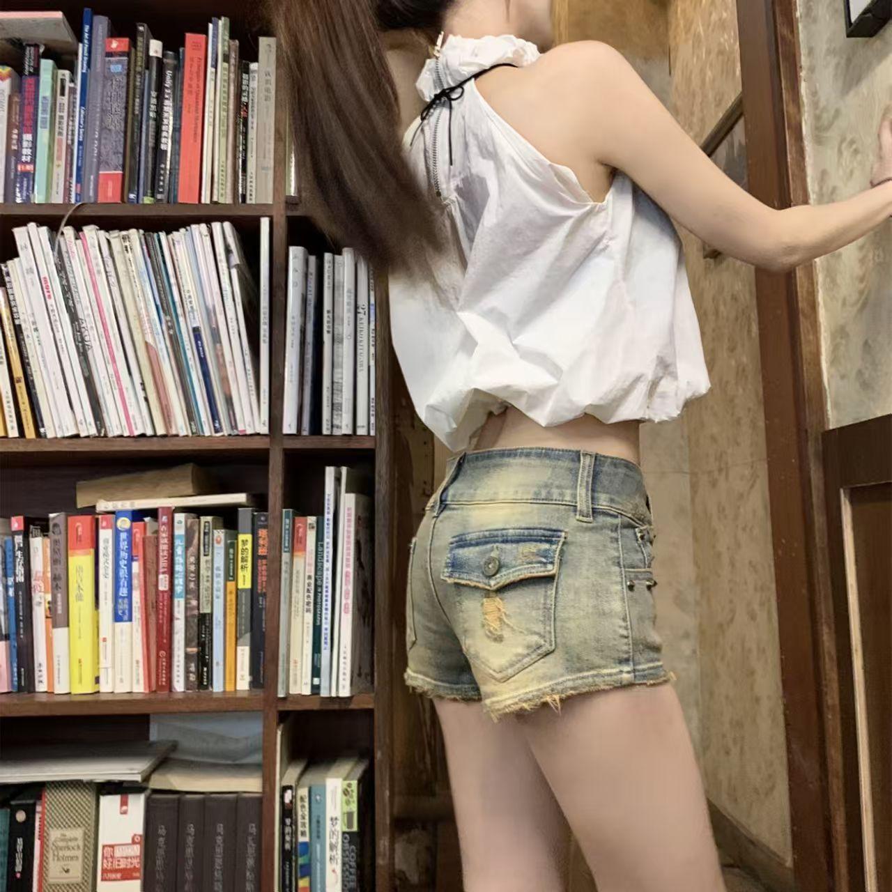 2025 Nova Moda Verão Feminina Fina Americana Cintura Baixa Elástica Slim Lavado Shorts Jeans Hot Pants Tendência