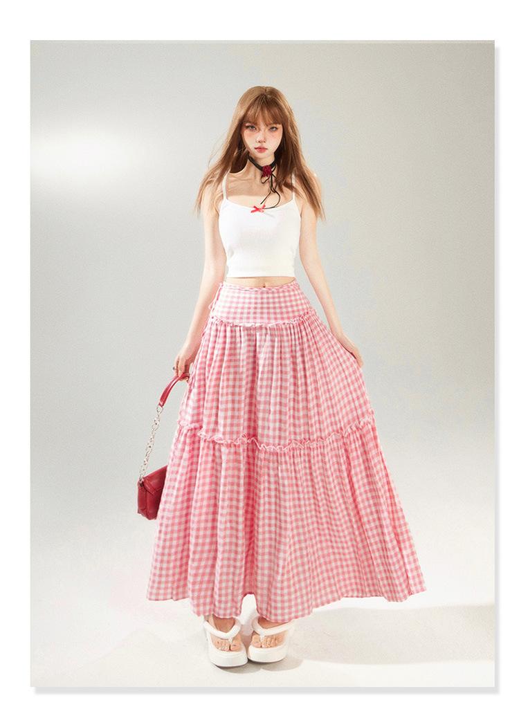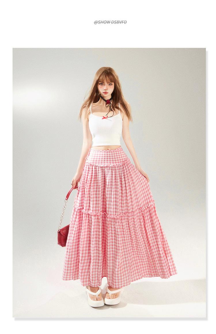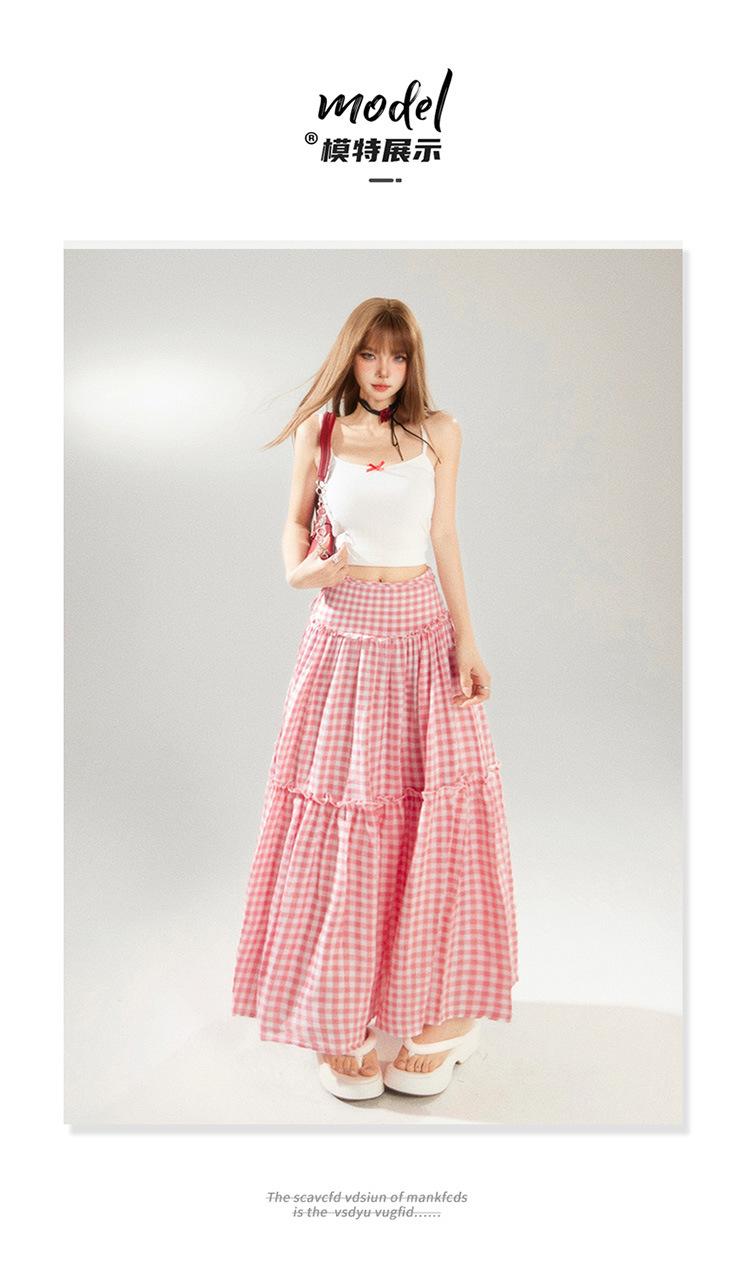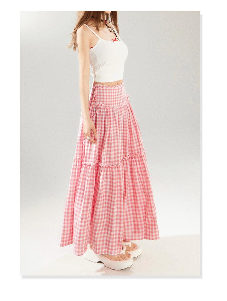 YC & Saia Plissada Bufante com Costura de Cintura Alta Retrô Saia A-line Xadrez Rosa Versátil Casual Saia Longa Primavera e Verão