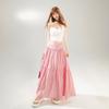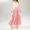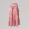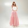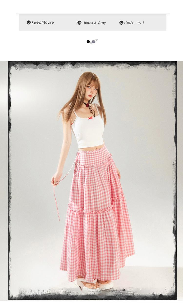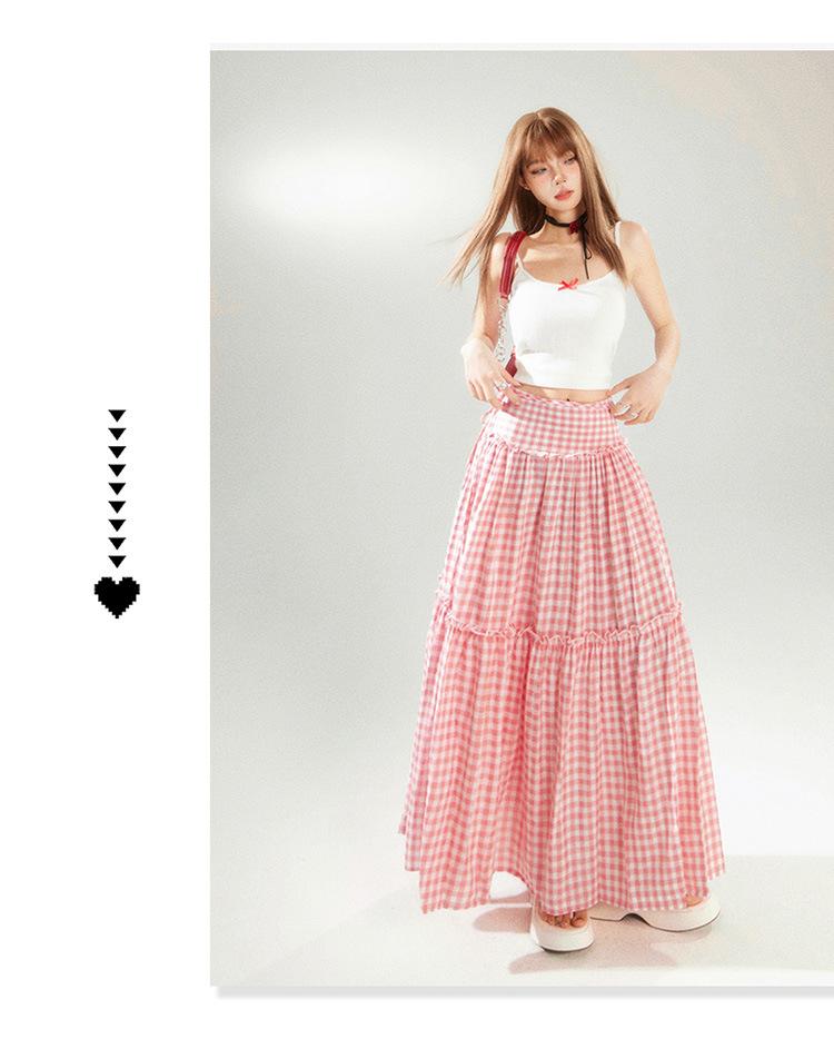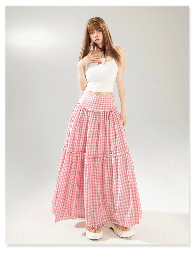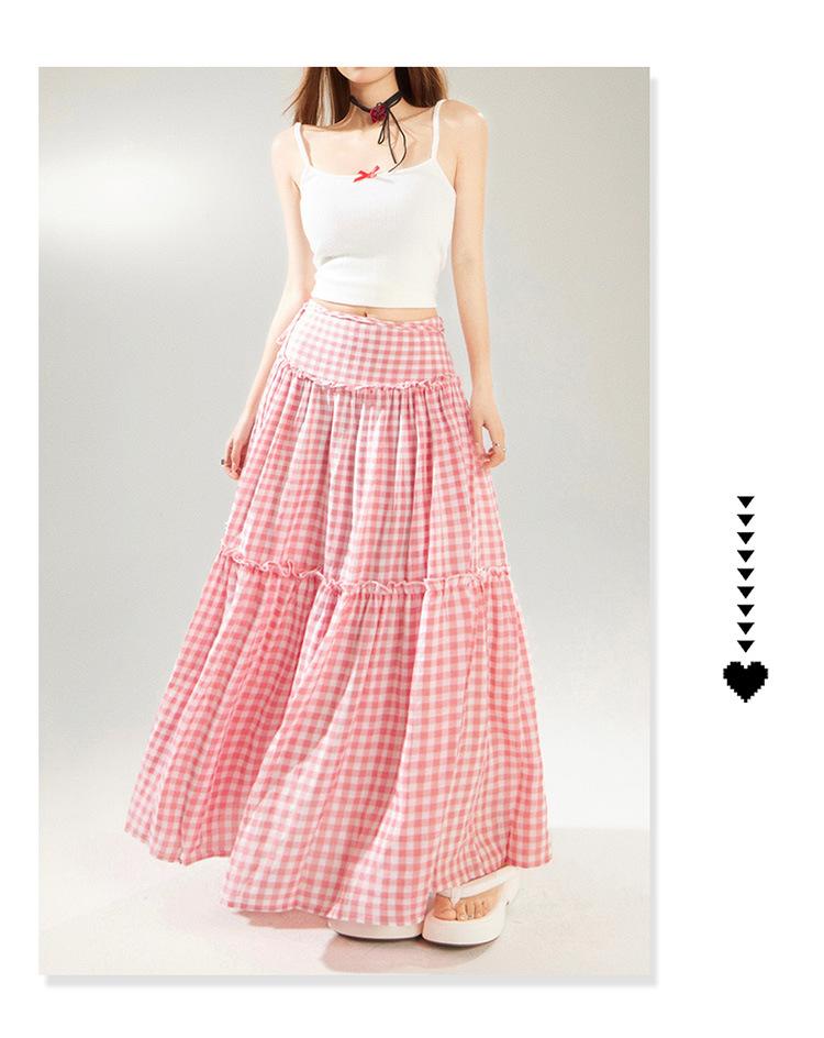 YC & Saia Plissada Bufante com Costura de Cintura Alta Retrô Saia A-line Xadrez Rosa Versátil Casual Saia Longa Primavera e Verão