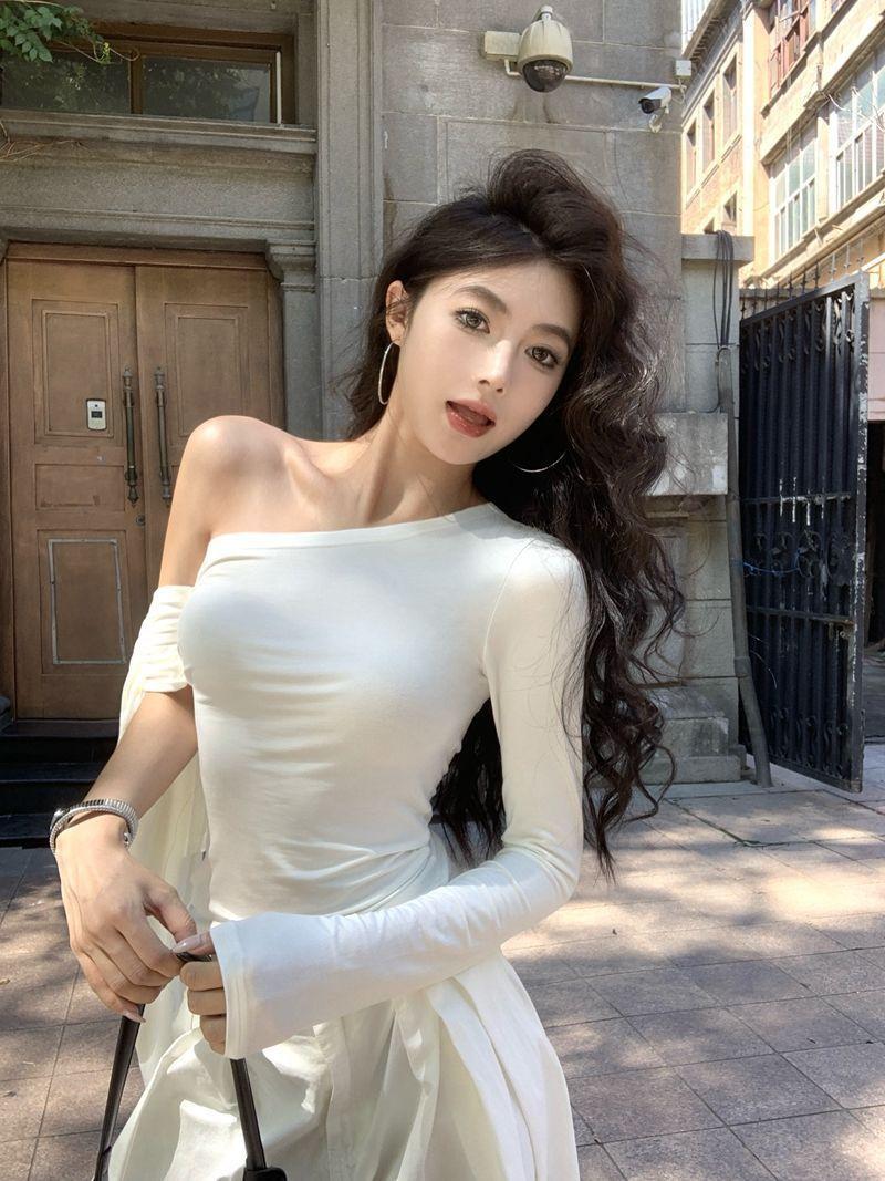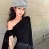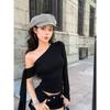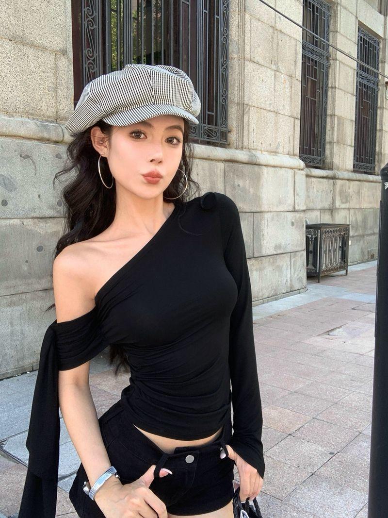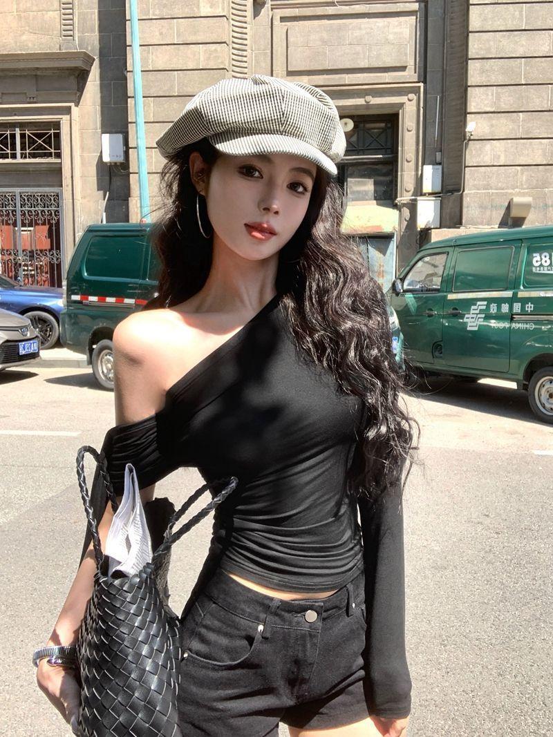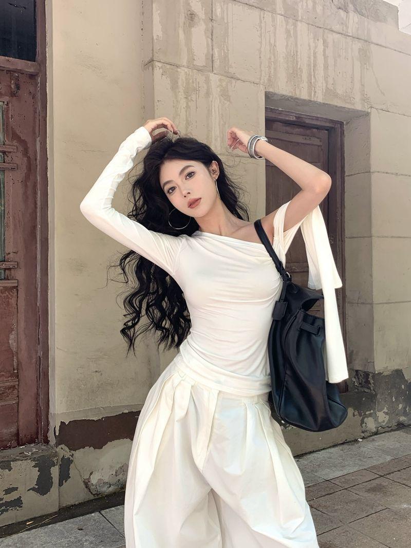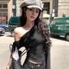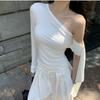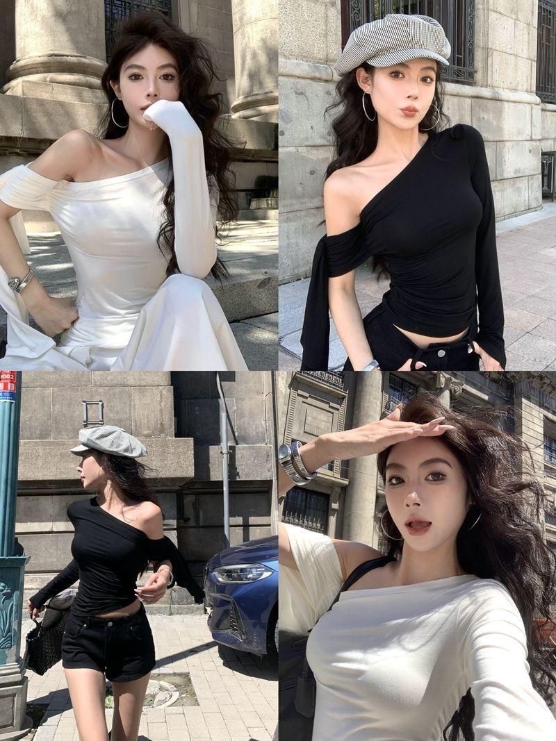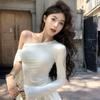 Estilo Garota Quente Assimétrico Ombro Inclinado Top de Fita Roupas Âncora Femininas Design de Nicho Desejo Puro Camiseta de Manga Longa com Ombro Descoberto