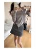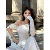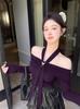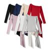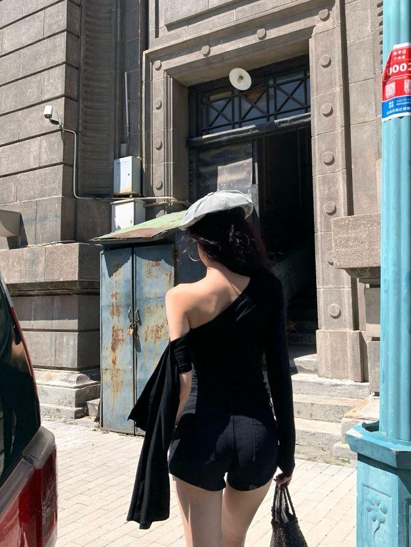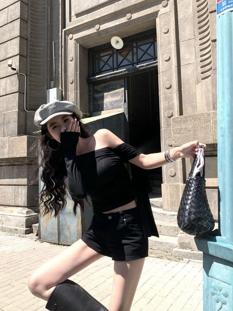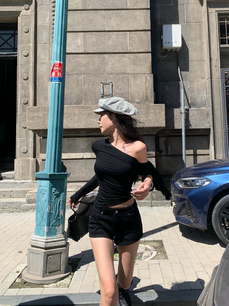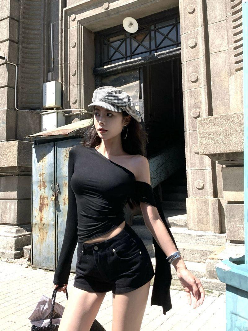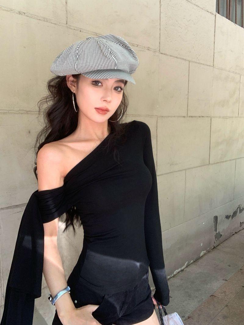 Estilo Garota Quente Assimétrico Ombro Inclinado Top de Fita Roupas Âncora Femininas Design de Nicho Desejo Puro Camiseta de Manga Longa com Ombro Descoberto