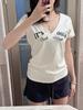 Camiseta Estilo Garota Quente Decote V Manga Curta para Mulheres Verão 2025 Nova Puro Desejo Ombro Direito Look Emagrecedor Cintura Justa Top Tendência