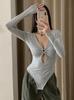 Estilo Europeu e Americano Sexy Decote Profundo em V Design Sensação Vazado Top Spice Girl Macacão de Manga Comprida Camiseta Feminina de Manga Curta para Usar por Baixo