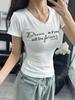 Camiseta Feminina Americana Hot Girl Decote V Estampada com Letras Manga Curta para Mulheres 2025 Verão Nova Puro Desejo Look Emagrecedor e Top Elegante