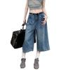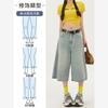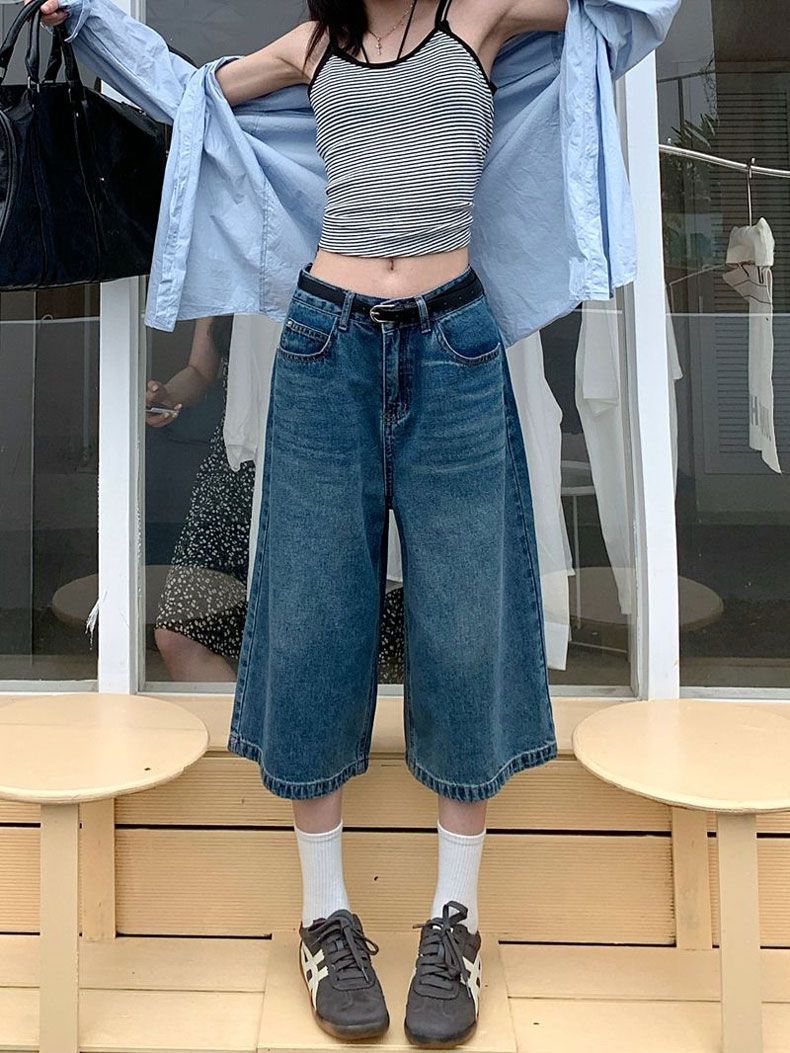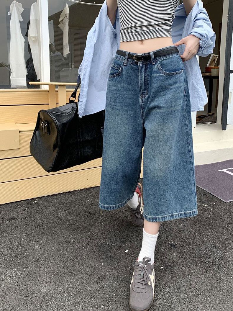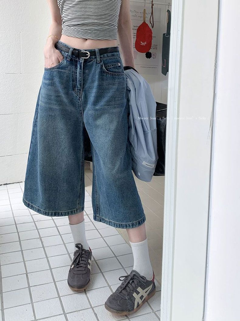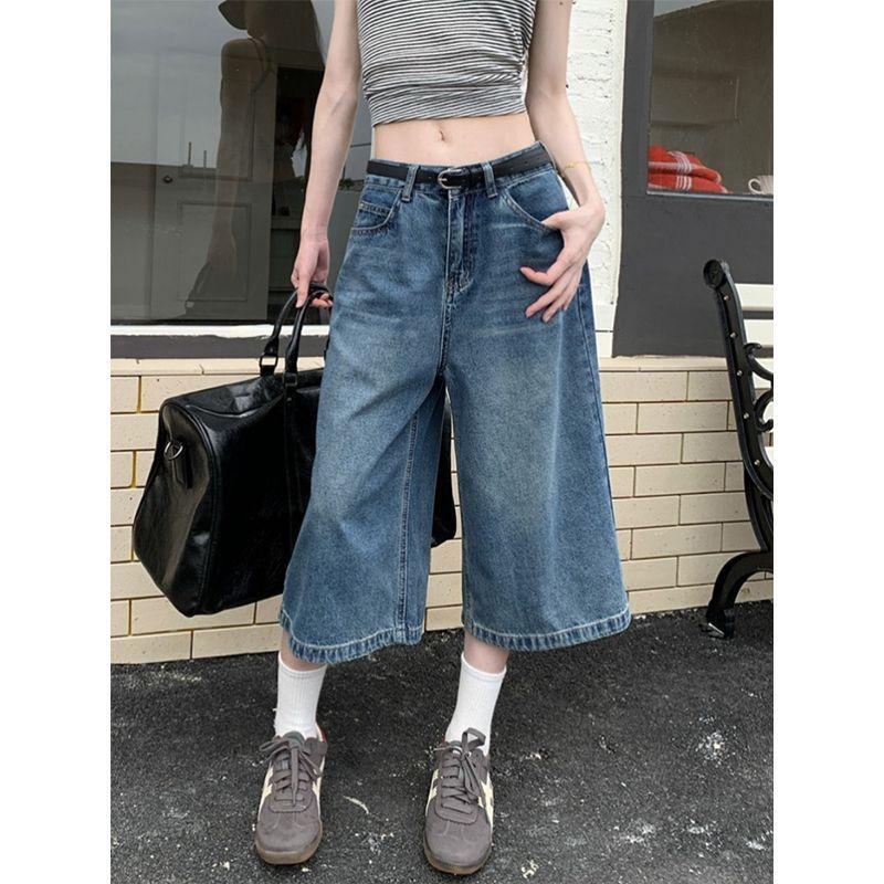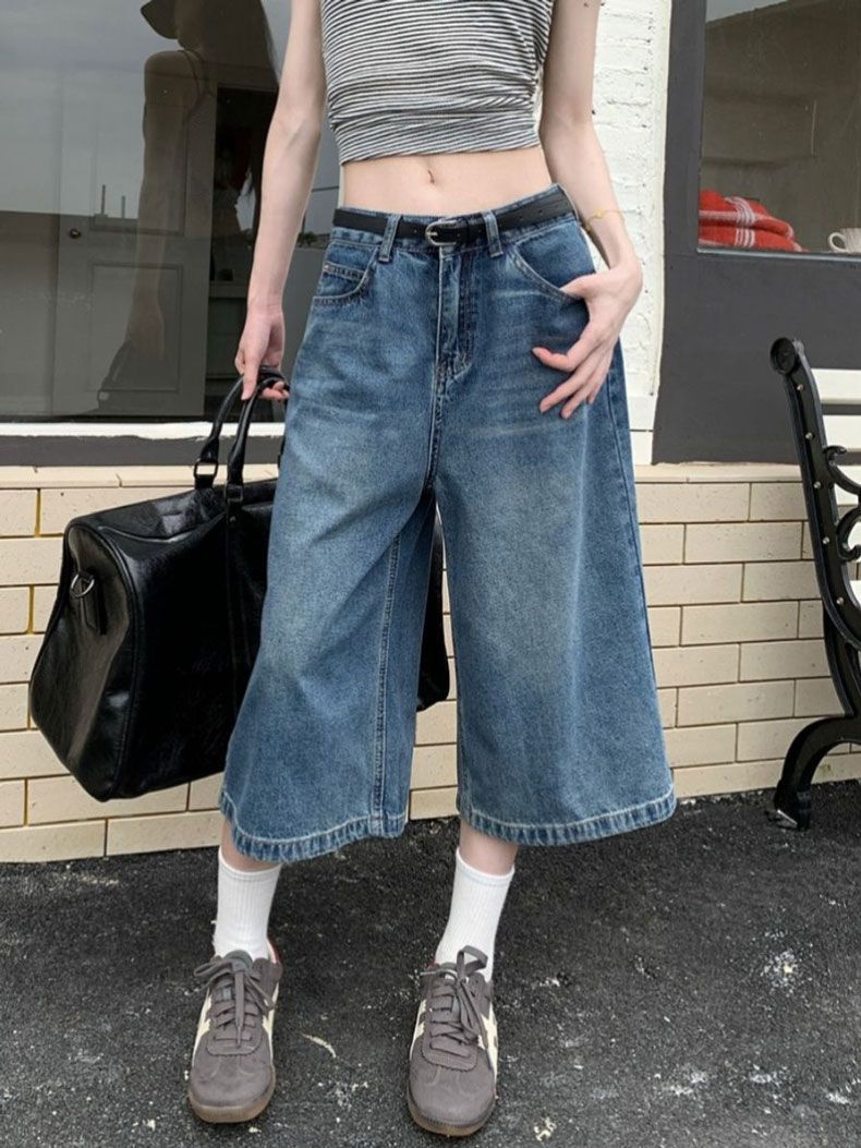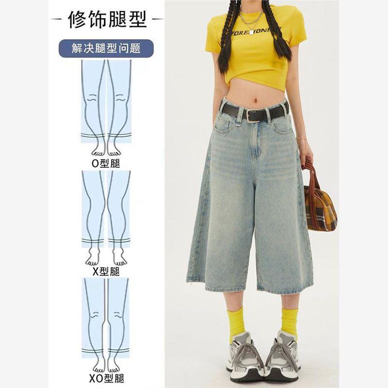 Jeans Cropped Desgastado com Design para Mulheres Plus Size Verão Novo Estilo Lavado Solto Americano Cintura Alta Pernas Largas Shorts