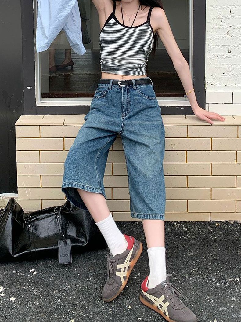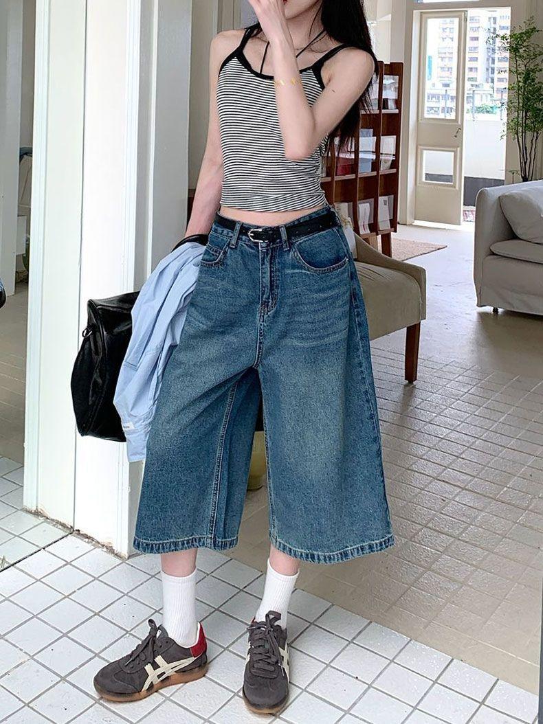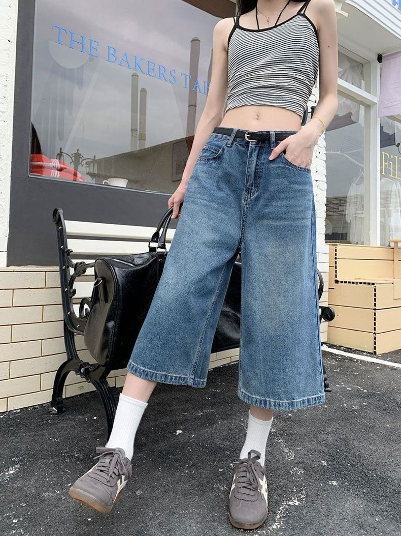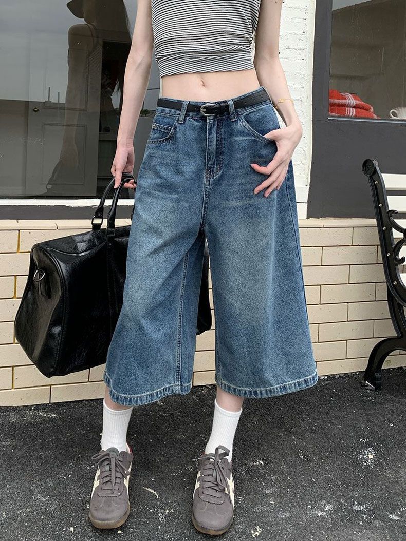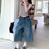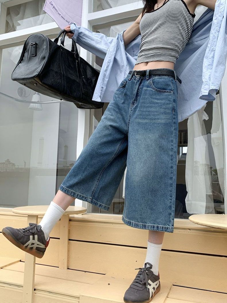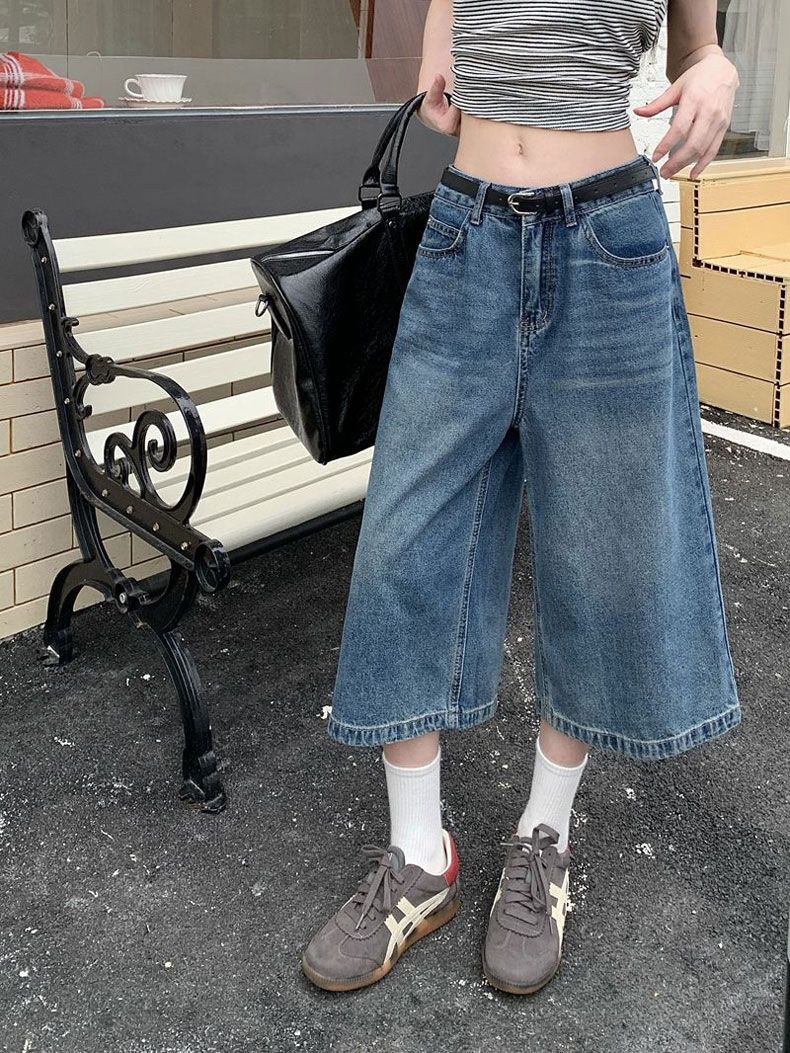 Jeans Cropped Desgastado com Design para Mulheres Plus Size Verão Novo Estilo Lavado Solto Americano Cintura Alta Pernas Largas Shorts