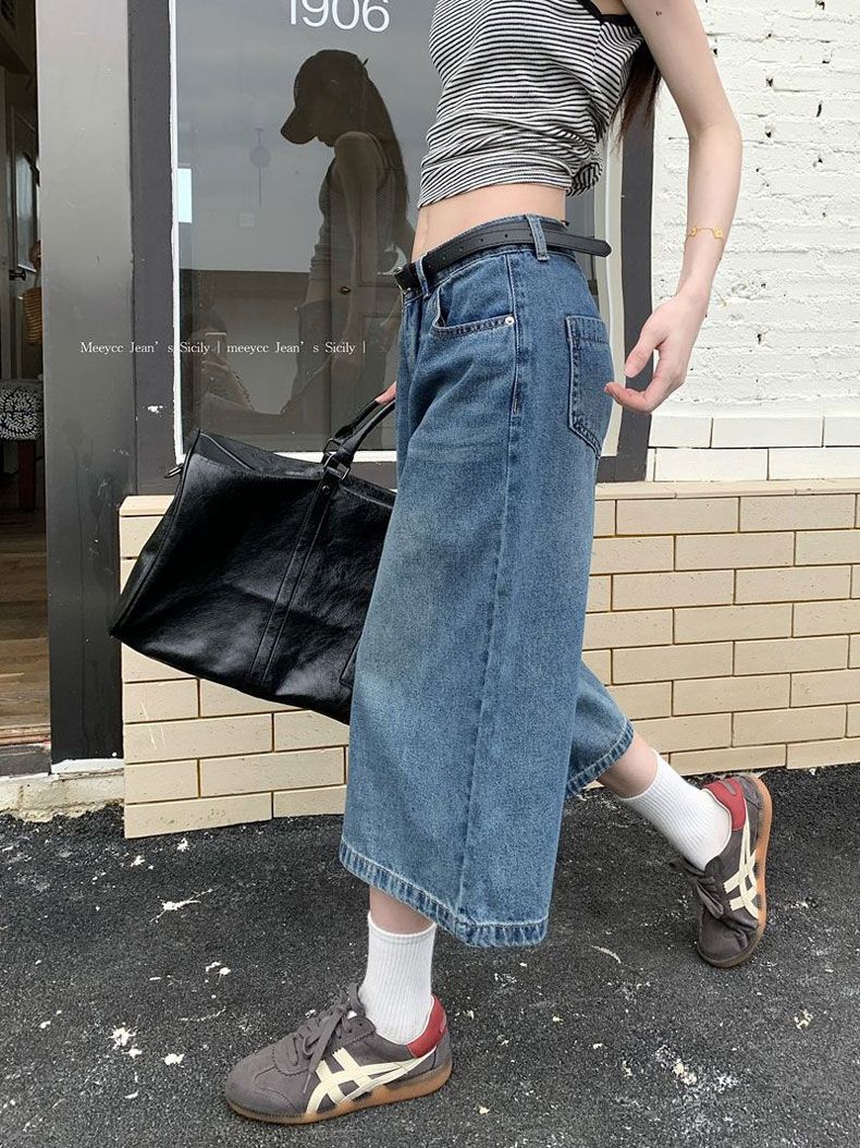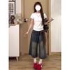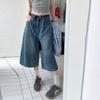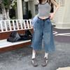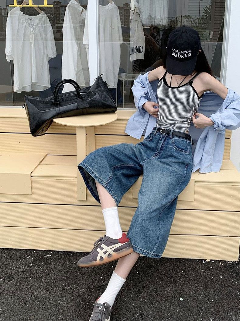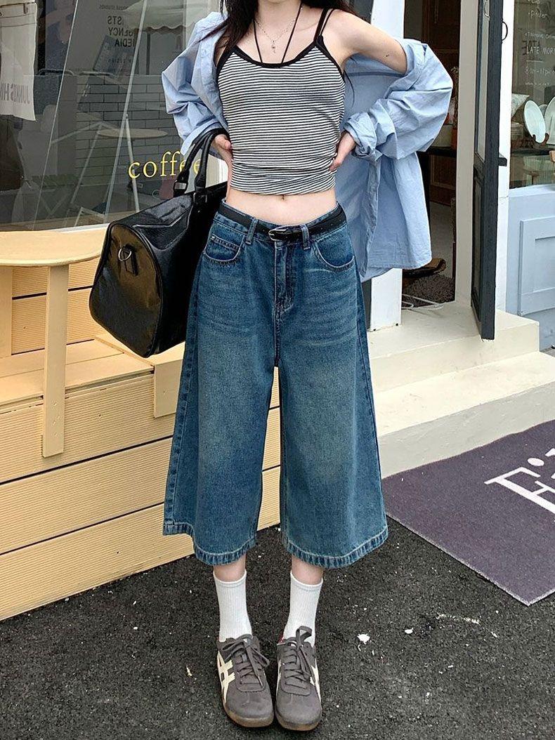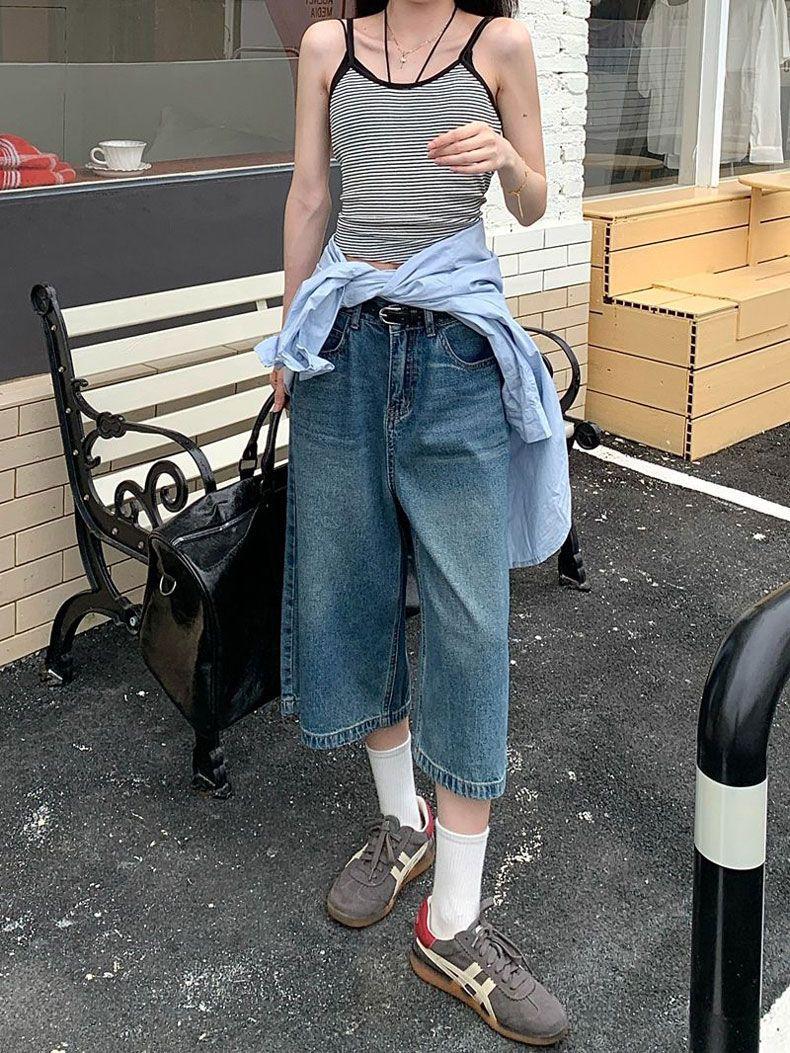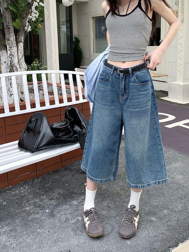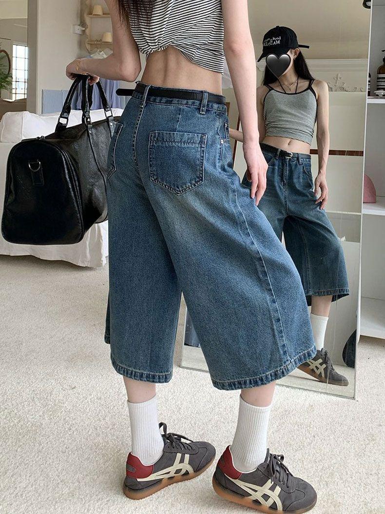 Jeans Cropped Desgastado com Design para Mulheres Plus Size Verão Novo Estilo Lavado Solto Americano Cintura Alta Pernas Largas Shorts