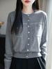Cardigan feminino de malha jacquard floral de lã fina de imitação nova primavera e verão 2025, manga comprida, gola redonda com bolsos