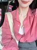 Camisa de manga comprida com protetor solar rosa francês para mulheres com design de nicho de nicho solto