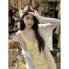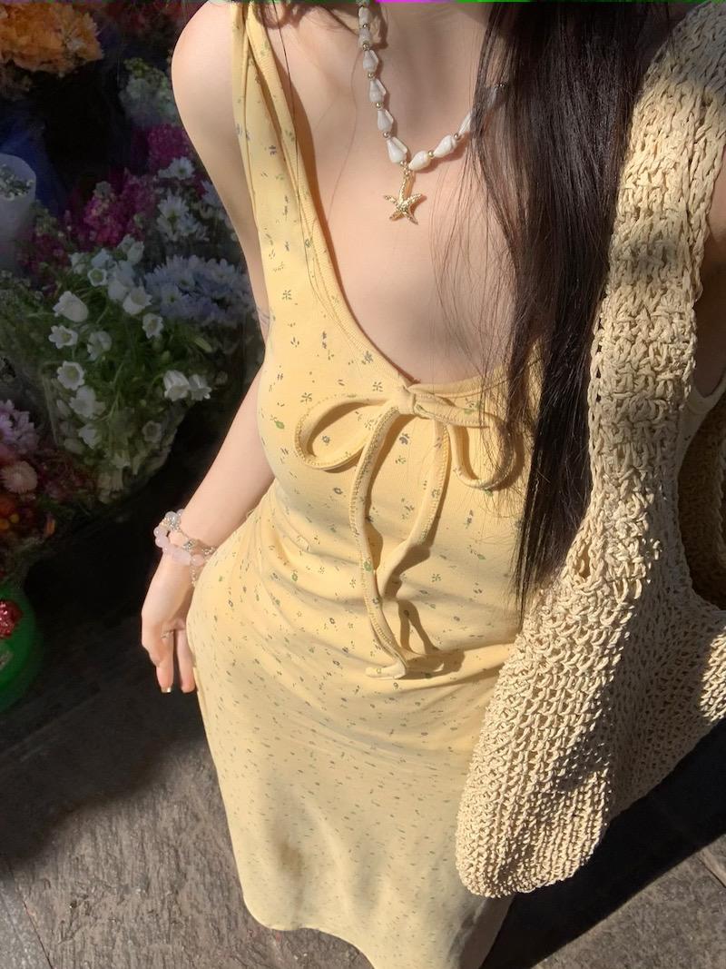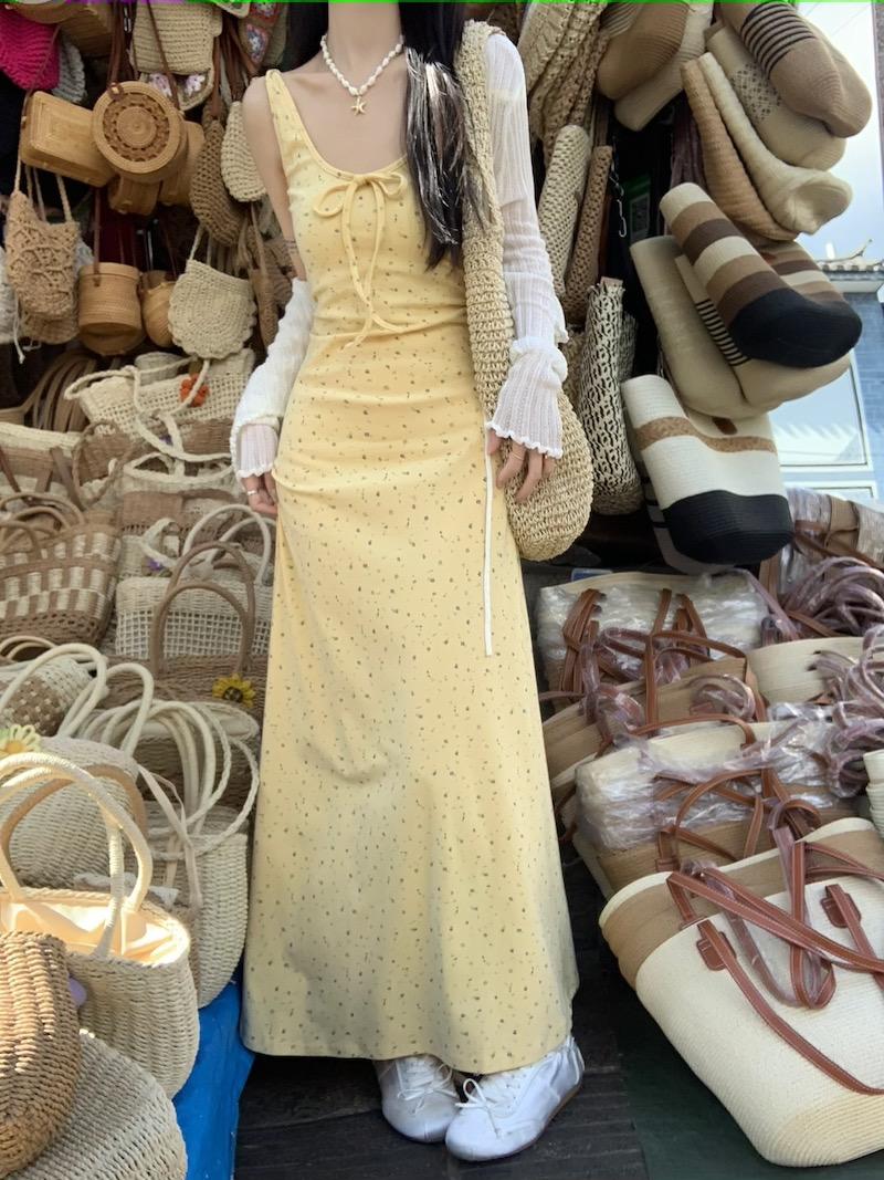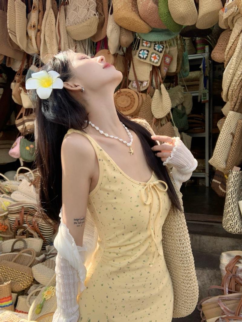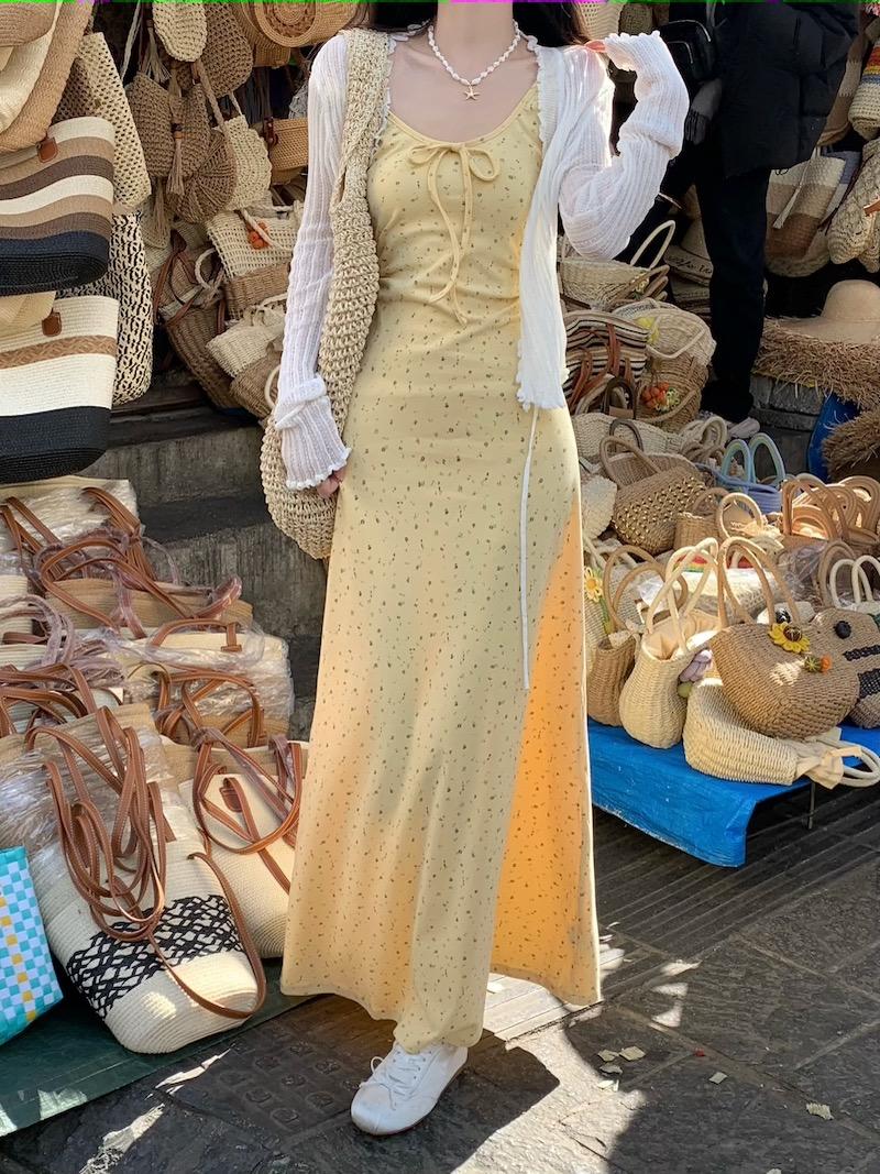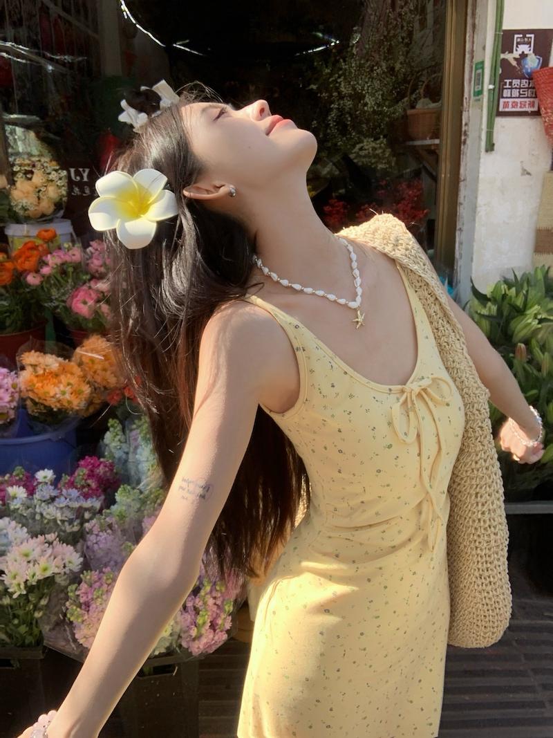 Vestido de Suspensório Floral Francês com Laço para Mulheres 2025 Verão Novo Estilo Emagrecendo e Chic Saia Longa