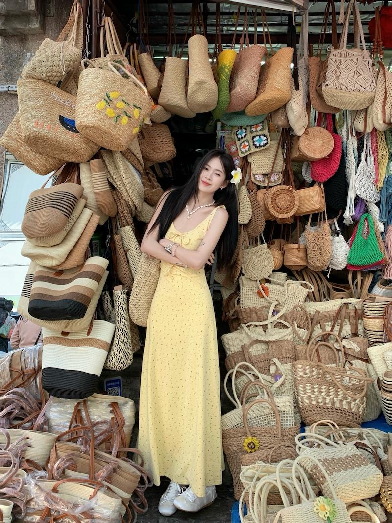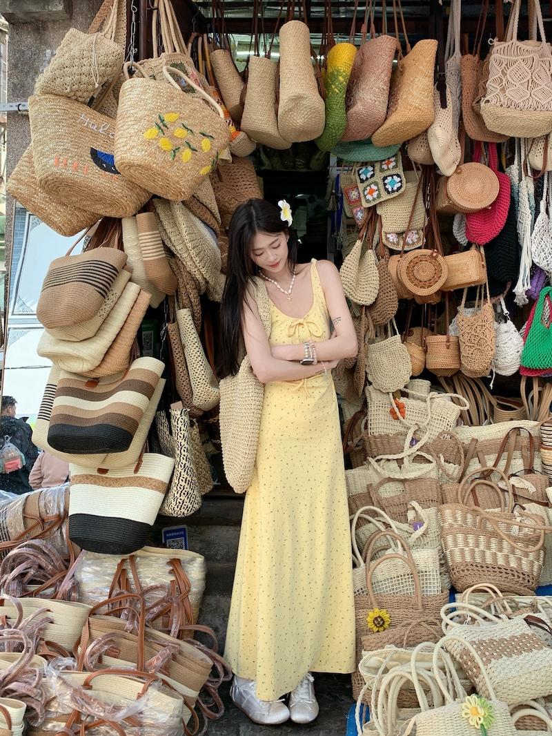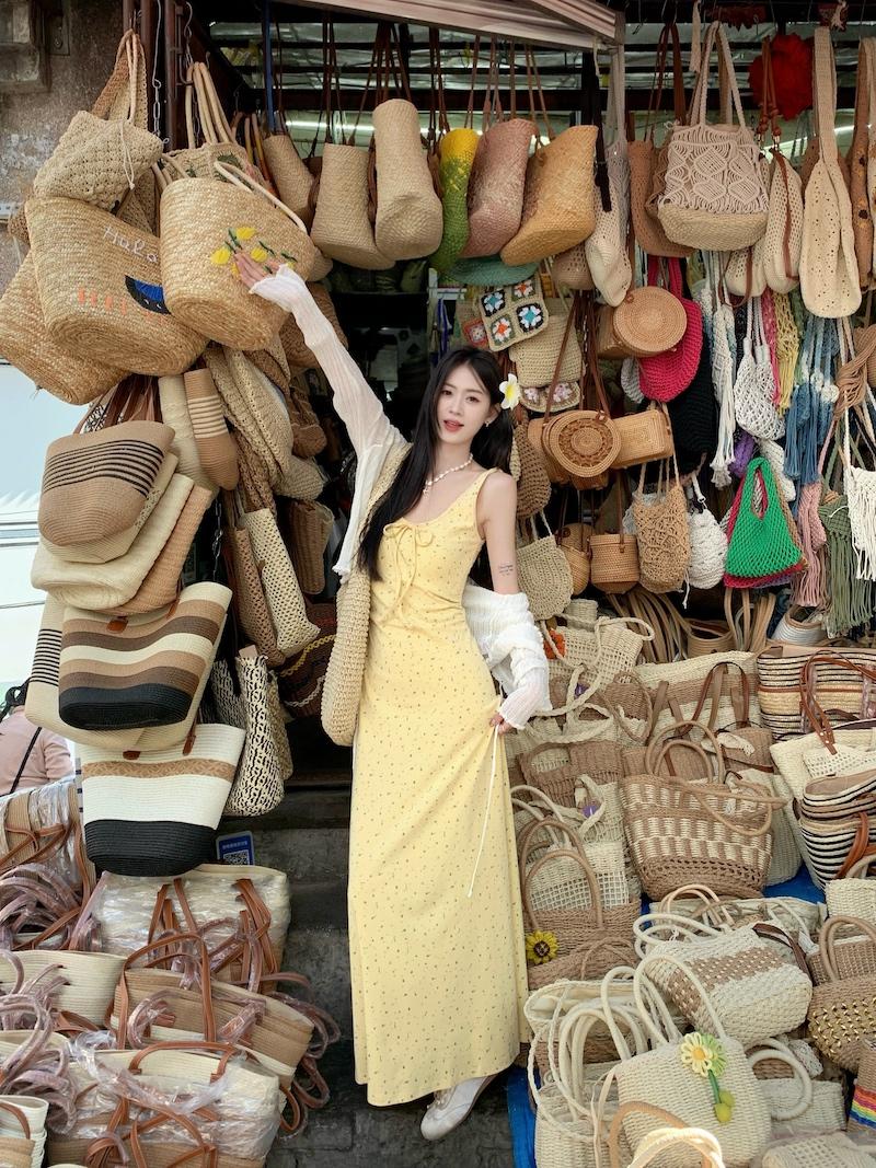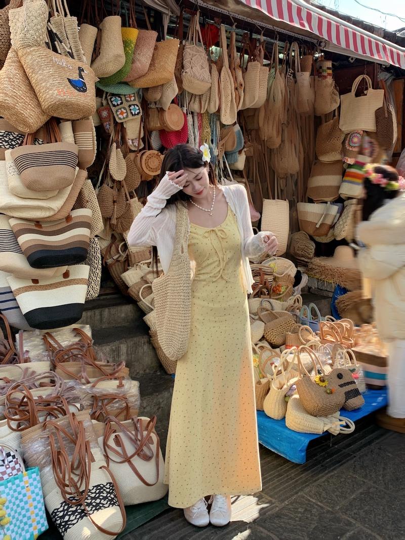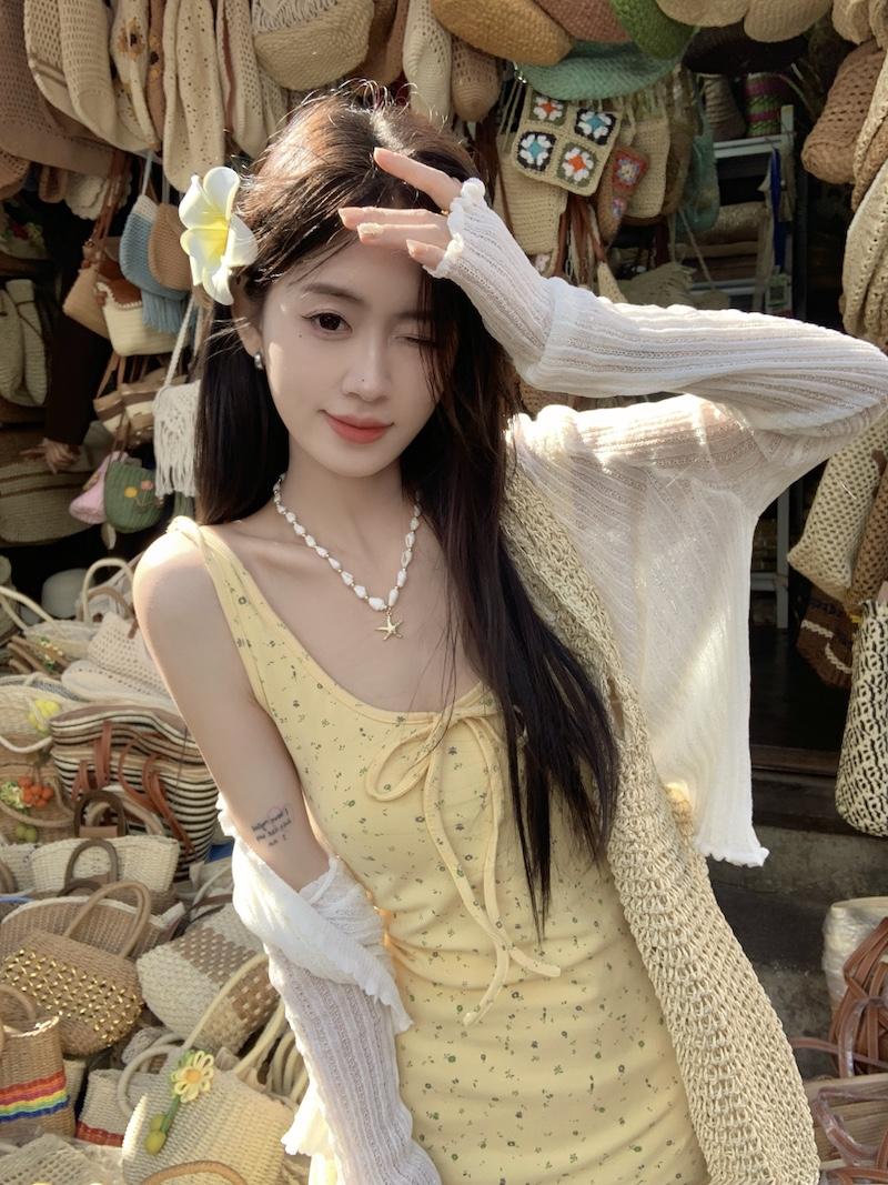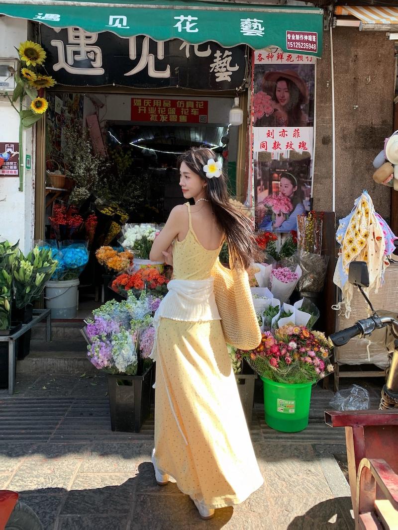 Yellow floral dress, White cardigan