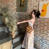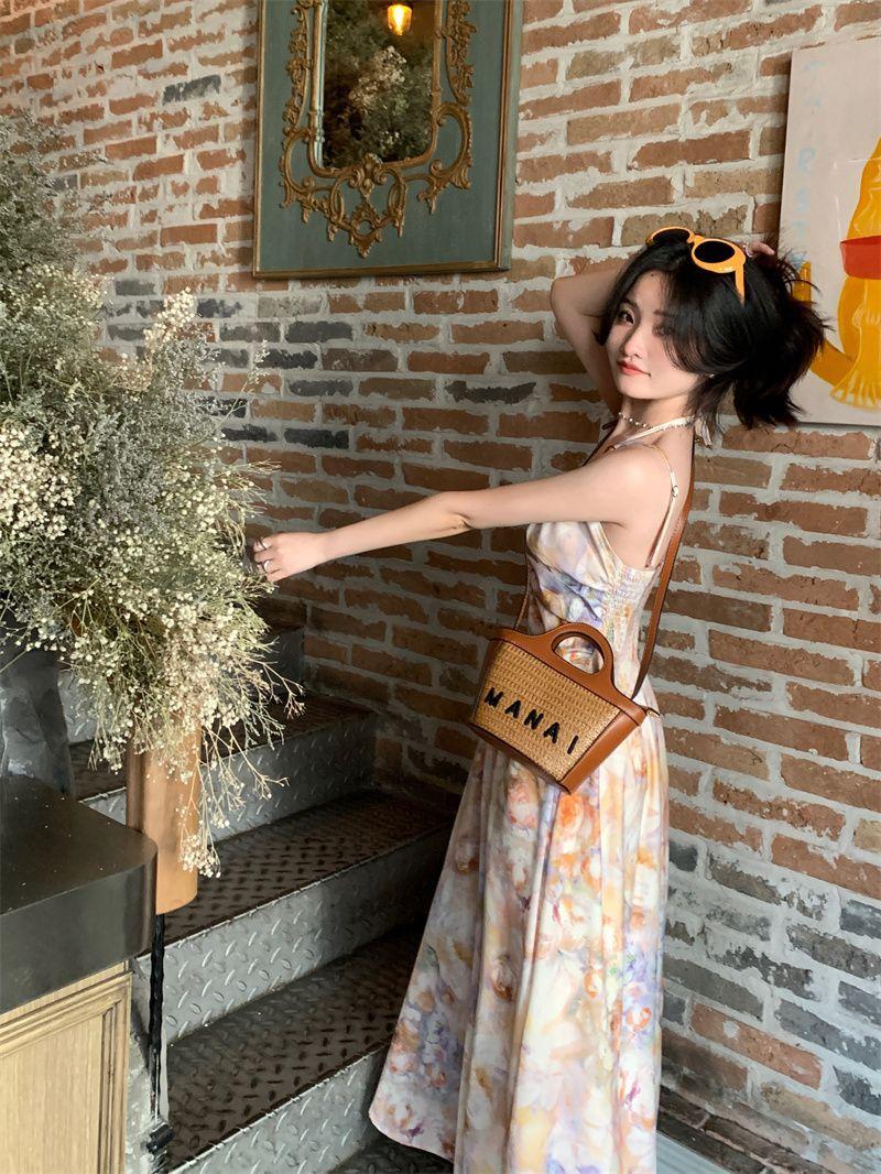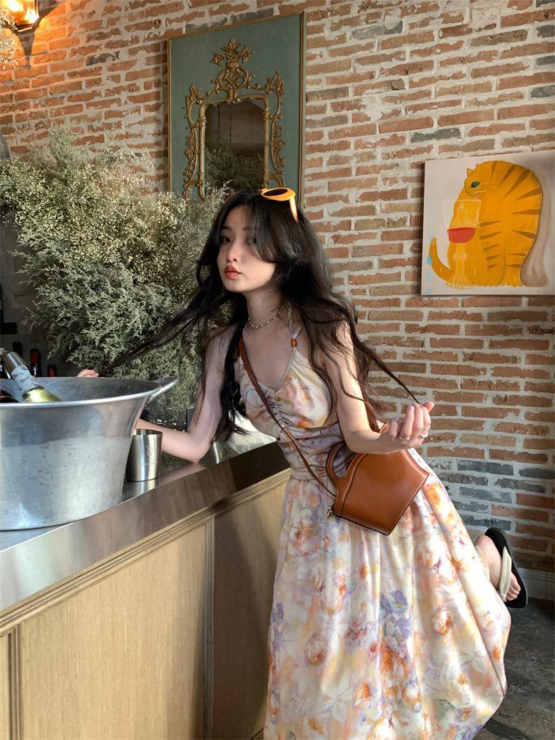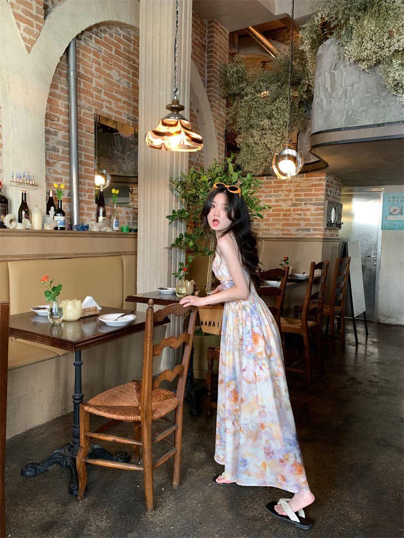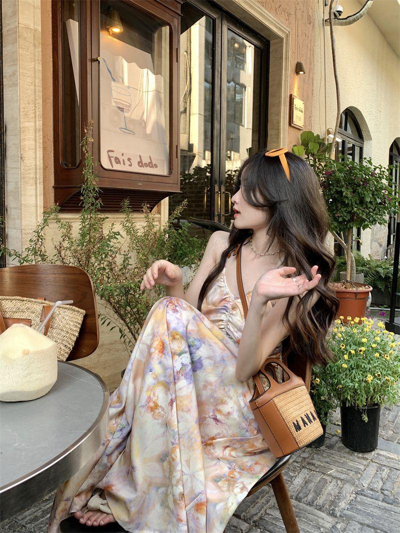 Vestido suspensório com decote halter floral retrô francês com pintura a óleo para mulheres estilo férias de verão saia longa com cintura sem costas