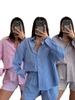 211495 Verão Novo Cardigã Listrado Transfronteiriço Europeu e Americano Camisa de Manga Comprida Feminina Terno Shorts da Moda Conjunto de Duas Peças