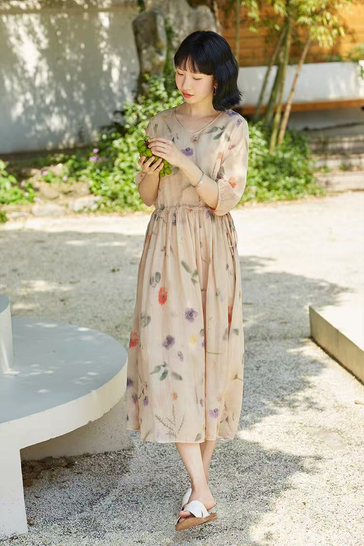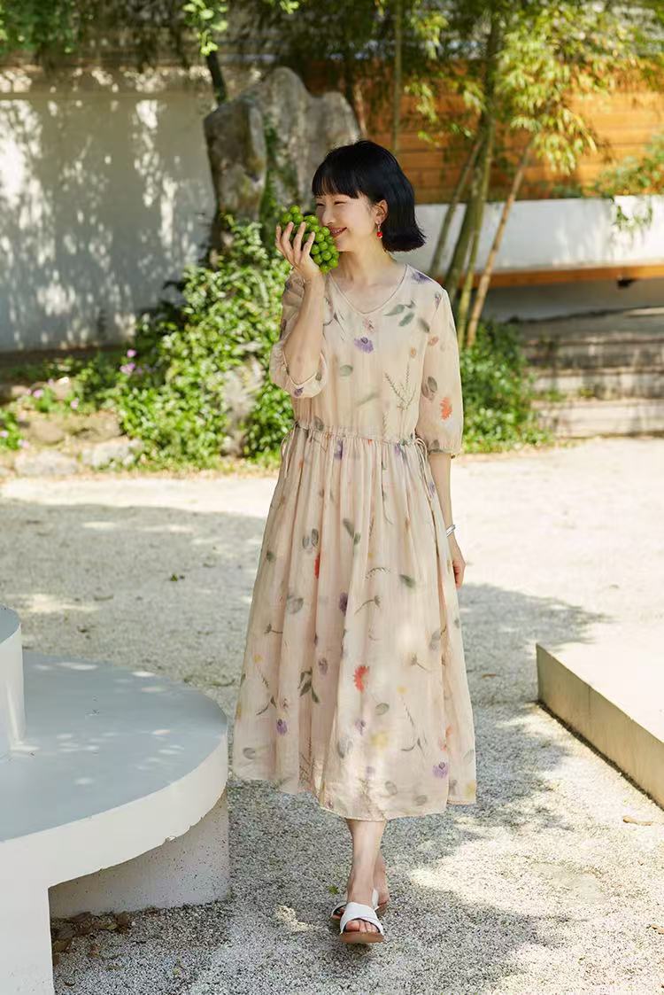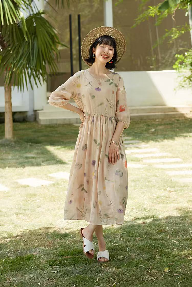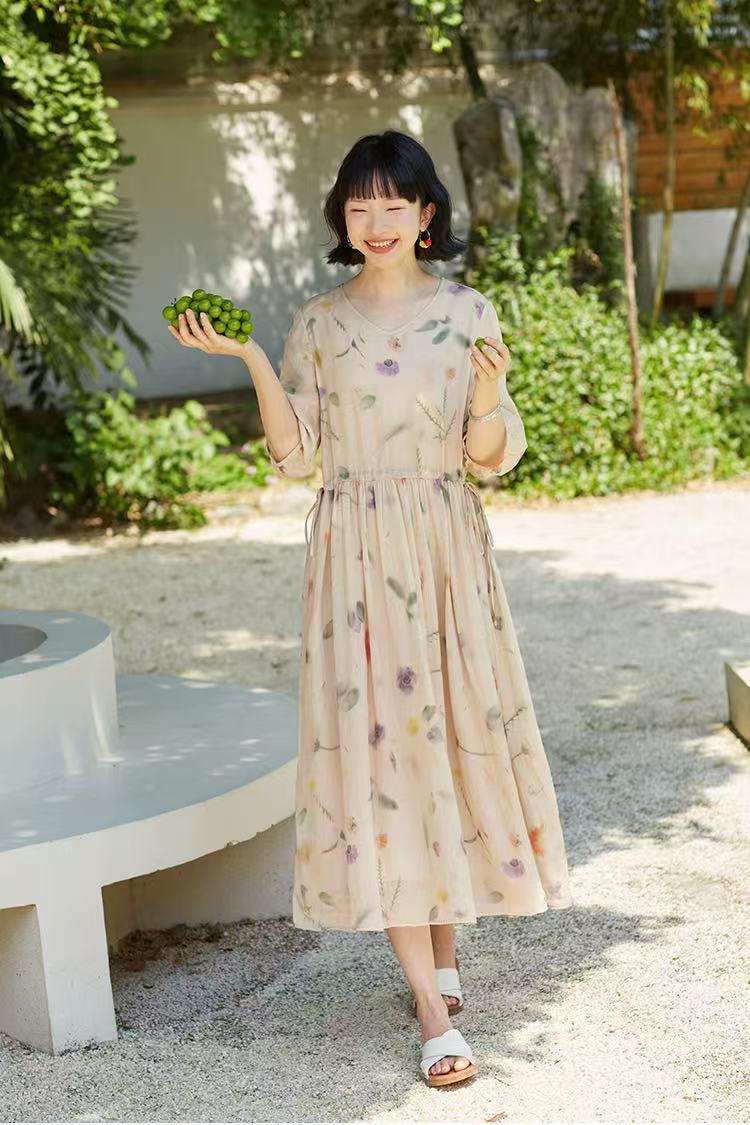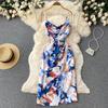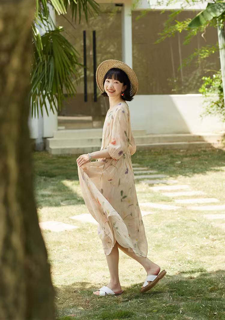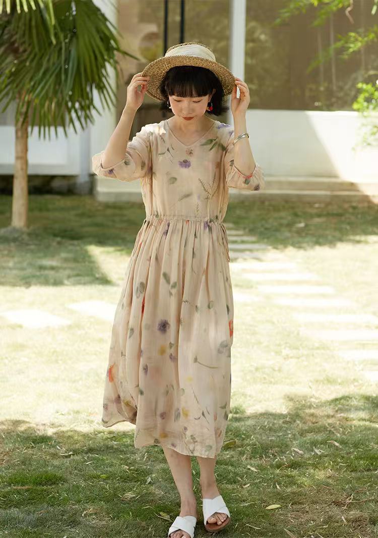 Vestido Midi Estampado com Decote V Novo Estilo Resort Primavera/Verão 2025