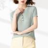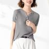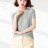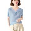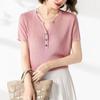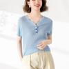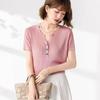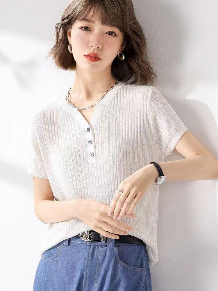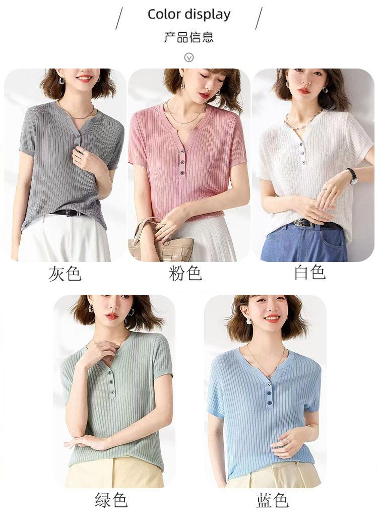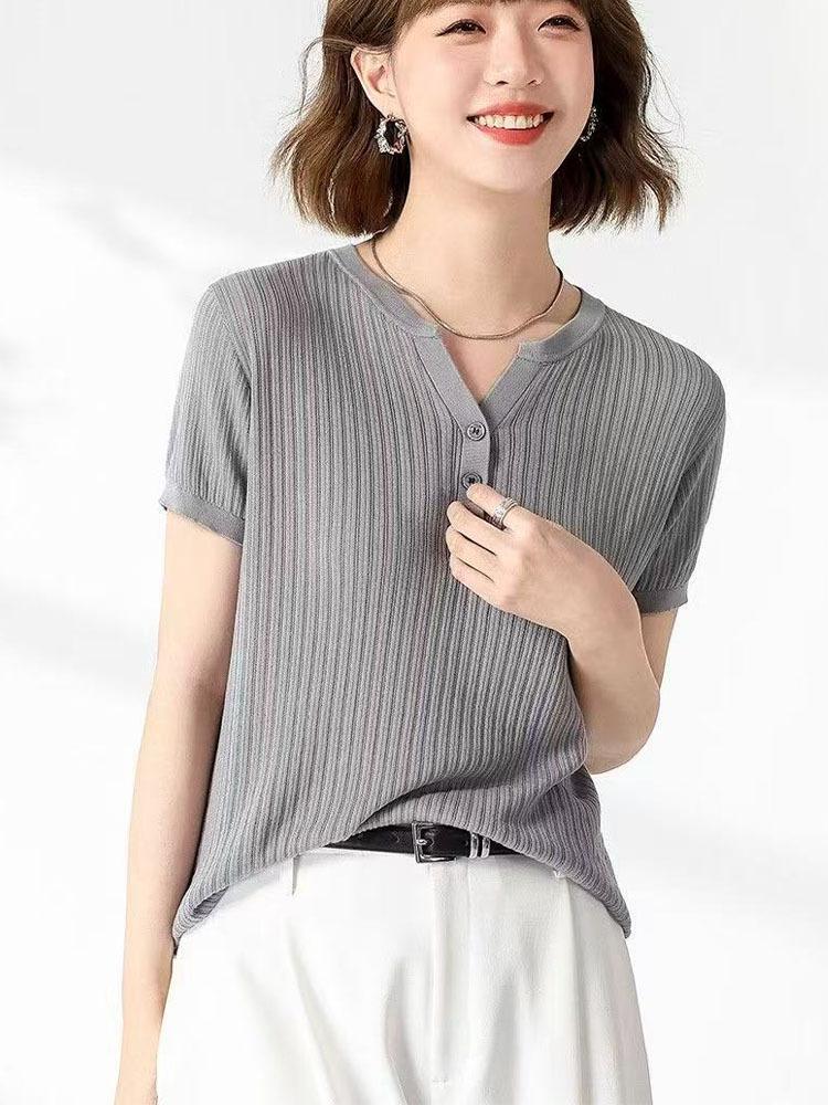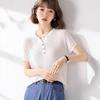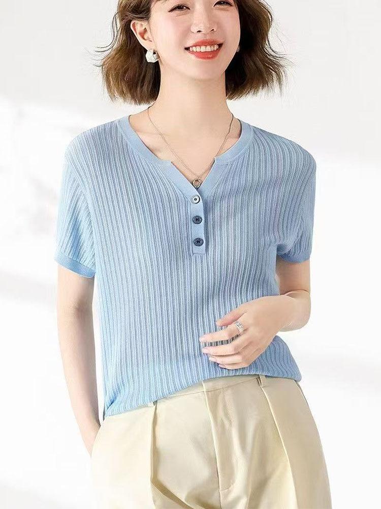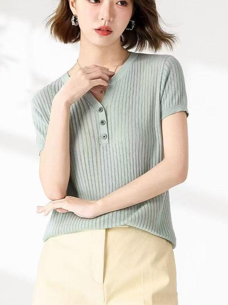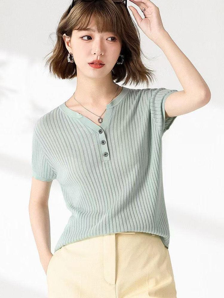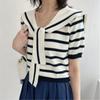Atacado Novo Estilo de Verão Estilo Suave Gola Meio Aberta Suéter Listrado Manga Curta Cobrindo a Barriga Emagrecedor Versátil Top