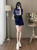 Conjunto Esportivo Casual Azul Marinho de Alta Qualidade para Mulheres Verão Novo Design Renda Emendada Manga Curta Shorts Conjunto de Duas Peças