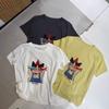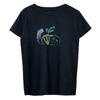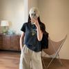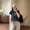 Camiseta com estampa de gatinho em tinta branca + bordado + processo de abotoamento feito à mão!