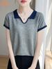 Verão Novo Estilo Gola Polo Tencel Manga Curta Feminina Fina Respirável Cor Contrastante Camiseta Tricotada Feminina Solta Elegante para Usar por Baixo