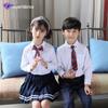 Conjunto de quatro peças em malha (cardigan, camisa, gravata/laço, saia/calça)