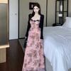 Vestido Feminino Retrô Francês com Suspensório Estampa Irregular de Malha Verão Fino Proteção Solar Cardigã Conjunto de Duas Peças