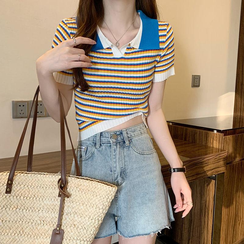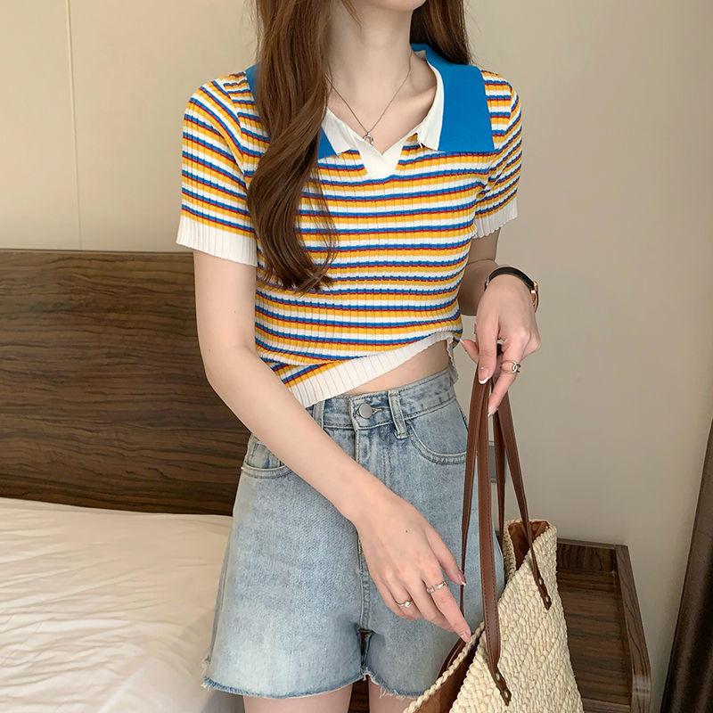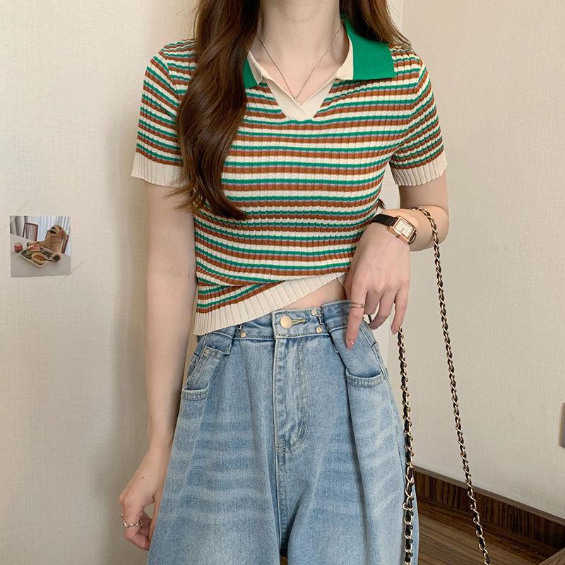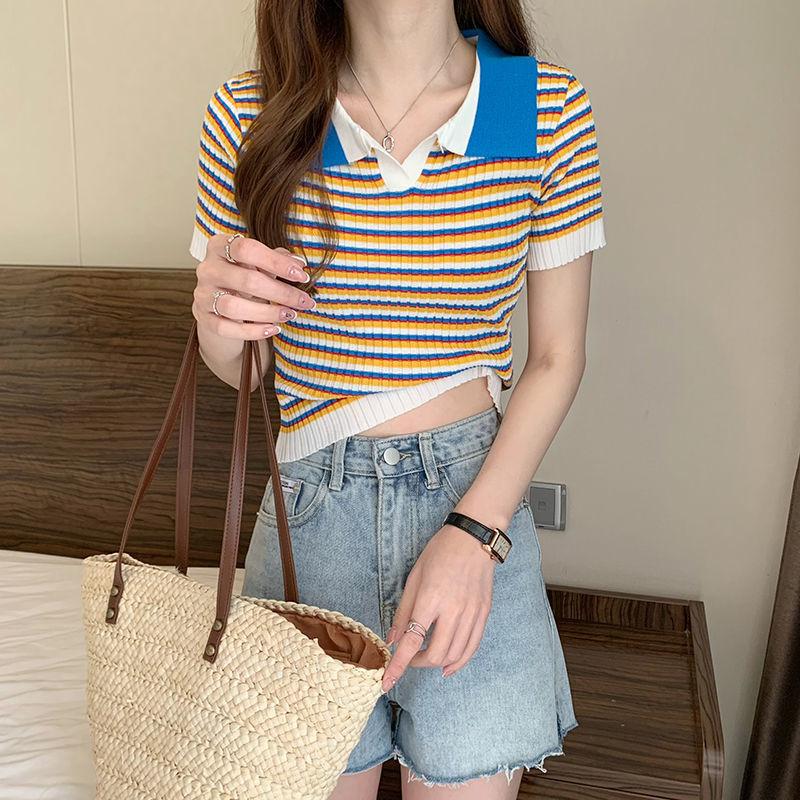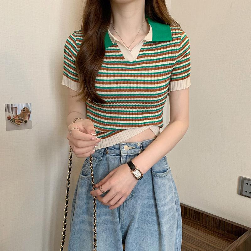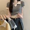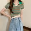 Camiseta suéter listrada de manga curta com gola POLO 2024 Novo design de estilo coreano nicho senso de design estilo casual top curto