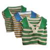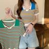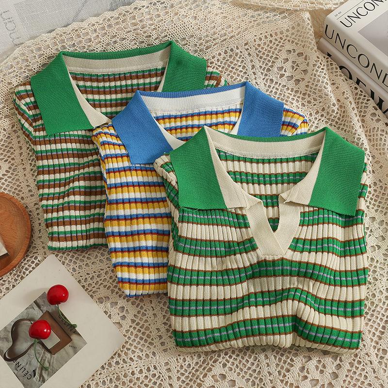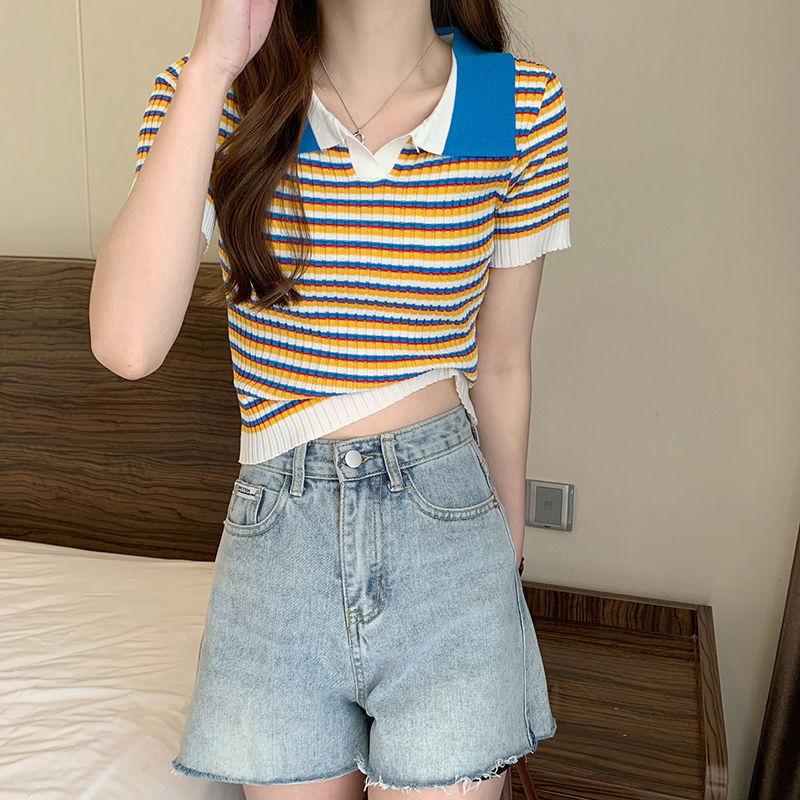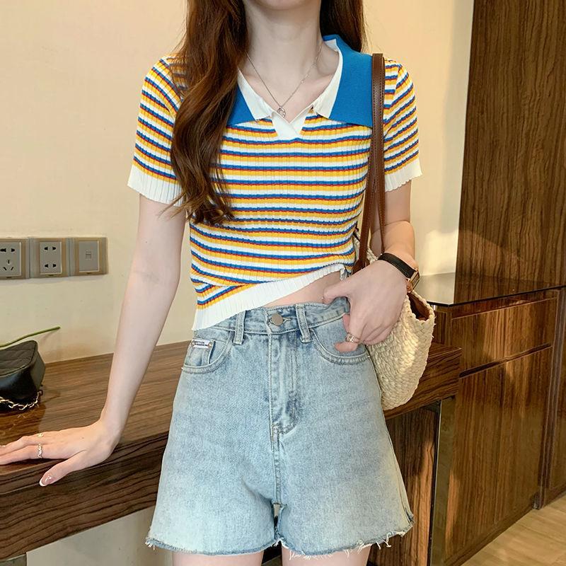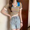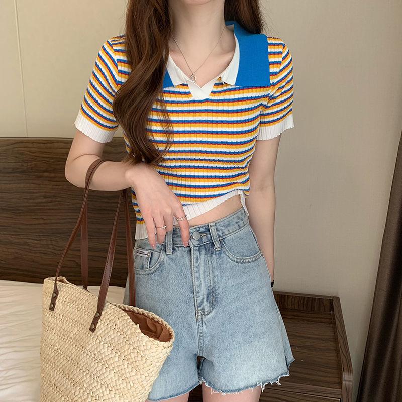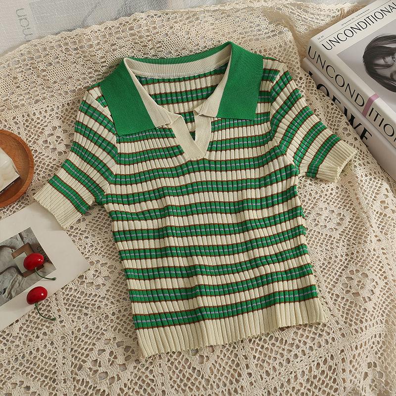 Camiseta suéter listrada de manga curta com gola POLO 2024 Novo design de estilo coreano nicho senso de design estilo casual top curto