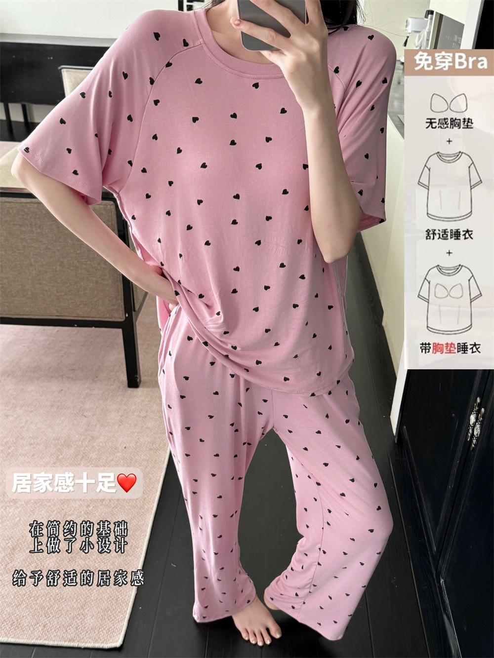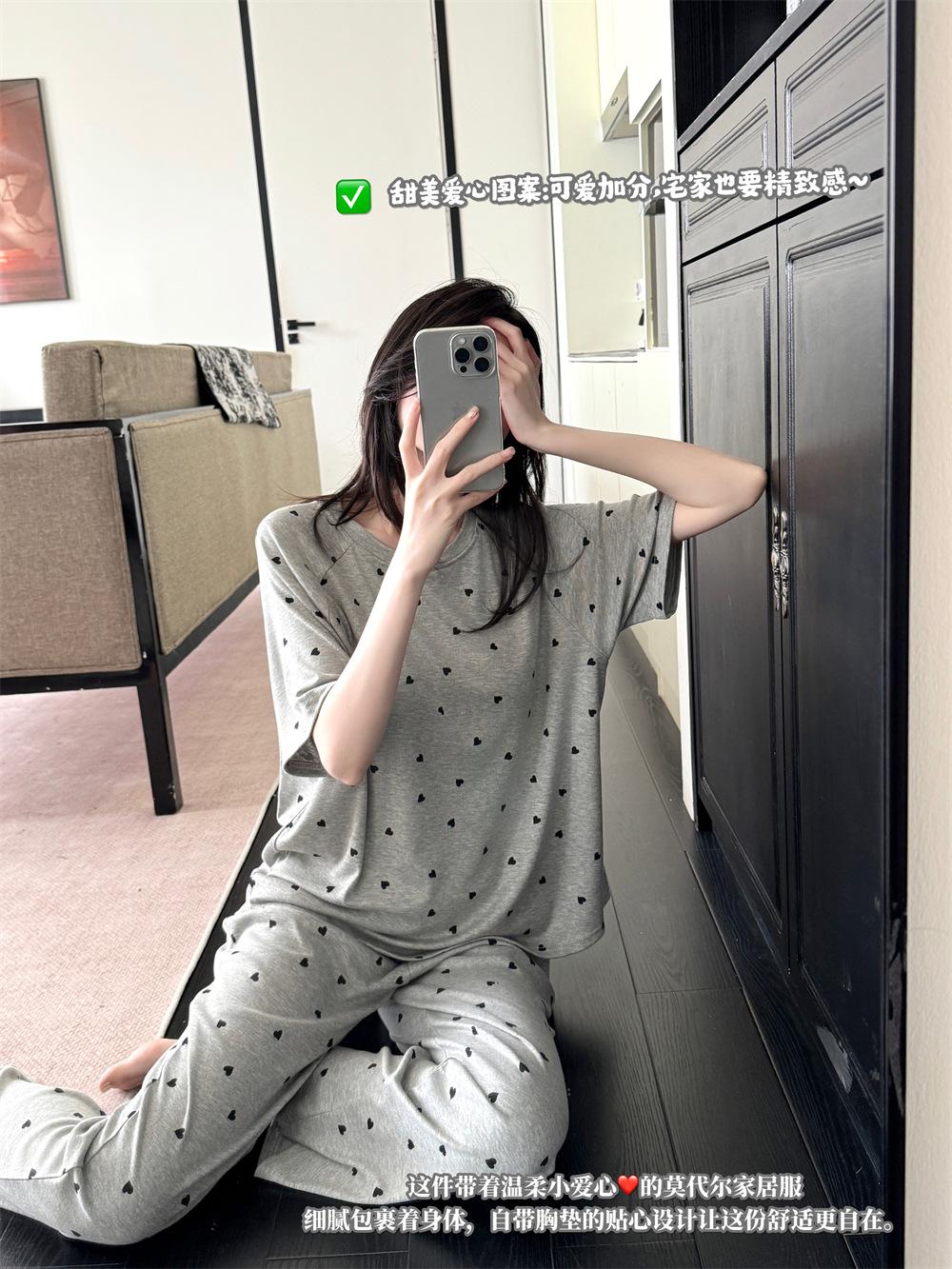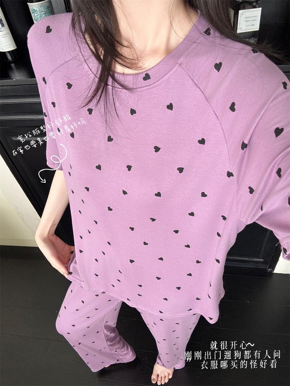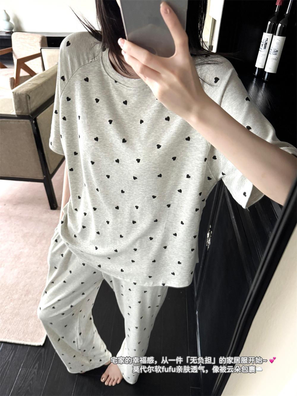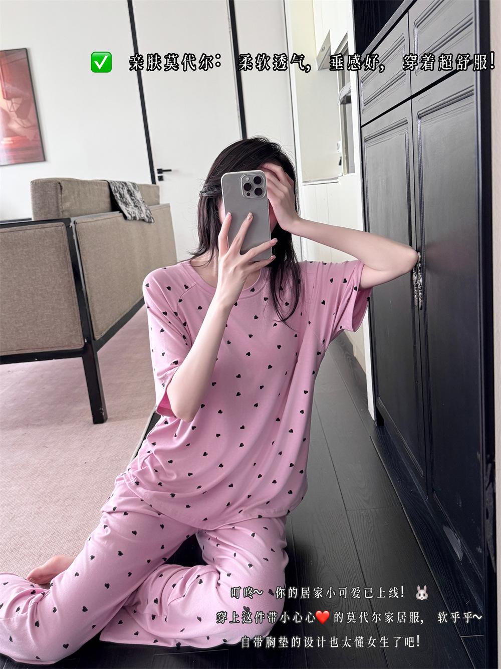 Pijama de Verão Modal Acolchoada de Manga Curta com Calças para Mulheres, Doce e Fofa com Corações de Pêssego, Fina, Casual, para Usar em Casa