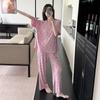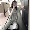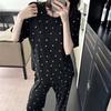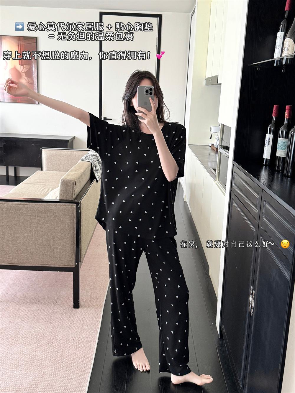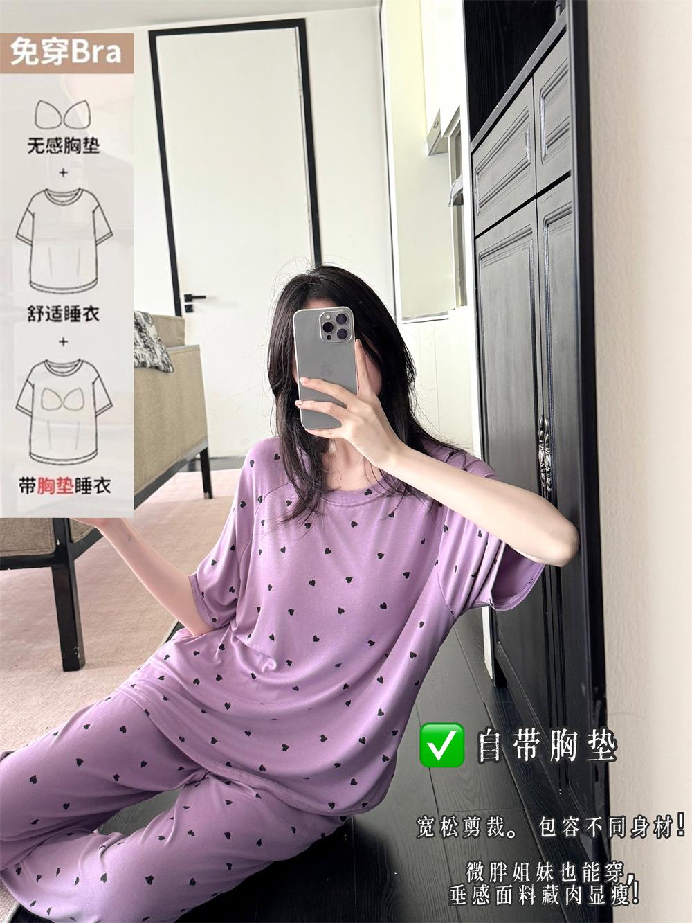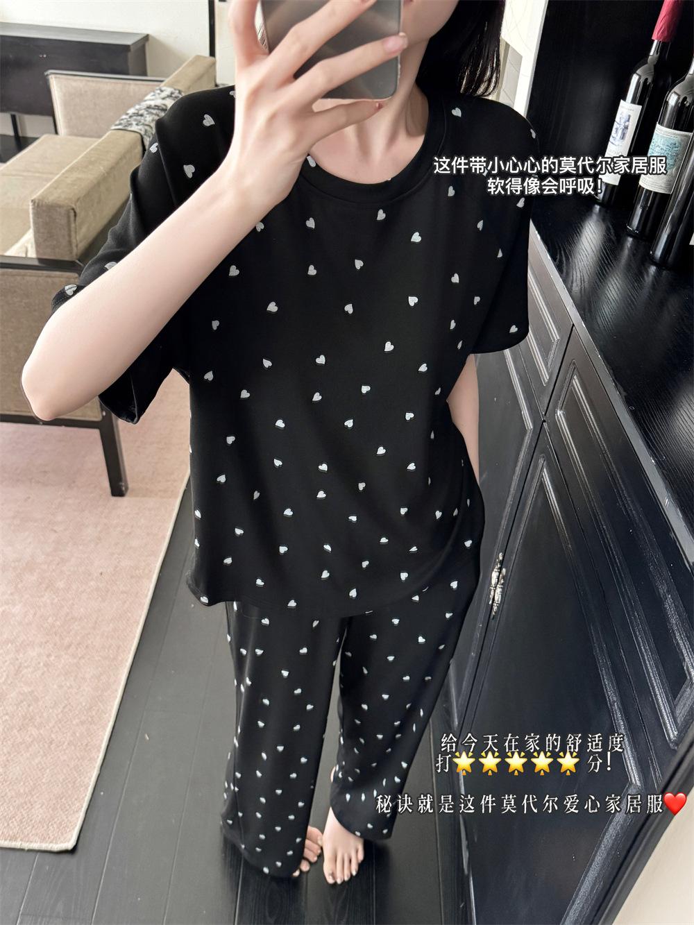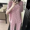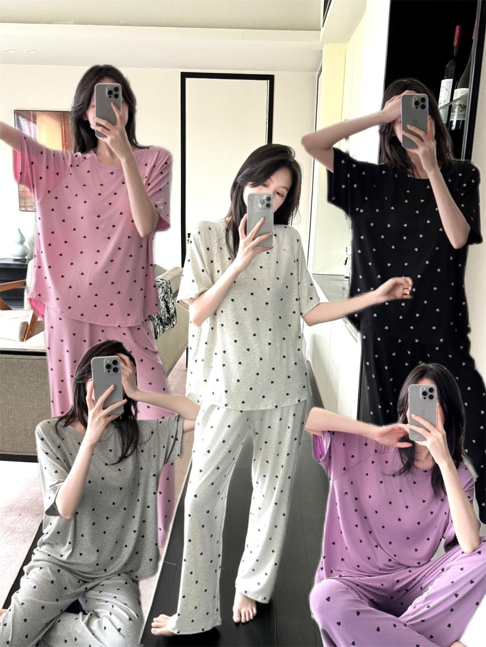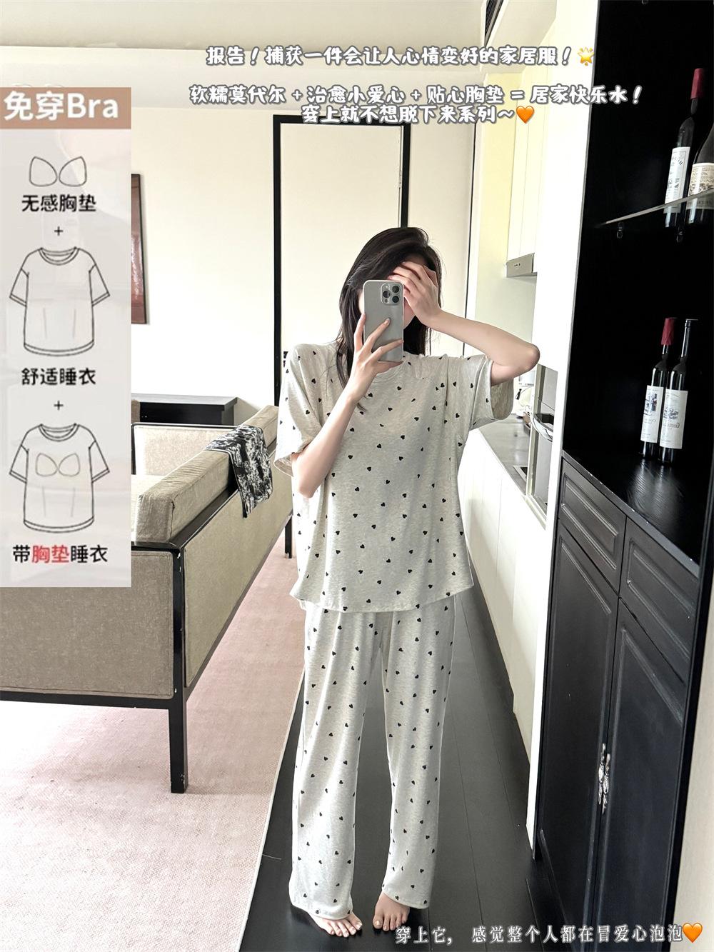Pijama de Verão Modal Acolchoada de Manga Curta com Calças para Mulheres, Doce e Fofa com Corações de Pêssego, Fina, Casual, para Usar em Casa