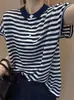Camiseta Folgada Estilo Coreano com Gola Polo Verão Fina Listrada Combinação de Cores Lel Tricotada Manga Curta Top Curto para Mulheres