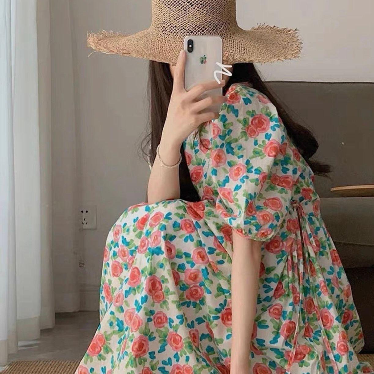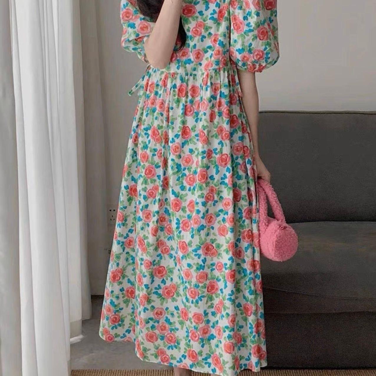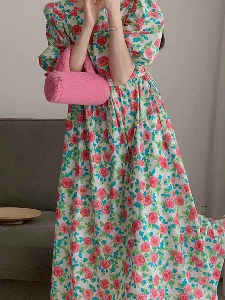 Saia Floral de Verão Coreana Retrô com Estampa de Rosa e Decote Redondo para Mulheres, Solta e Slim, Elegante Petite, Saia Versátil em A