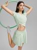 Conjunto Esportivo Feminino de Primavera e Verão 2025 Tênis Yoga Duas peças Ombro Único Vazado Sexy Manga Curta Saia Calça Anti-corrida