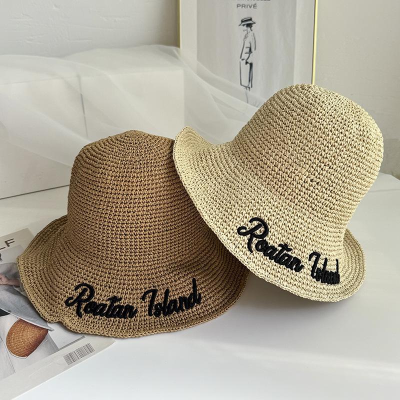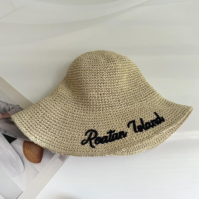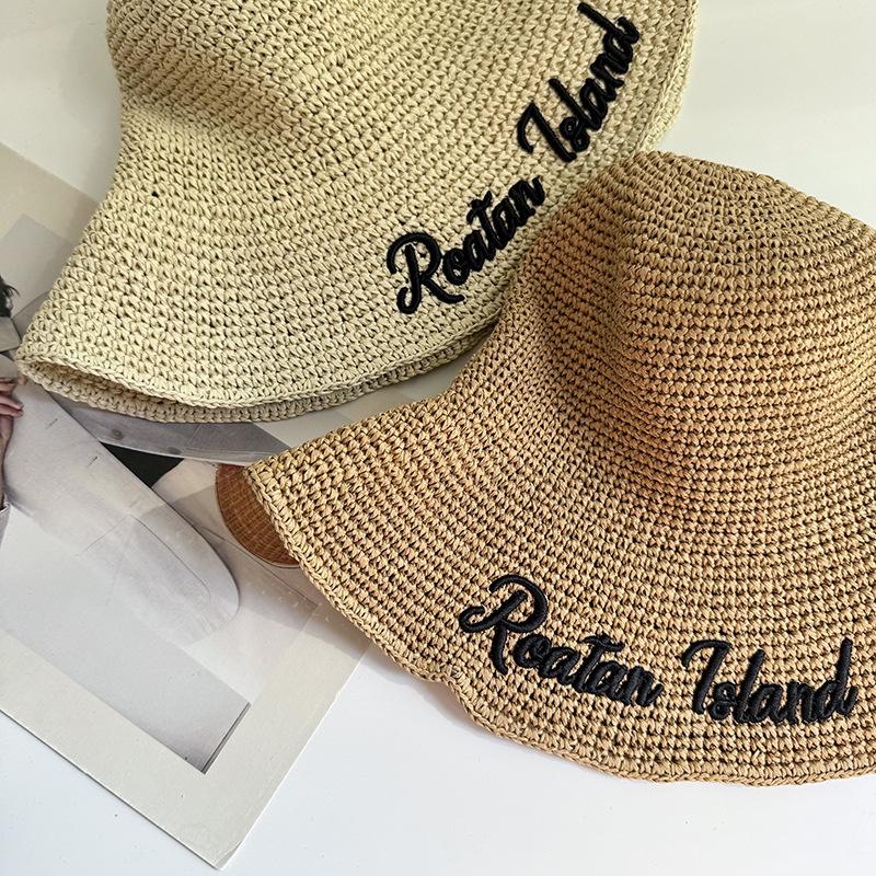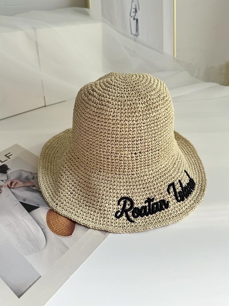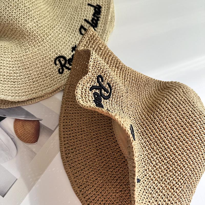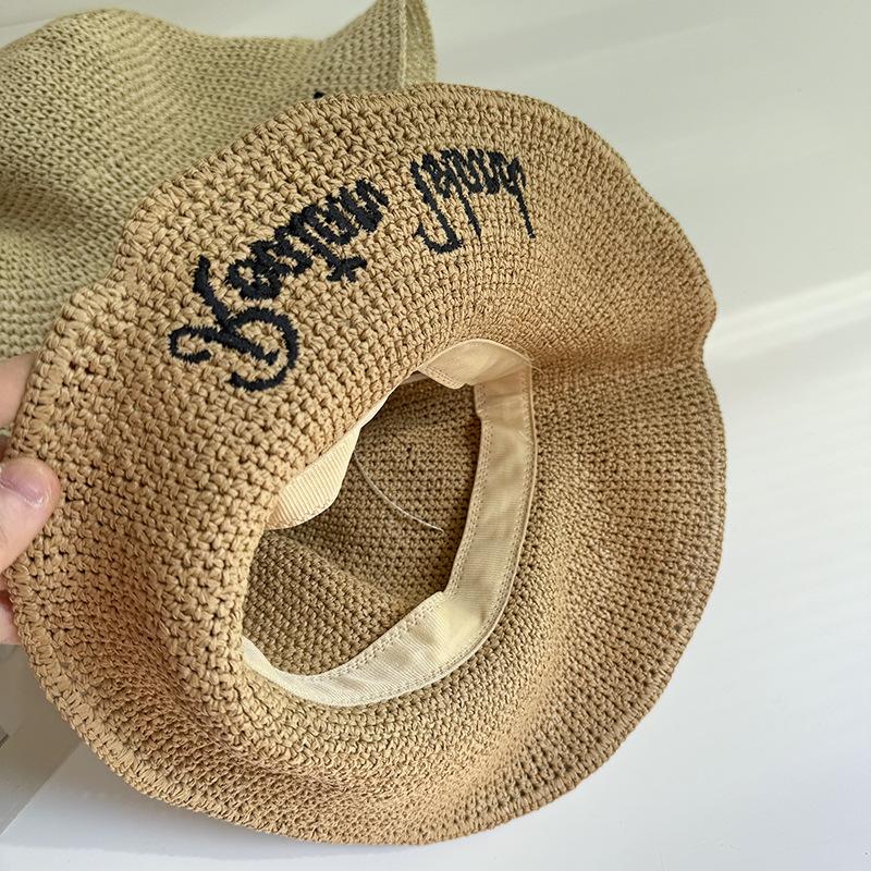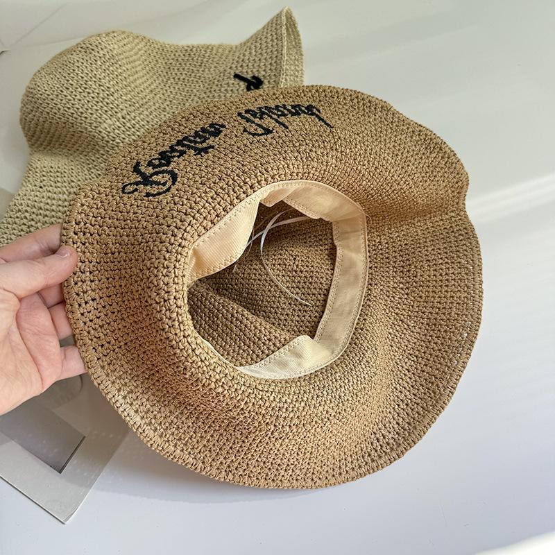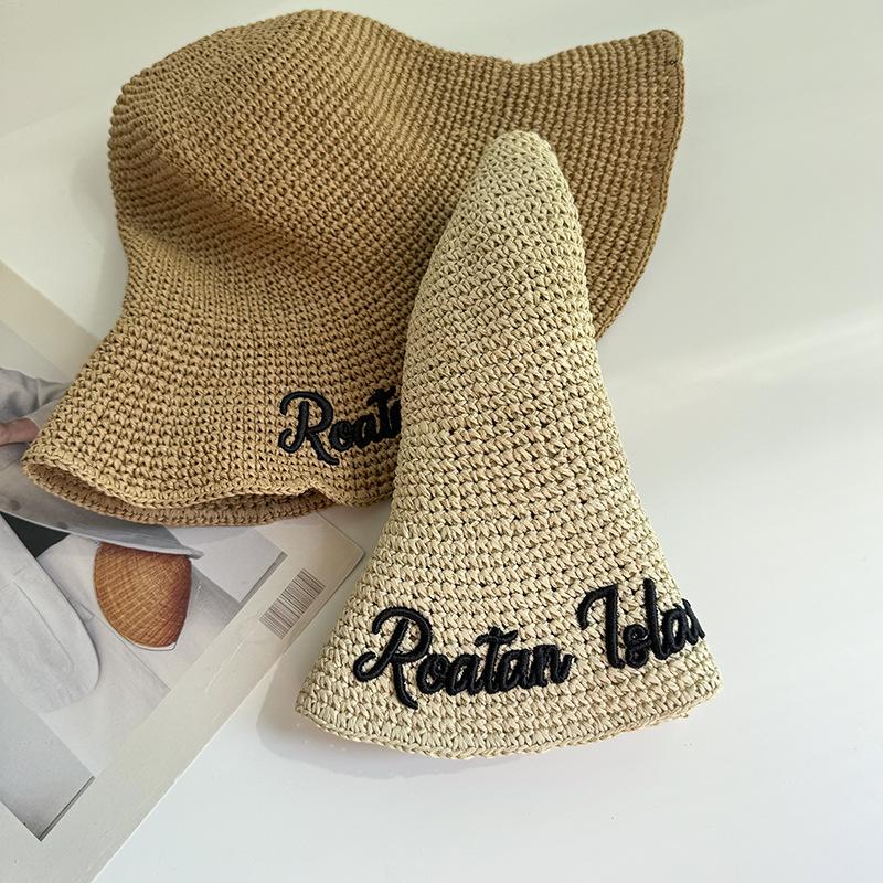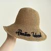 Chapéu de palha trançado com letras para mulheres, chapéu dobrável de verão para proteção solar, chapéu de pescador, chapéu de sol de aba grande para férias na praia