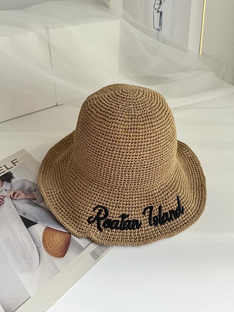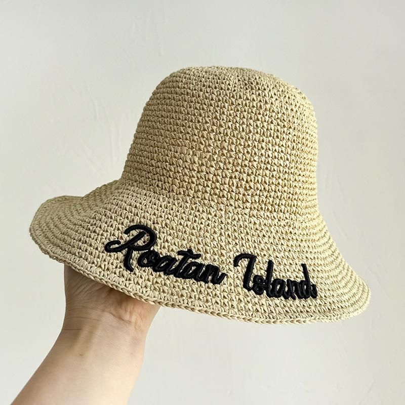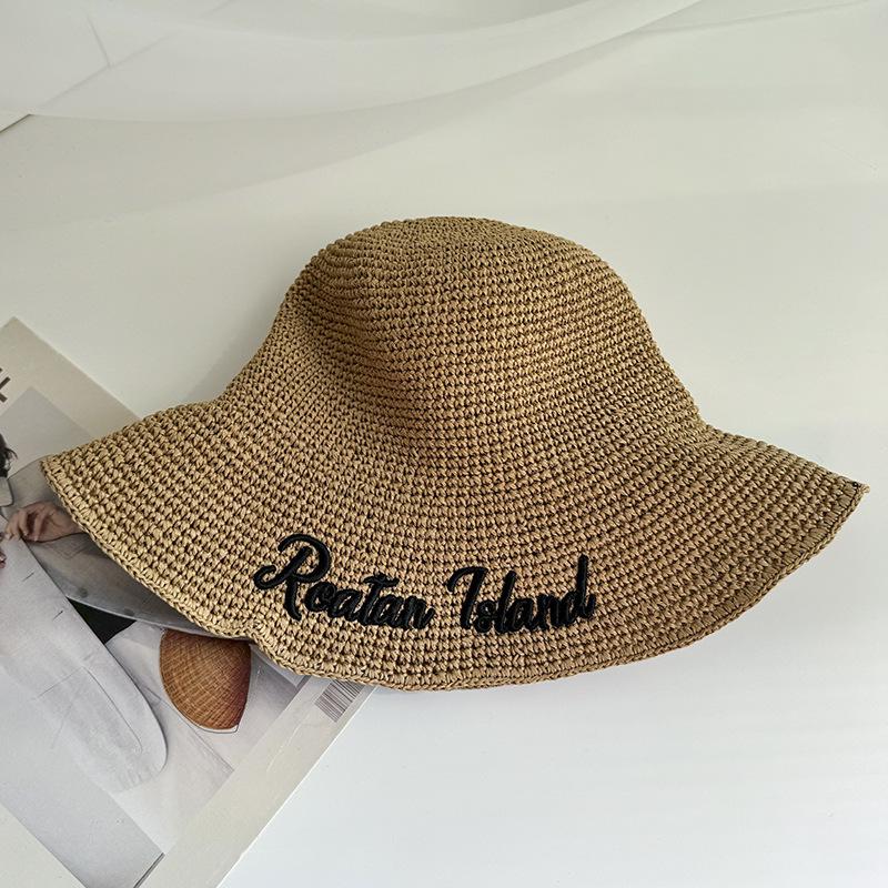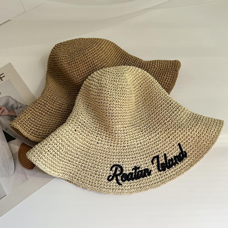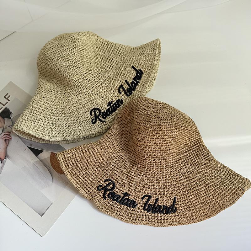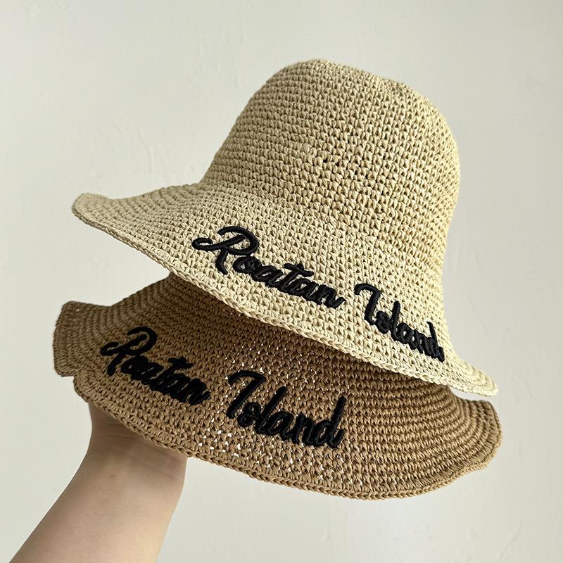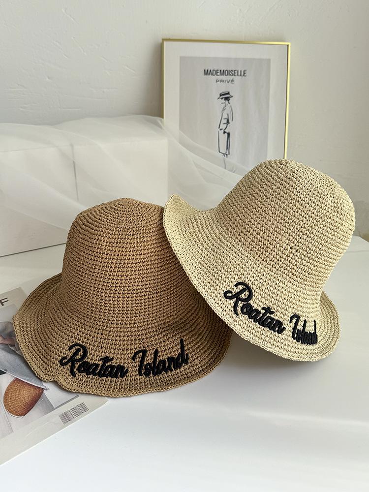 Chapéu de palha trançado com letras para mulheres, chapéu dobrável de verão para proteção solar, chapéu de pescador, chapéu de sol de aba grande para férias na praia