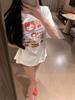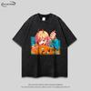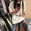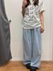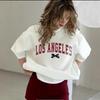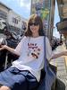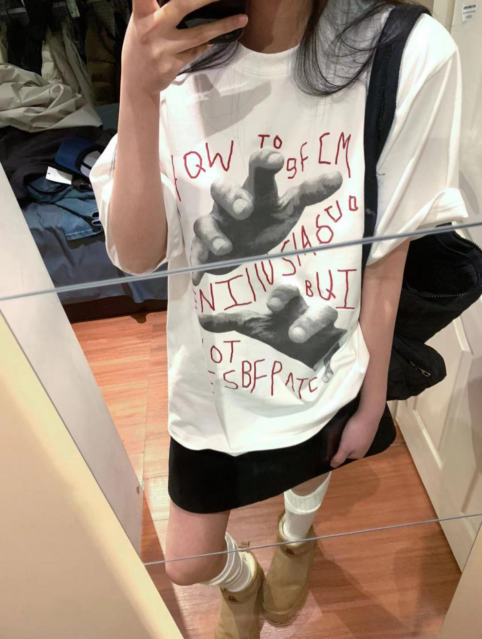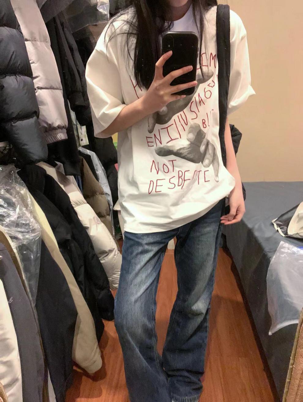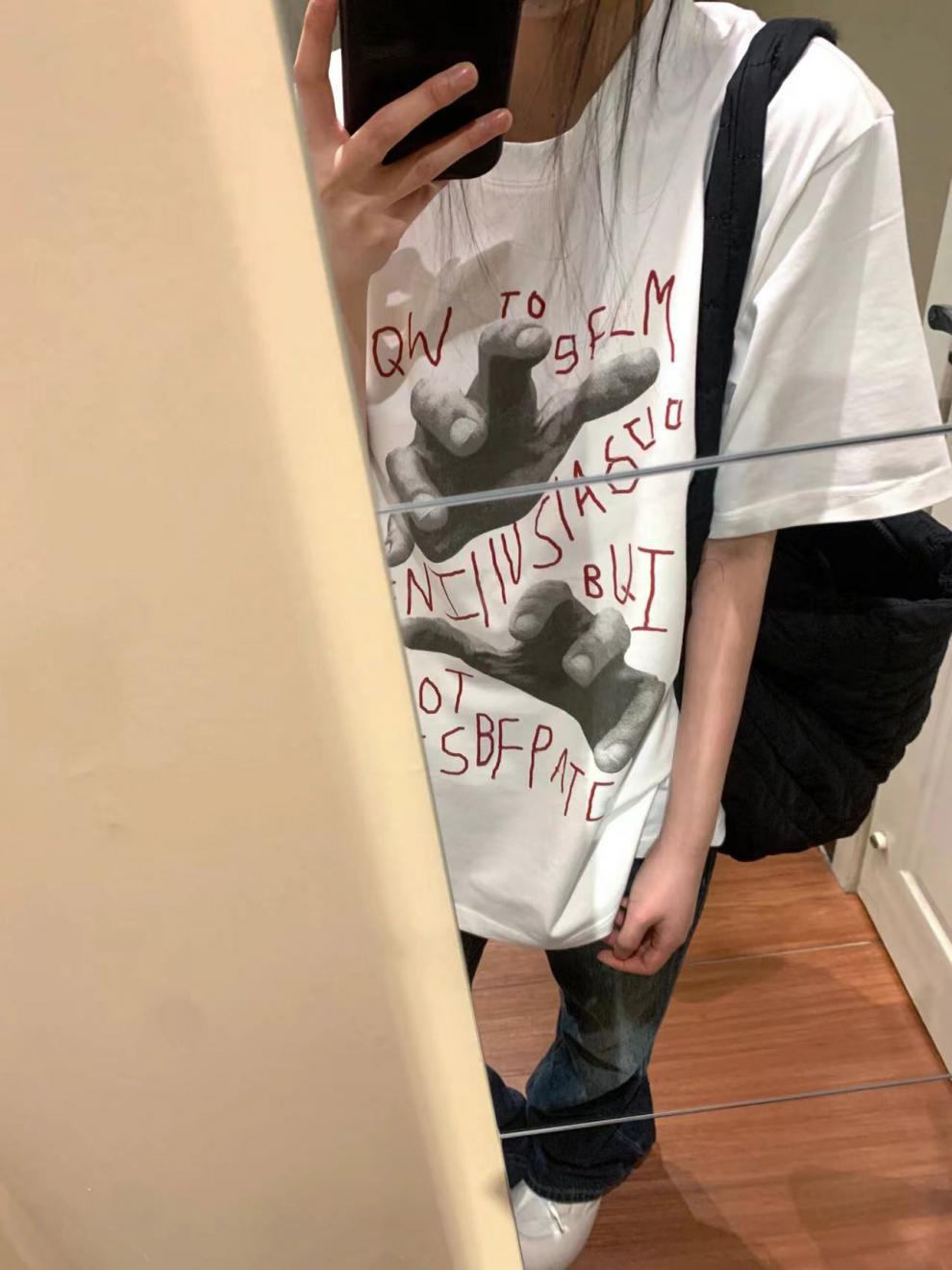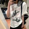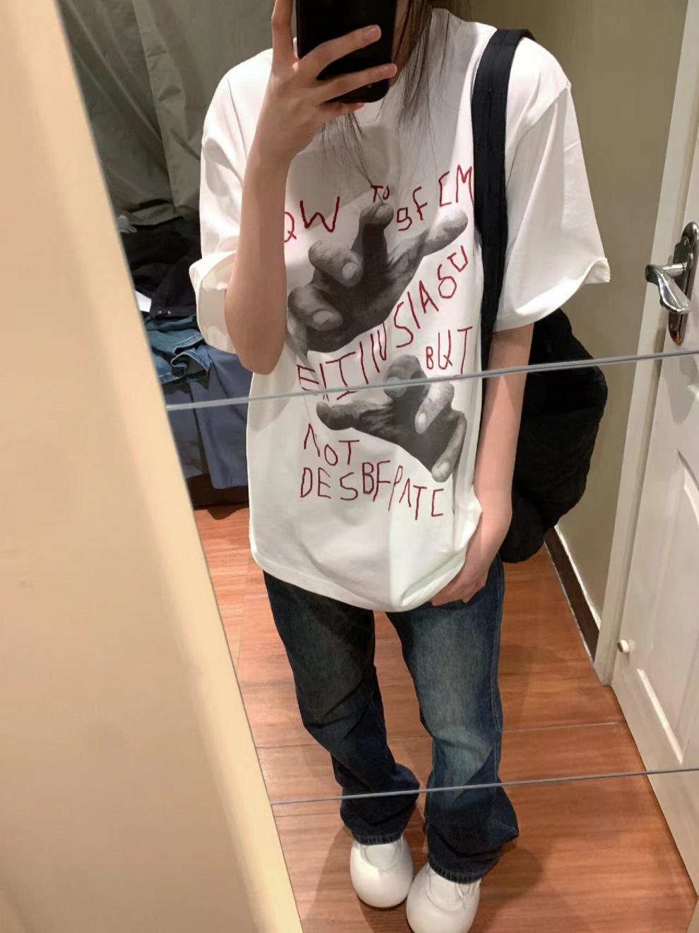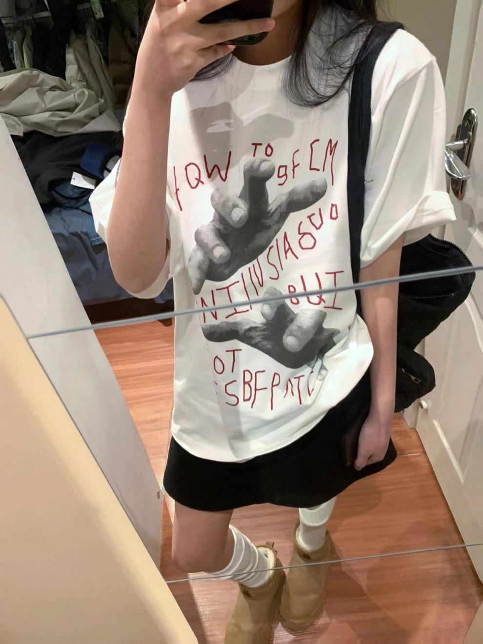 Camiseta de Manga Curta com Estampa de Letras de Dedo Retrô Americana para Meninas Verão Gola Redonda Solta Hip-Hop Casual Top
