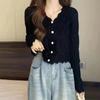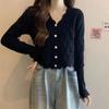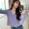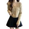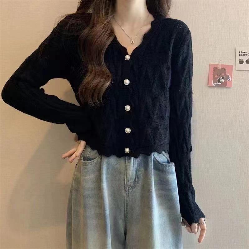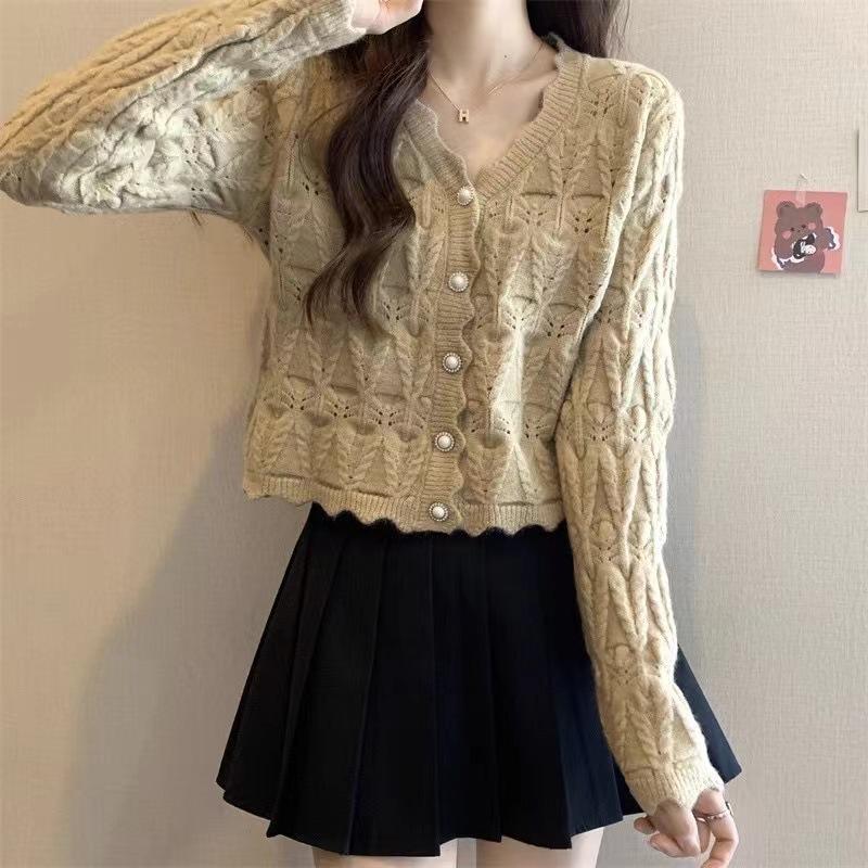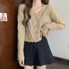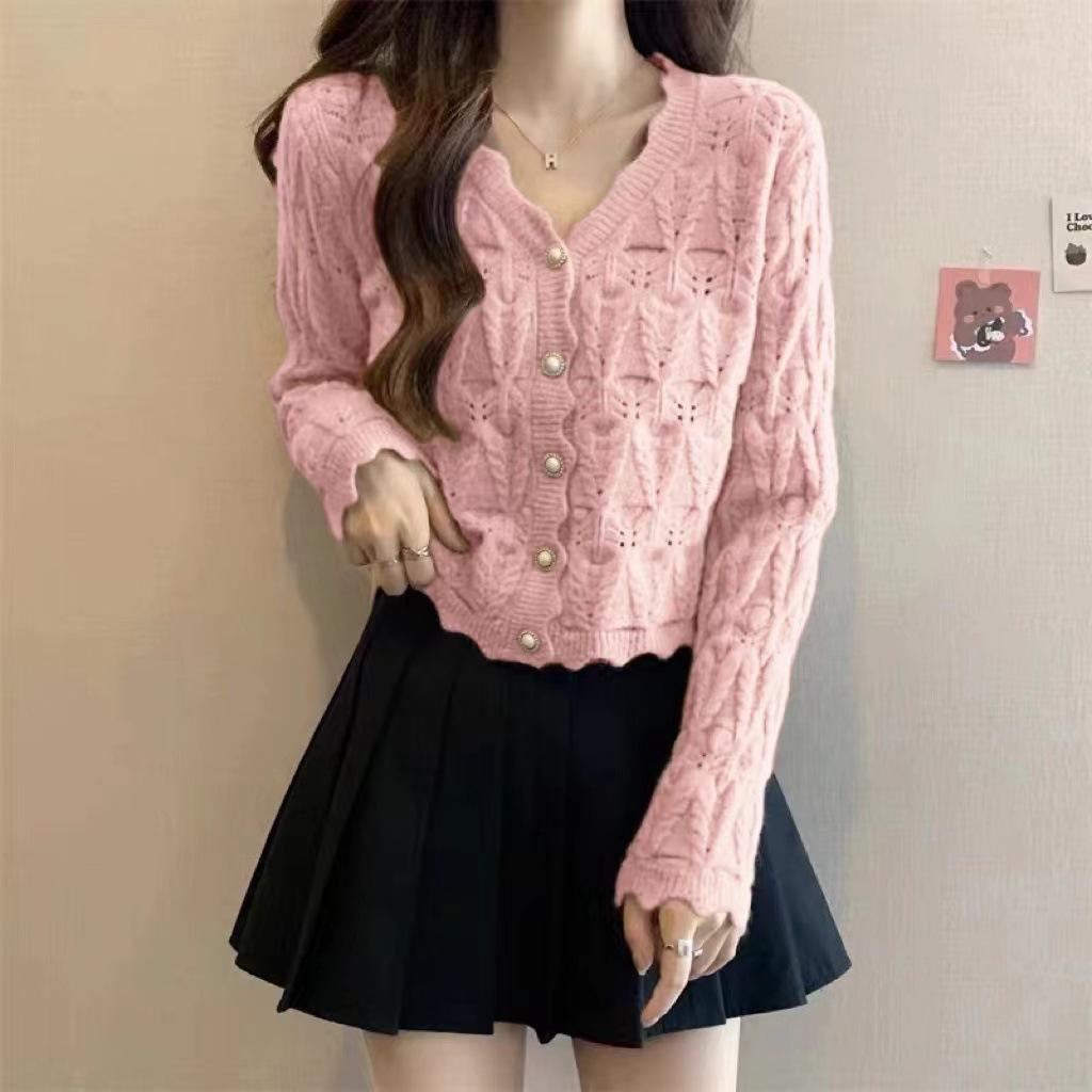 Cardigan Tricotado Feminino Novo Retrô Francês de Primavera e Outono com Decote V e Manga Longa com Borda Ondulada, Design Nicho, Top Curto