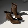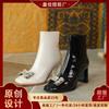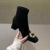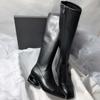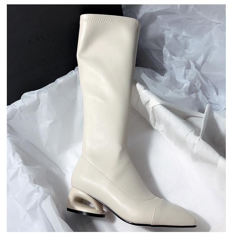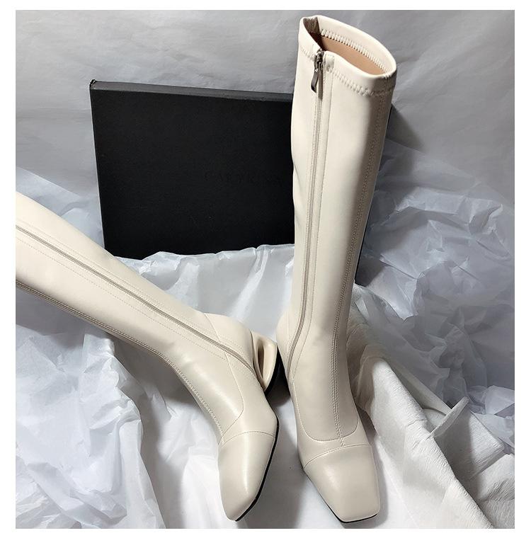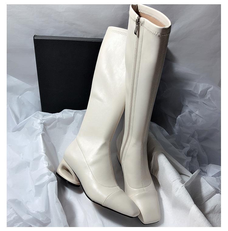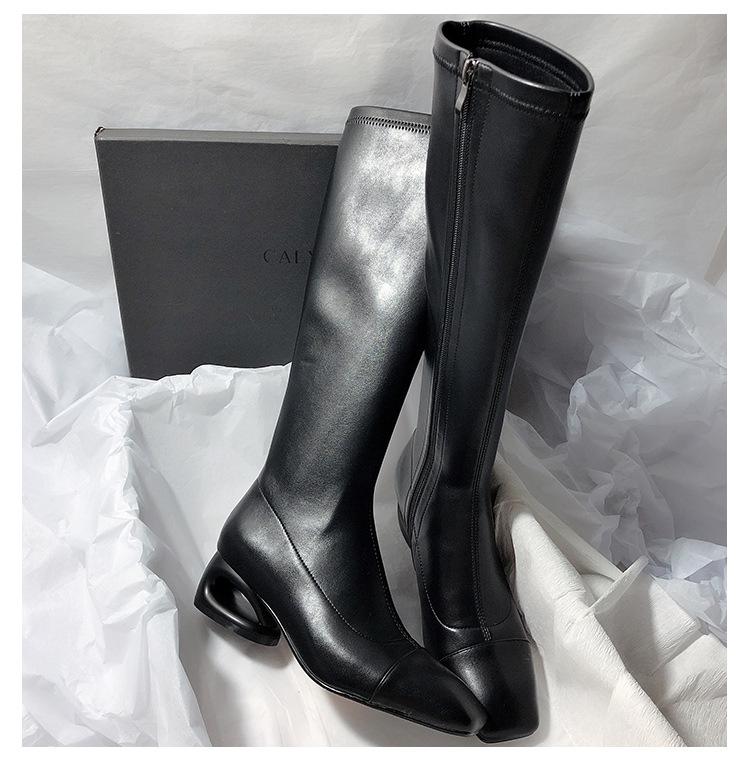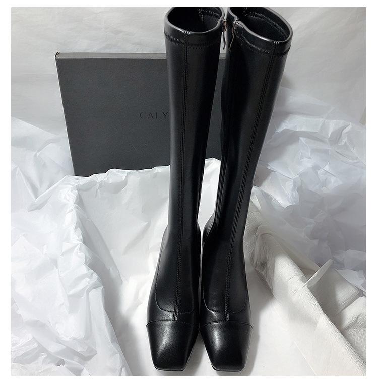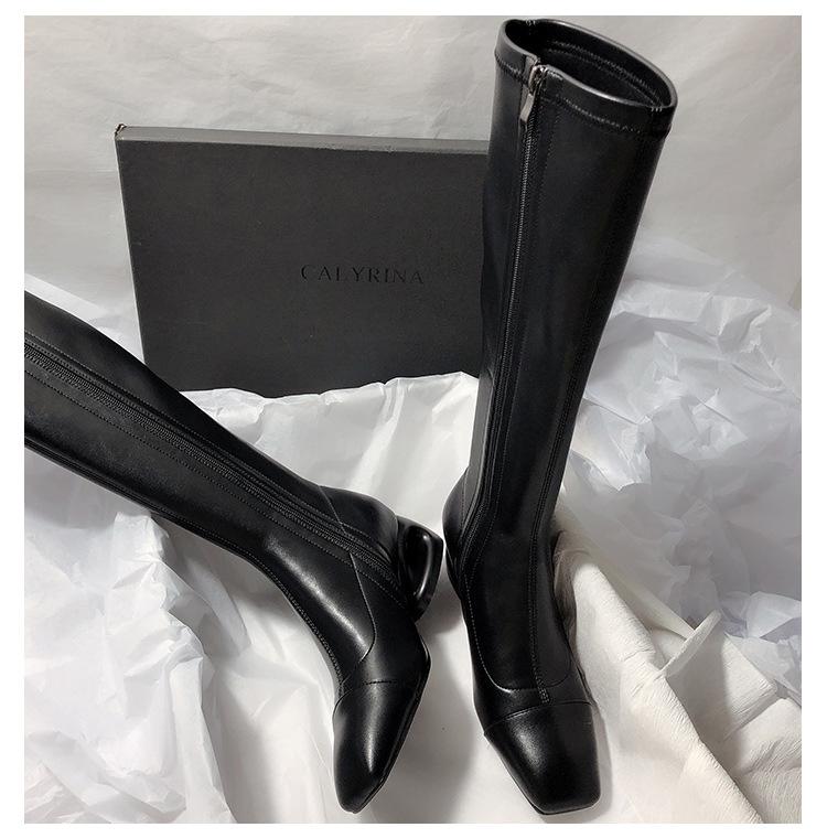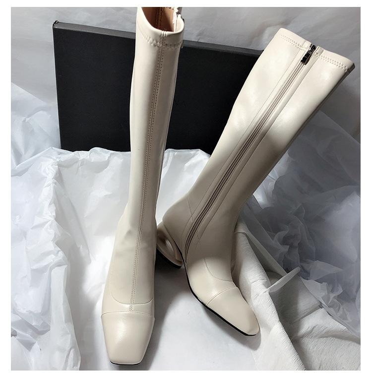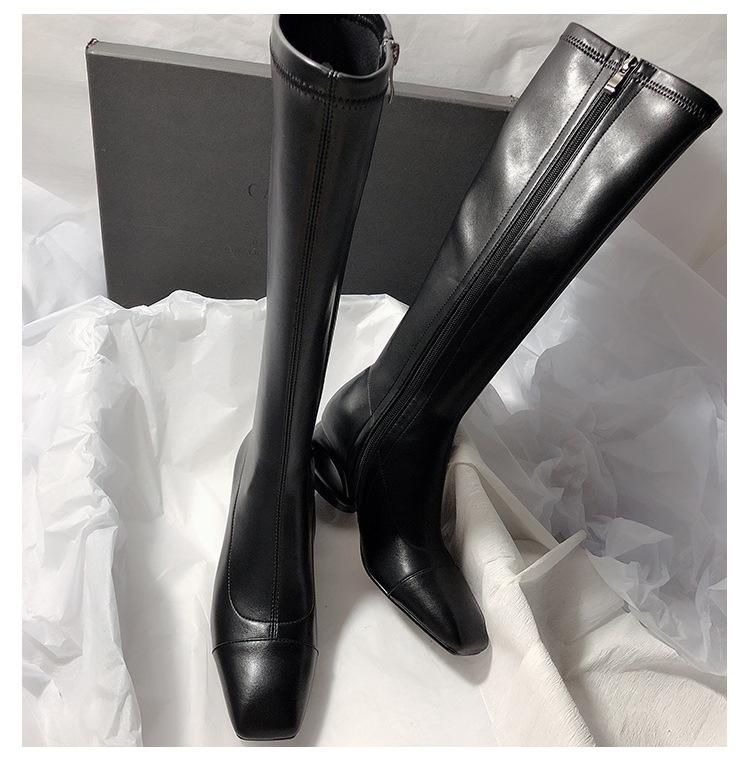 Botas Femininas Elegantes Versáteis de Salto Alto Grosso Vazadas com Bico Quadrado e Zíper Lateral até o Joelho