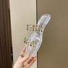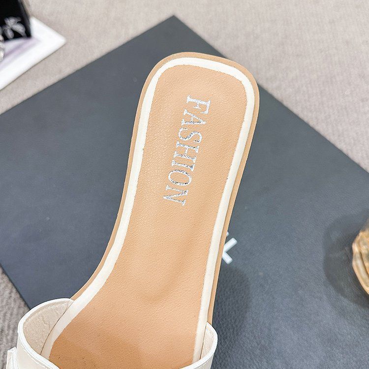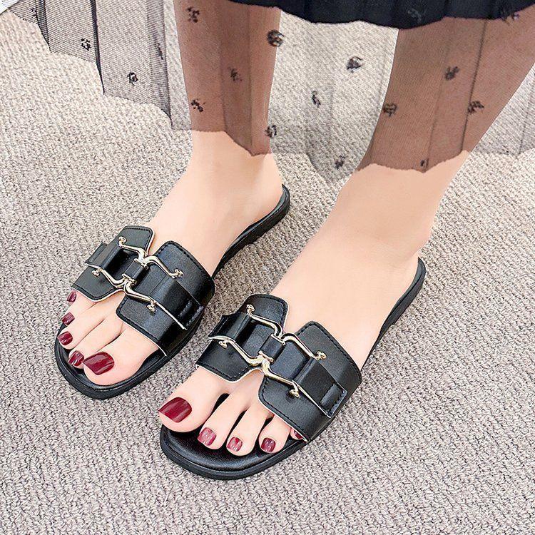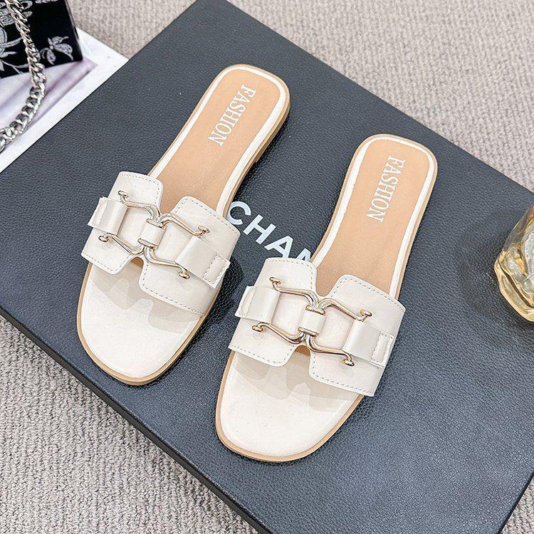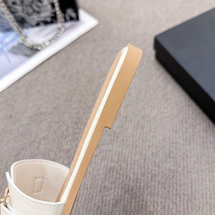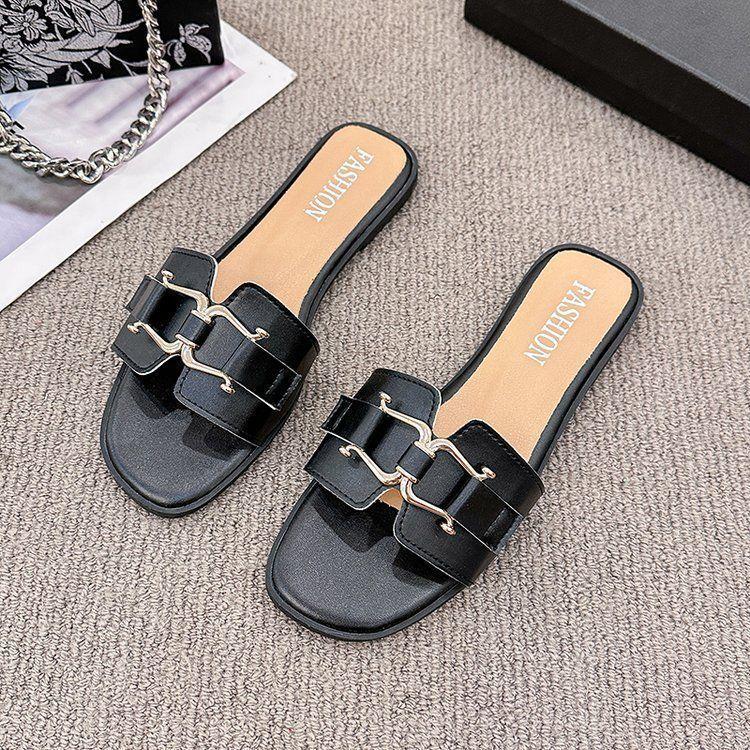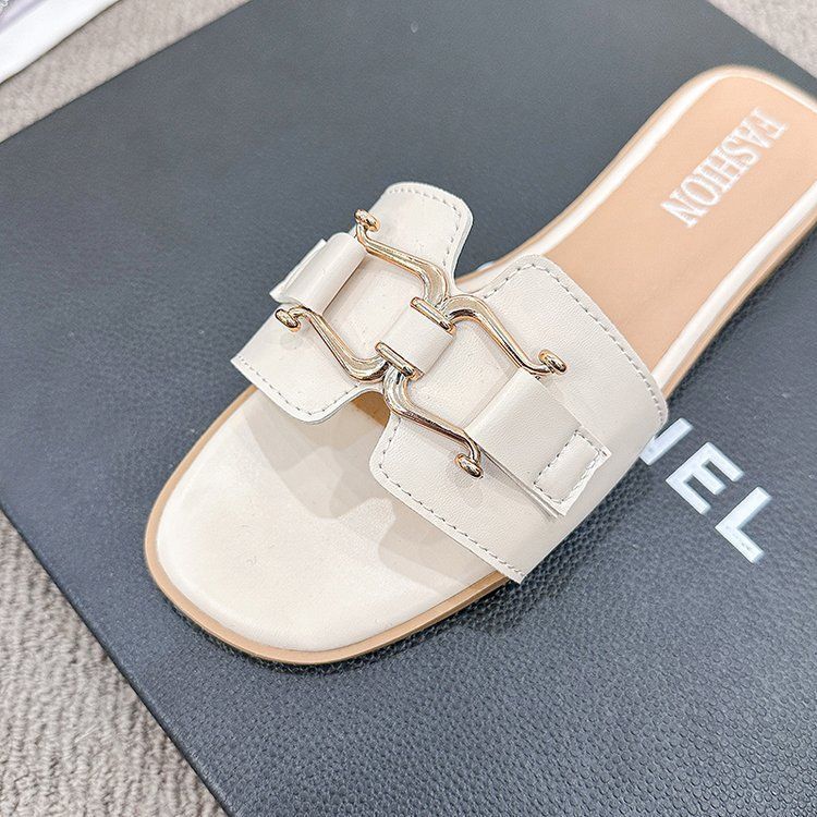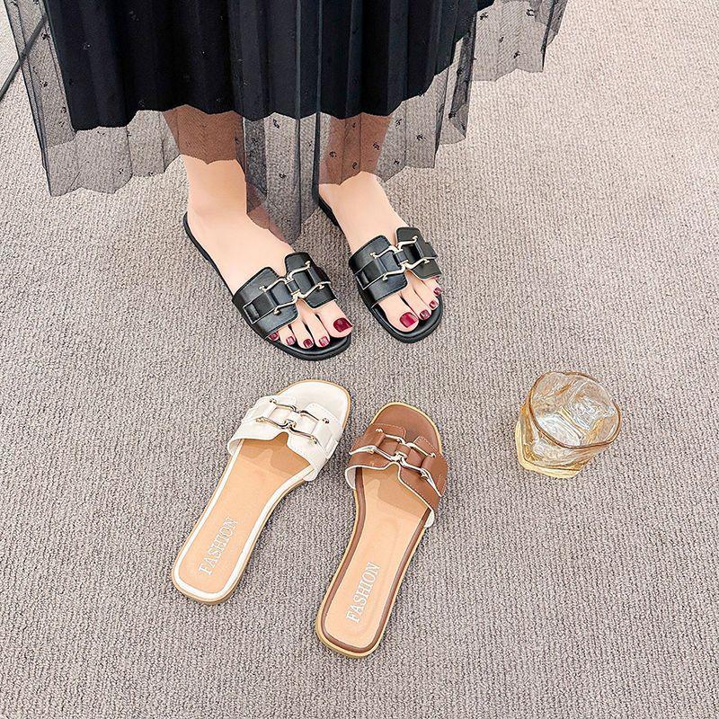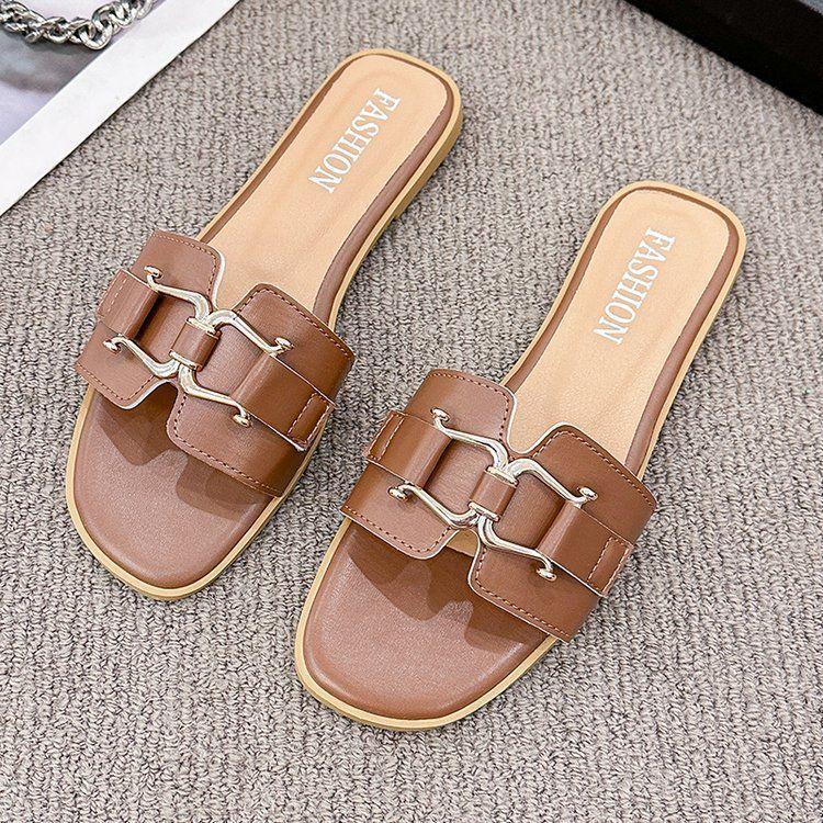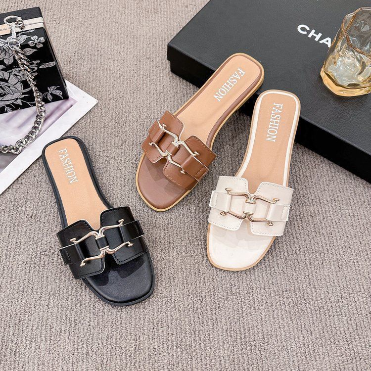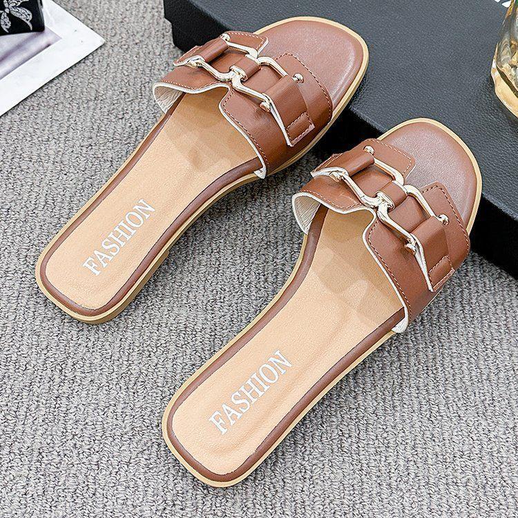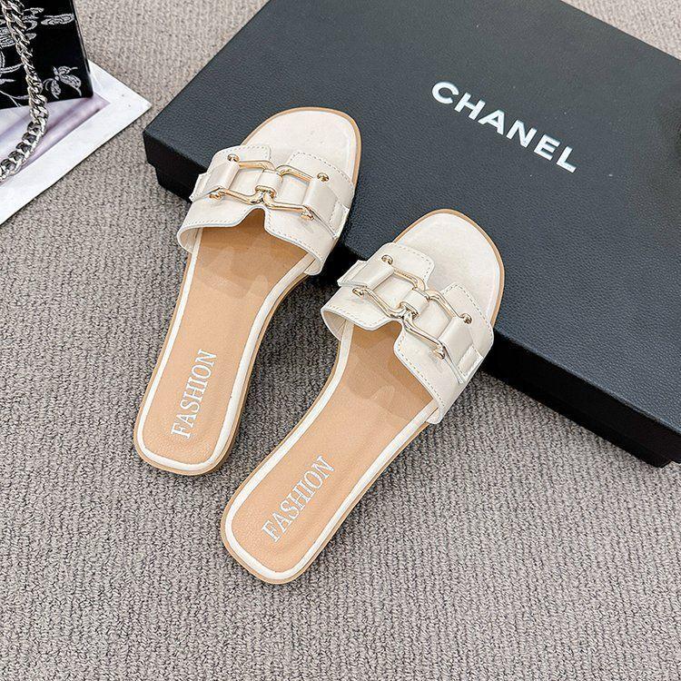 2025 Novos Sapatos de Verão Femininos Chinelos Femininos para Uso Externo Antiderrapantes Bico Quadrado Moda Fivela de Metal Chinelos Rasteiros