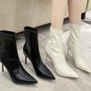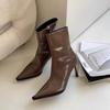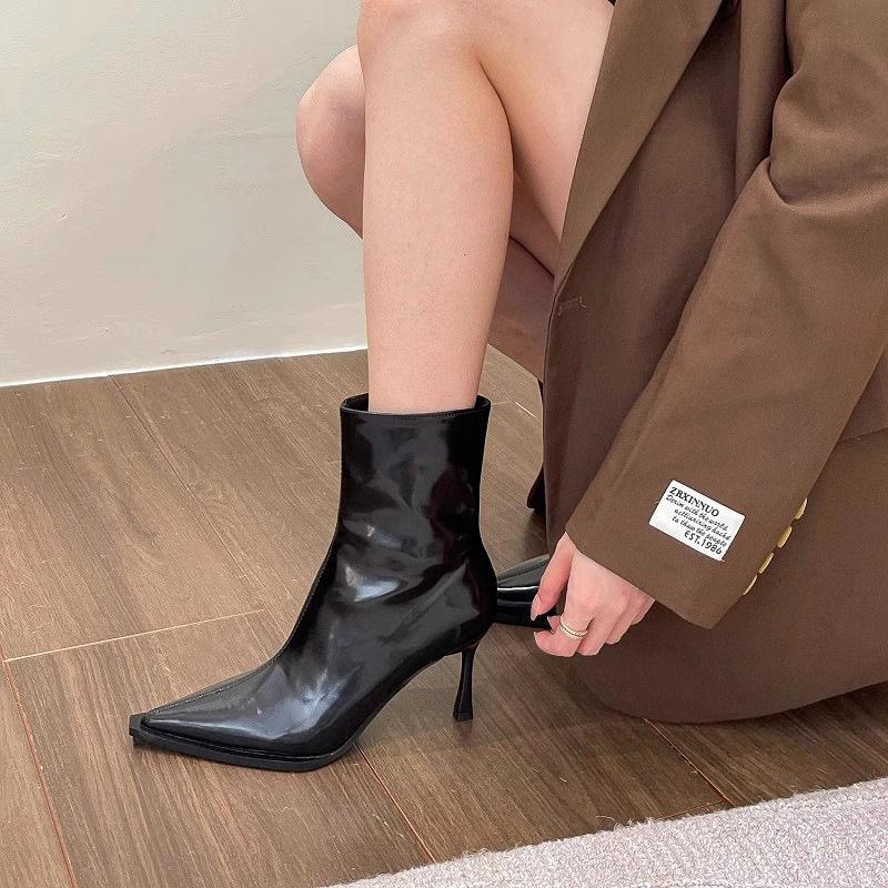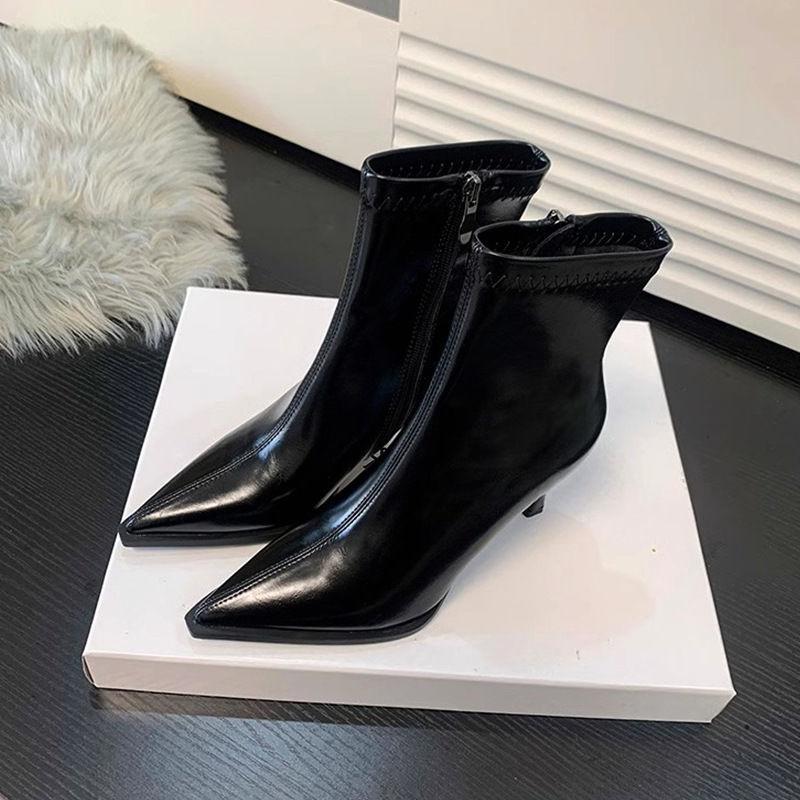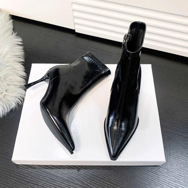 Botas Curtas Stiletto de Bico Fino Estilo Retrô Europeu e Americano 2024 Primavera & Outono Novo Elegante Salto Alto Couro Envernizado Botas Slim