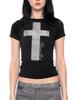 Camiseta Feminina Europeia e Americana de Verão Nova Quente Cruz Strass Ombro Caído Decote V Manga Curta, Camiseta Básica Solta para Primavera e Verão