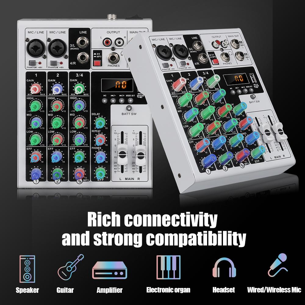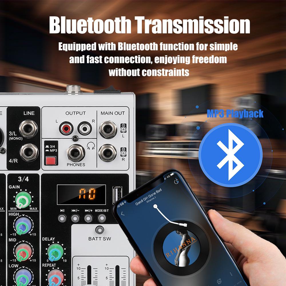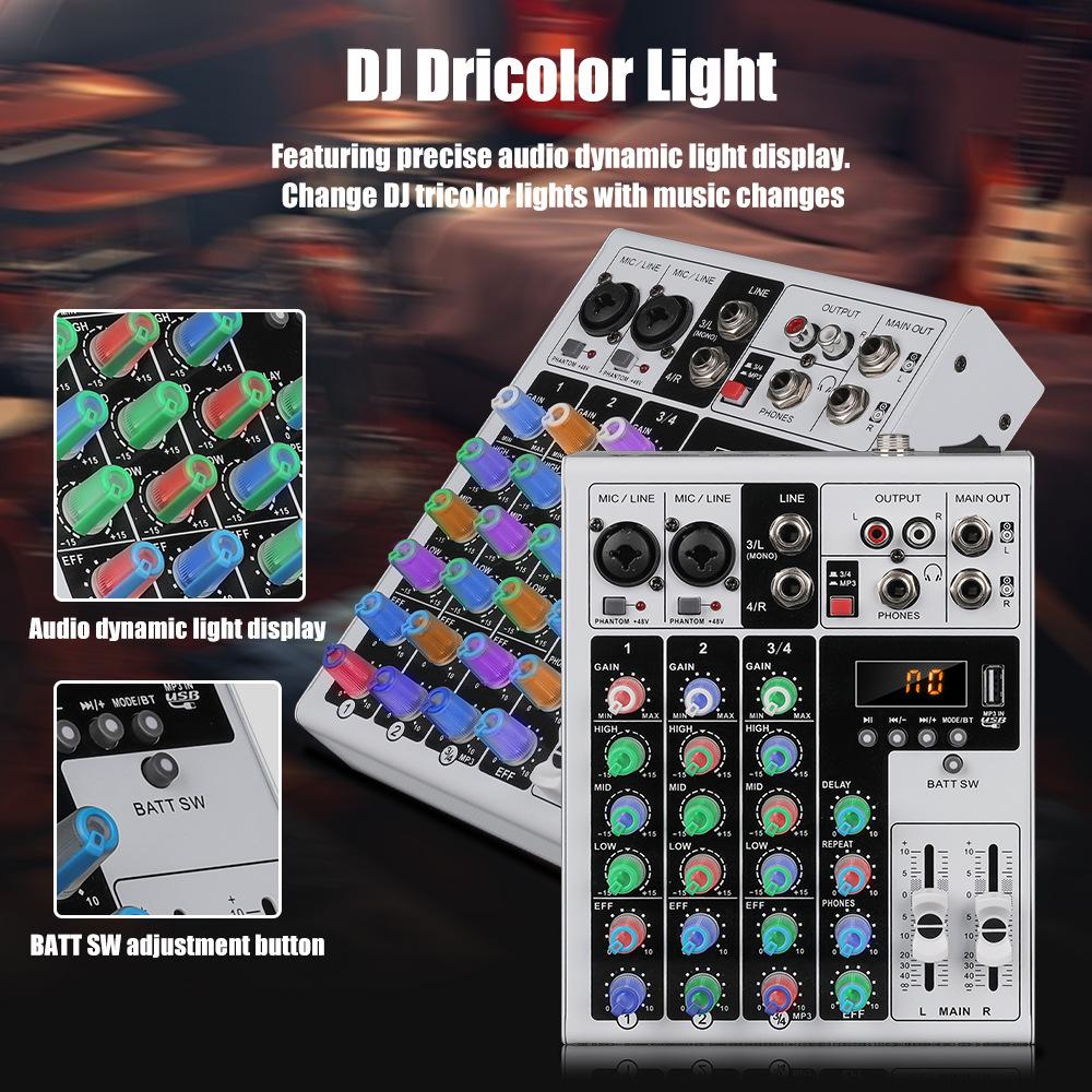 Mixer Bluetooth Pequeno com 4 Canais, Botão RGB, Efeito de Reverb, Microfone, Karaokê, Performance de Palco, Conferência