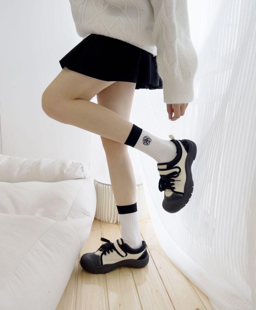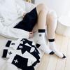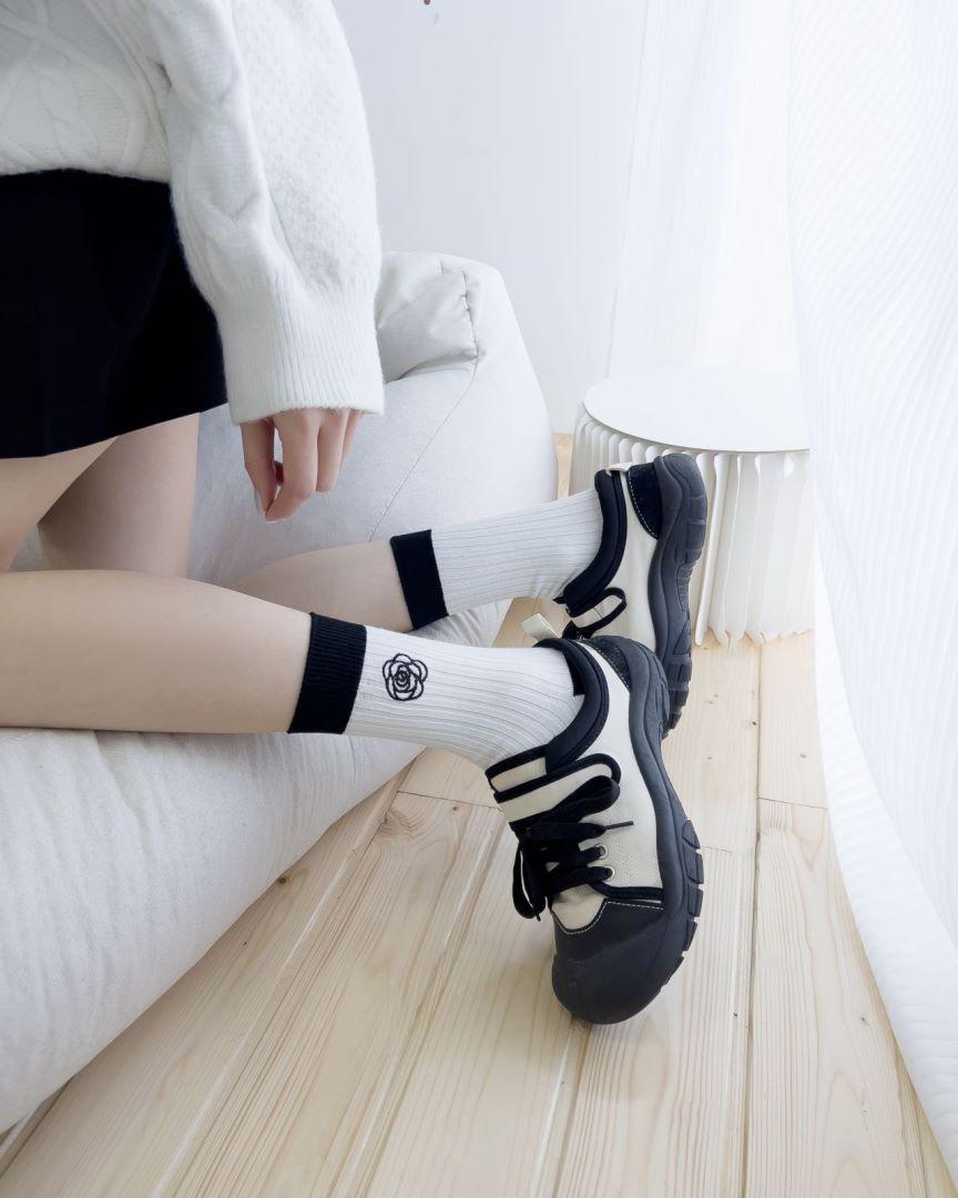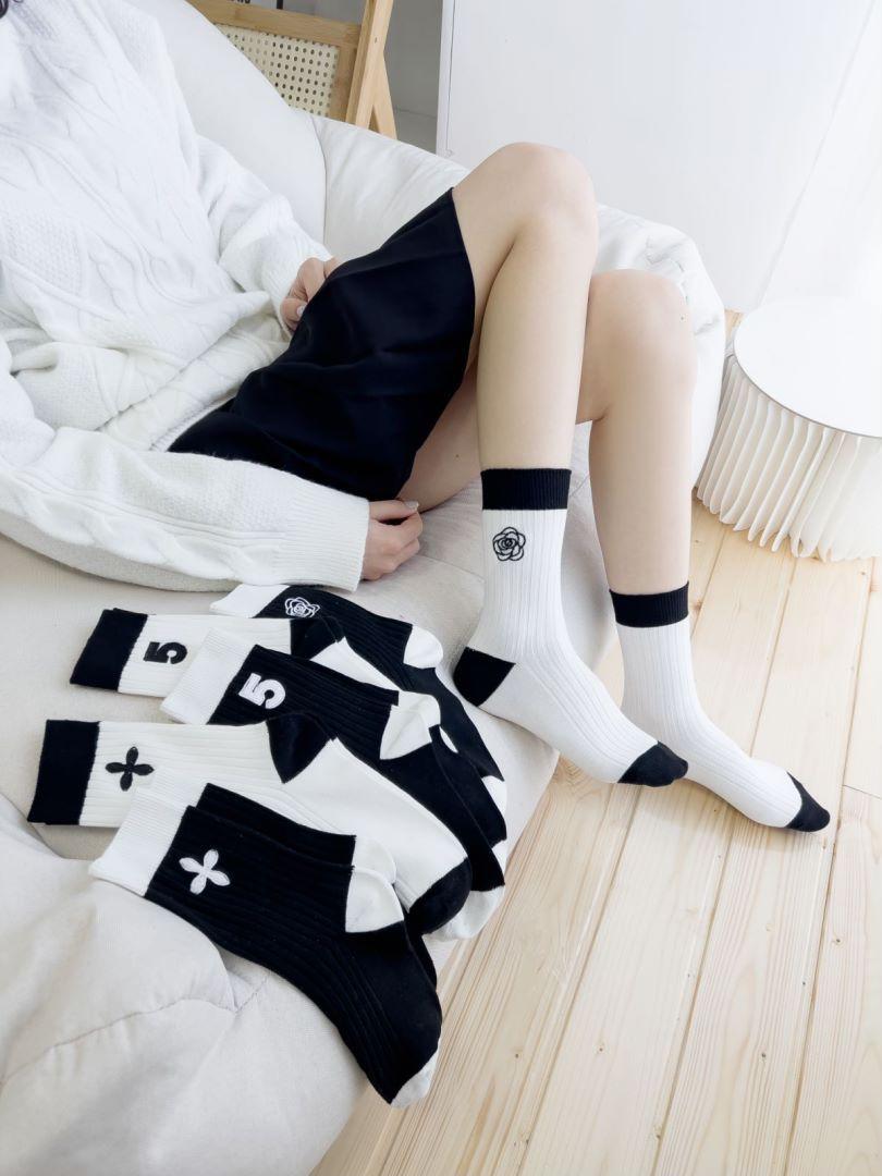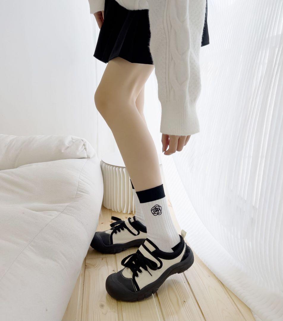 Meias de cano médio femininas bordadas com rosa japonesa, moda ins, meias simples pretas e brancas para garota JK, meias pretas e brancas atoalhadas