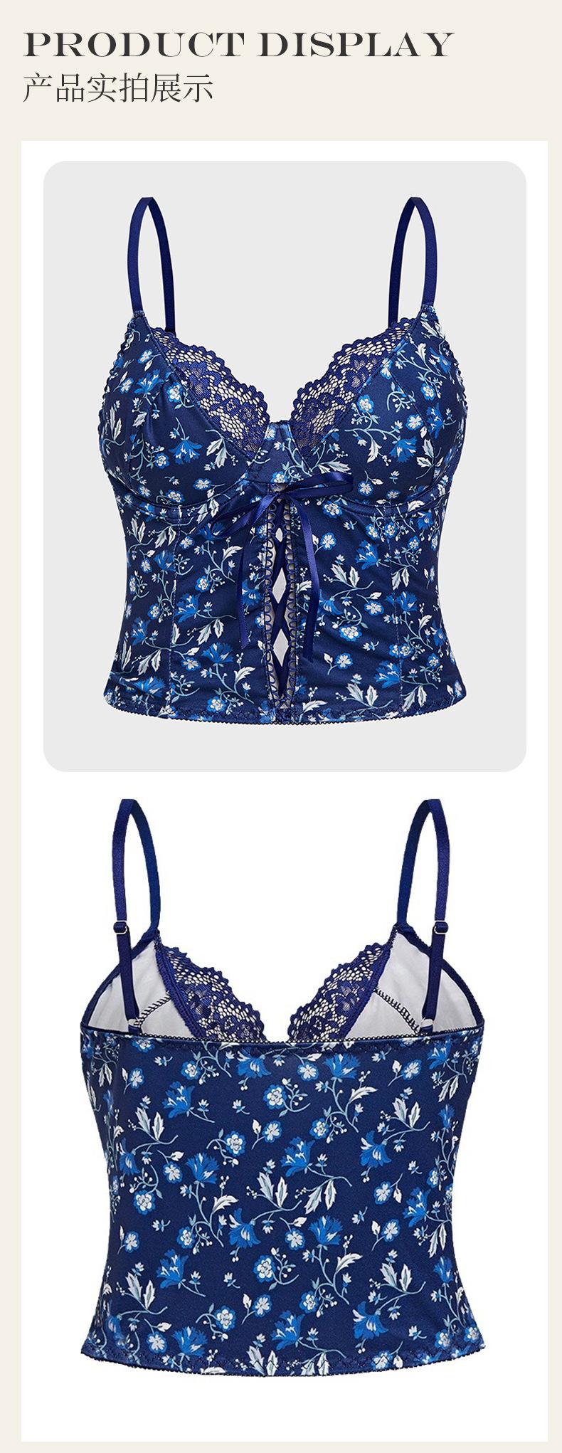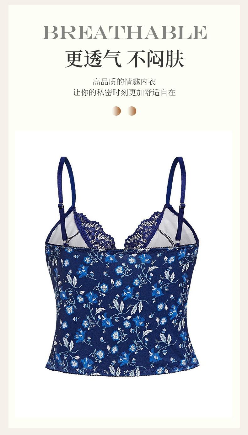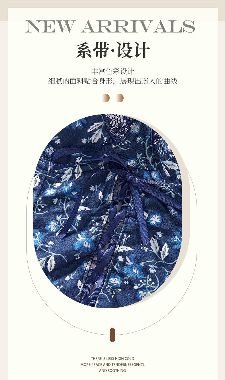 Europeu e Americano Transfronteiriço Azul Escuro Renda com Cadarço Malha Sexy Costas Roupa Íntima com Aro de Aço Top Cintura Justa Alça Estampada